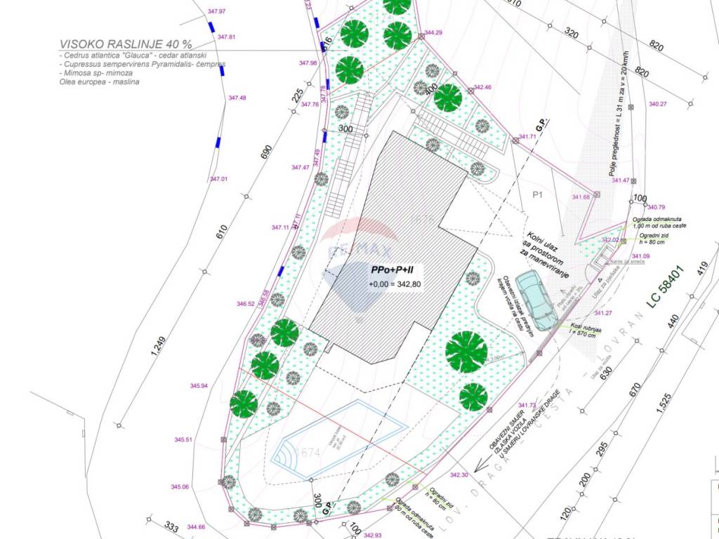 Teren je u blagom padu prema moru.Teren ima pravomoćnu građevinsku dozvolu za obiteljsku kuću s bazenom.
