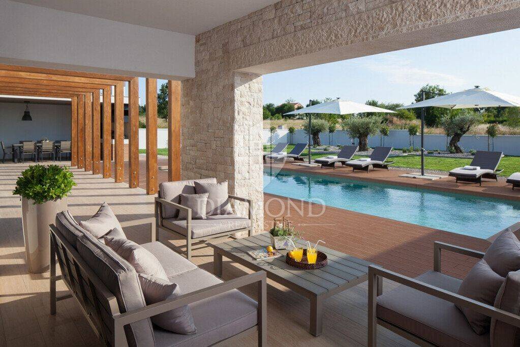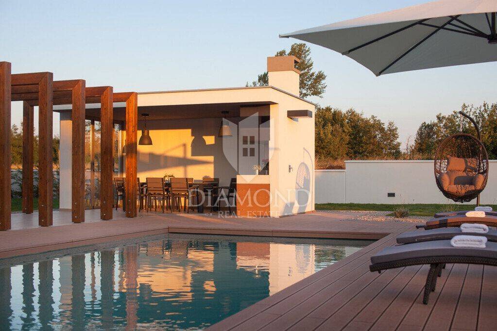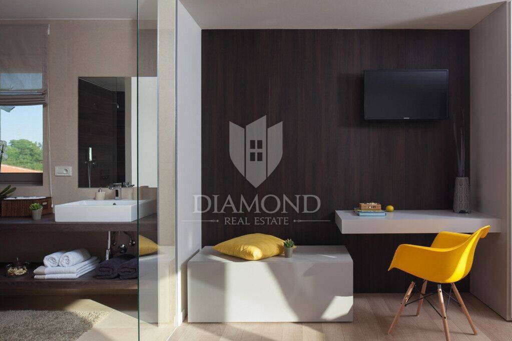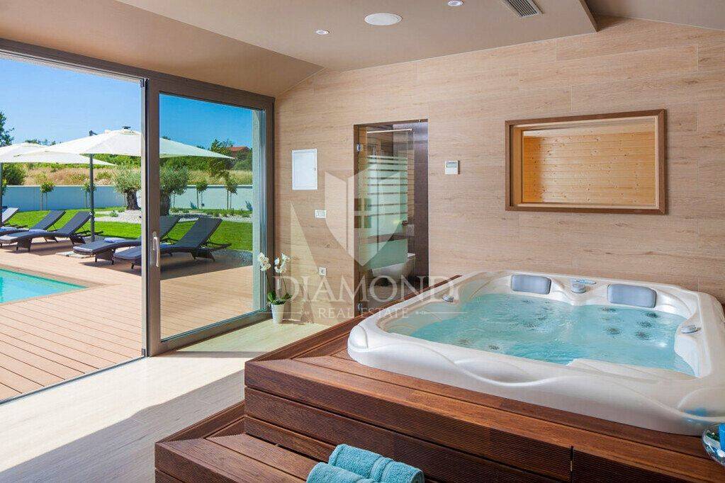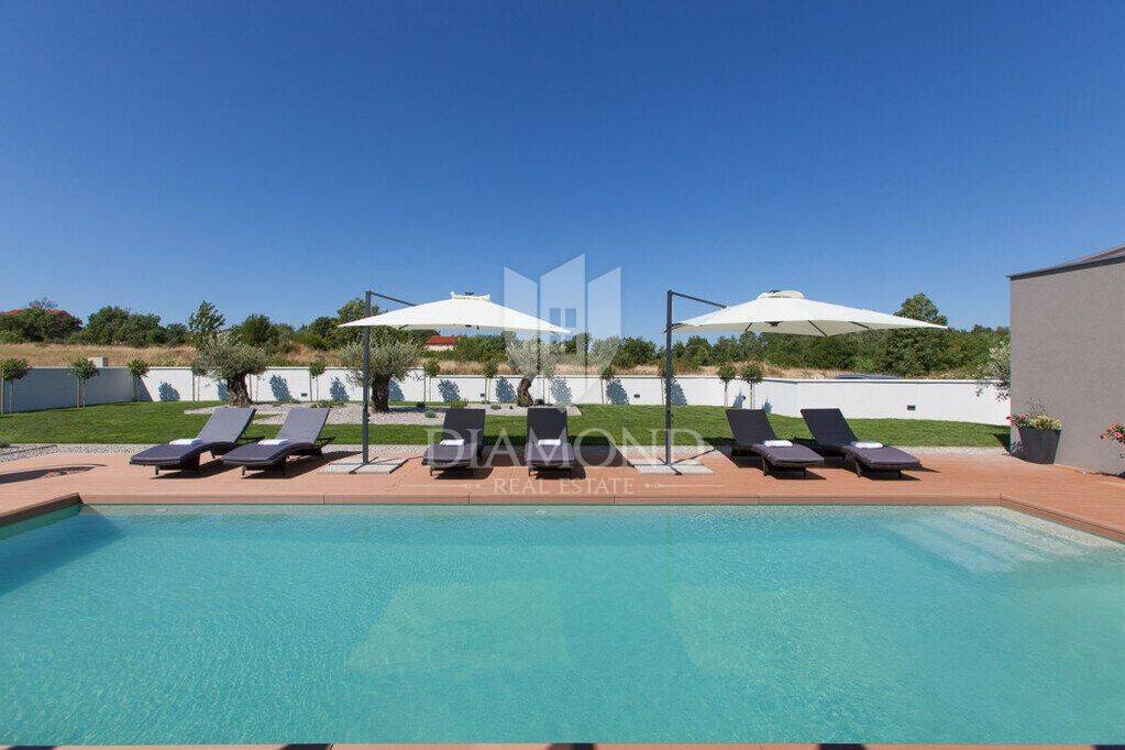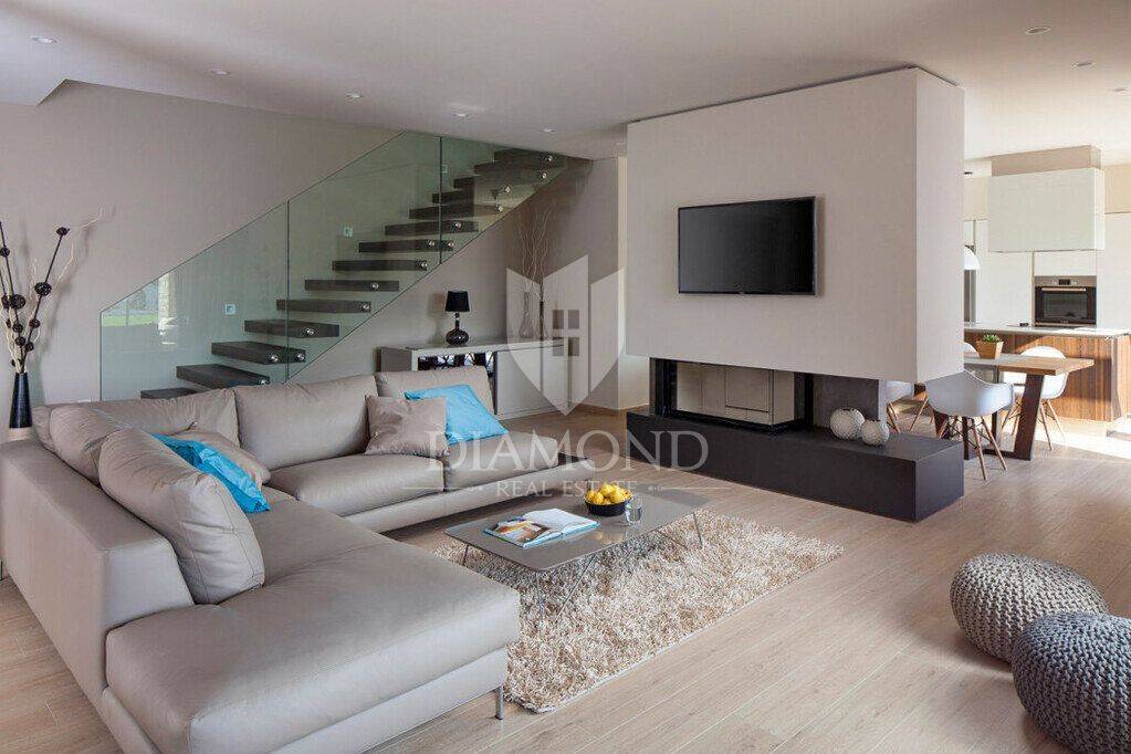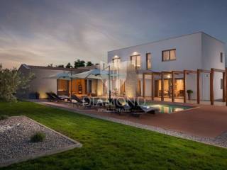 This beautiful villa is located in a small Istrian village, only 4 kilometers from the town of Labin and only 7 kilometers from the beautiful tourist town of Rabac. Villa of 220 square meters, consists of a modern kitchen with dining area, spacious living room with glass fireplace, toilet on the ground floor, and four bedrooms upstairs each with its own bathroom and terrace. The kitchen and living room open onto a covered terrace, where there is a space for socializing in the warm summer months, a summer kitchen and a large pool of 45 square meters. The villa also has a sauna, jacuzzi and children’s playroom. It is air conditioned, fully and modernly furnished with selected and quality furniture, in a quiet and idyllic location, both for living and for tourist purposes.