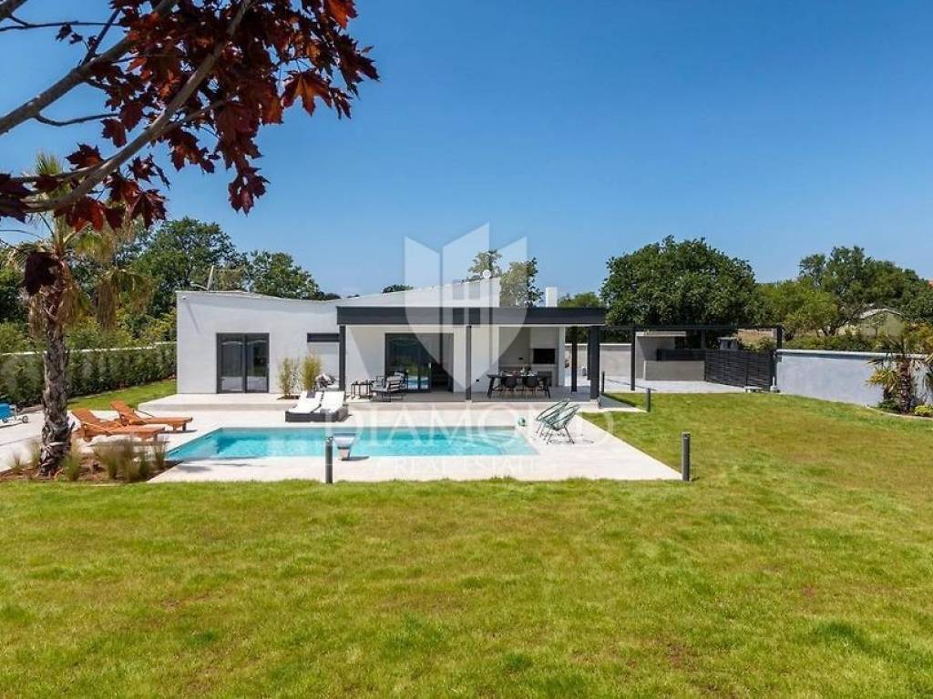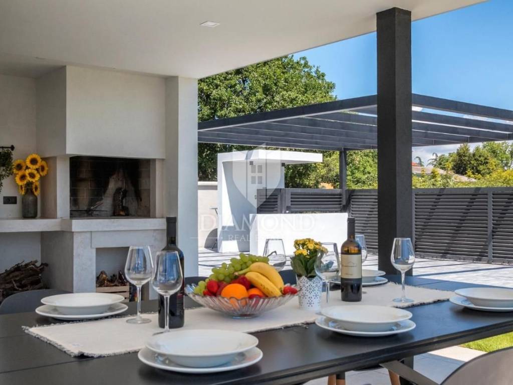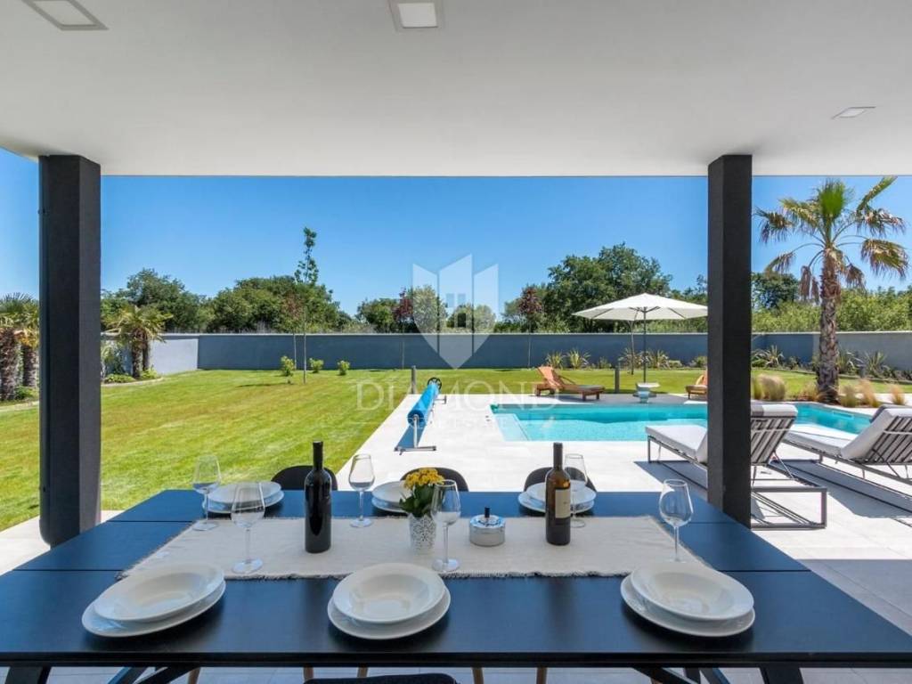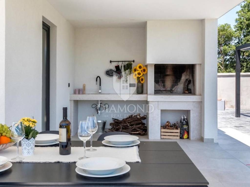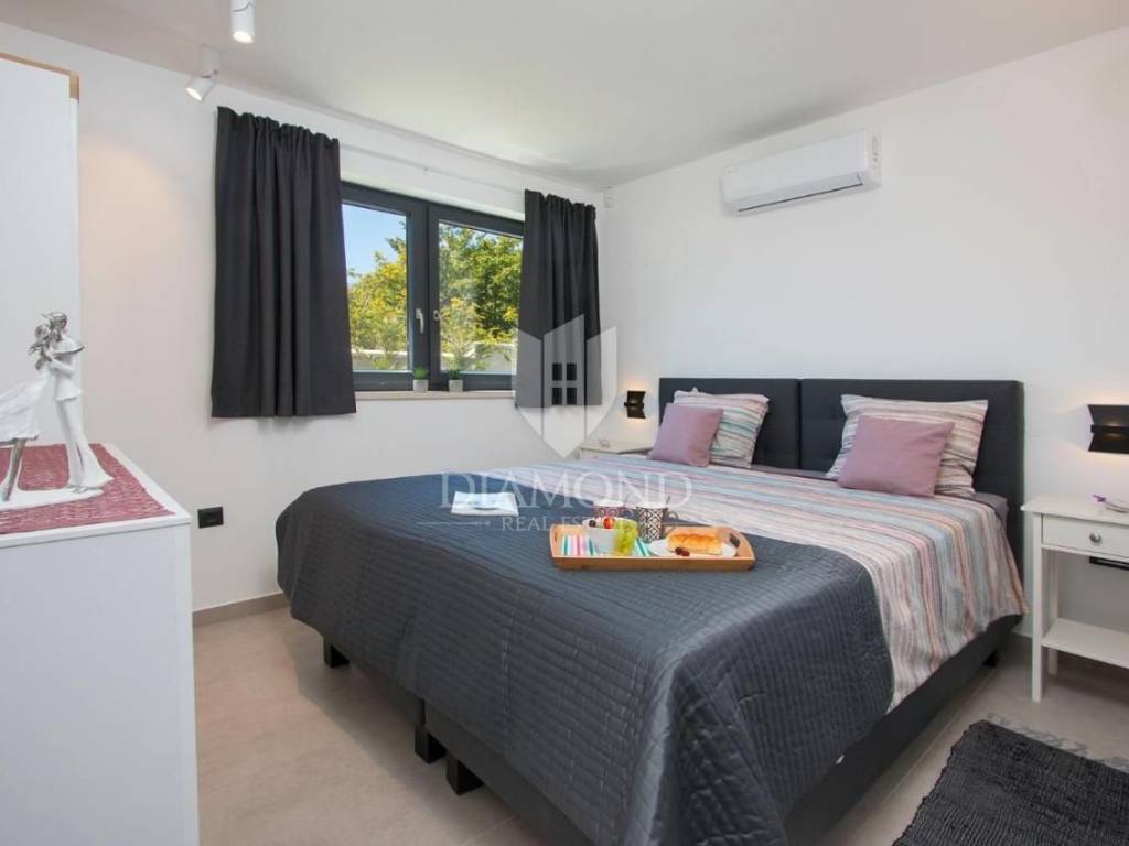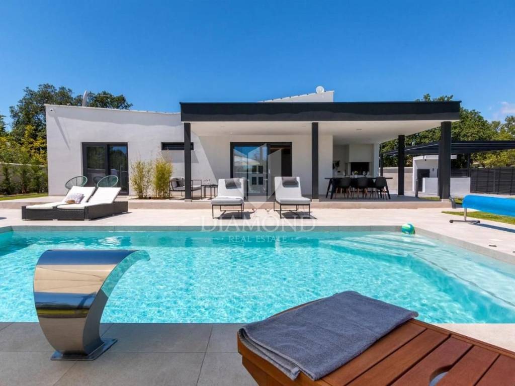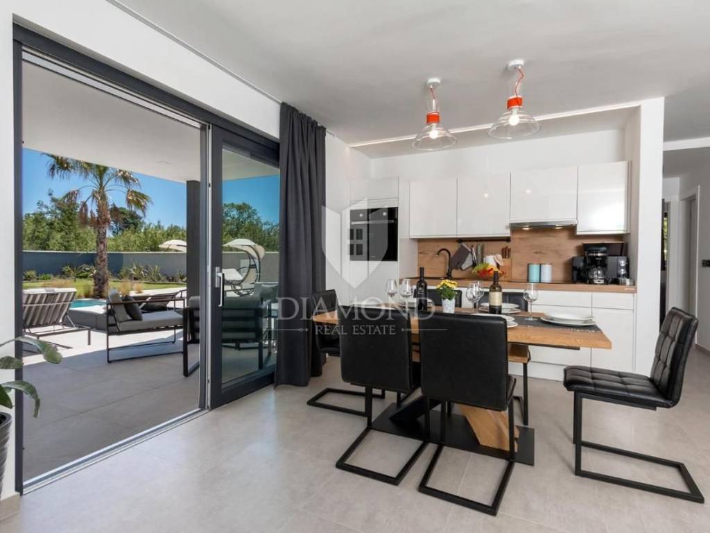 Liznjan, surroundings, we are selling a beautiful holiday house with a modern design. Located just a few kilometers from the first beach and all the necessary amenities for a luxurious vacation, there is this modern design single-family house. The total square footage of 70 m2 includes a comfortable living room with a dining room, a fully equipped kitchen, two bedrooms and two bathrooms. The house has air conditioners installed in all rooms, and electric underfloor heating throughout the entire property and is equipped with modern and functional furniture. The living area is connected to the outdoor covered terrace where there is a summer kitchen and a dining area with a view of the pool and garden. The spacious garden covers 1118 m2, it is completely fenced and decorated and maintained. The crown of the garden is certainly the beautiful heated pool of 32m2 with salt water. Covered parking and beautiful green areas are provided for additional facilities such as a children's playground. The house is located in a secluded area and is well connected by traffic with a well-maintained access road. Within a radius of 5 kilometers, there are all the necessary amenities such as restaurants, shops, cafes, and the first beach is only 4 kilometers away. Pula, the capital of tourist attractions, is 8 kilometers away. The property has a well-established tourist rental business, which the new owner has the option to take over or keep this beautiful property for himself and use it as his own holiday home to escape from everyday life in the beautiful green and blue Istria.