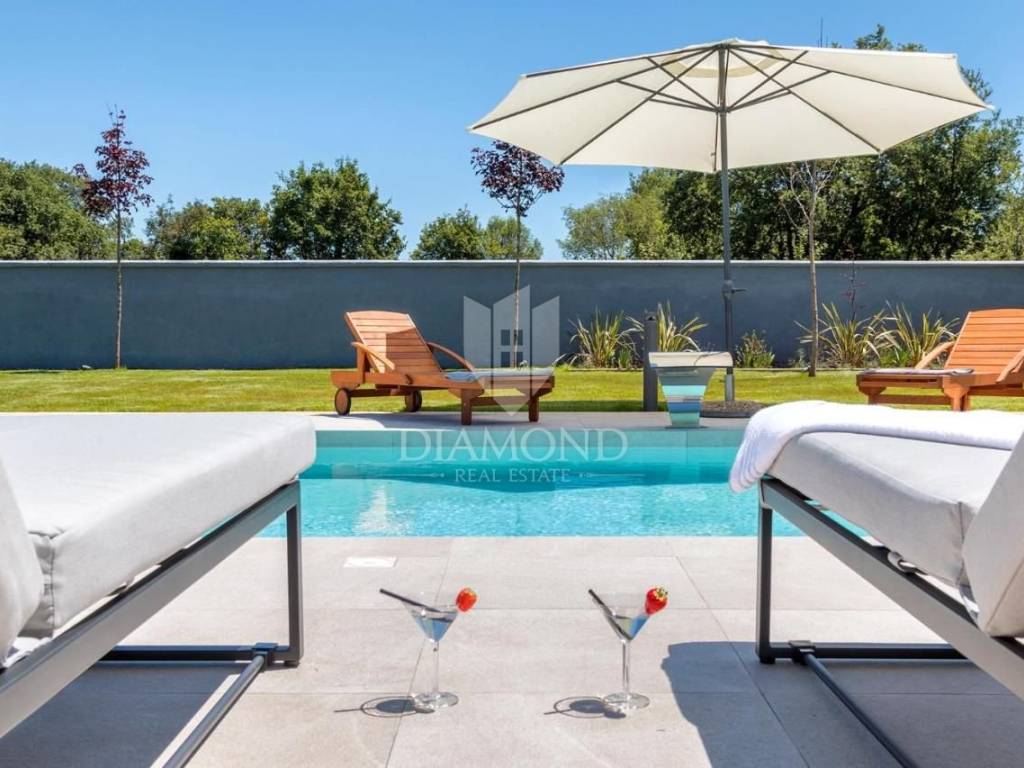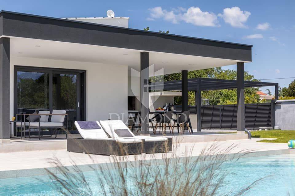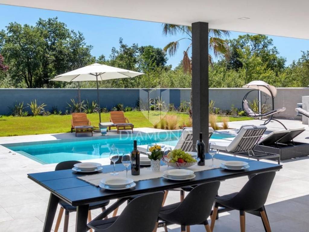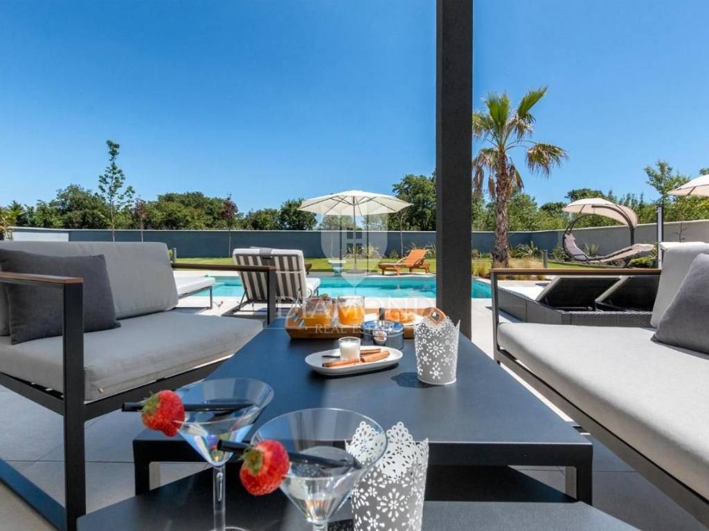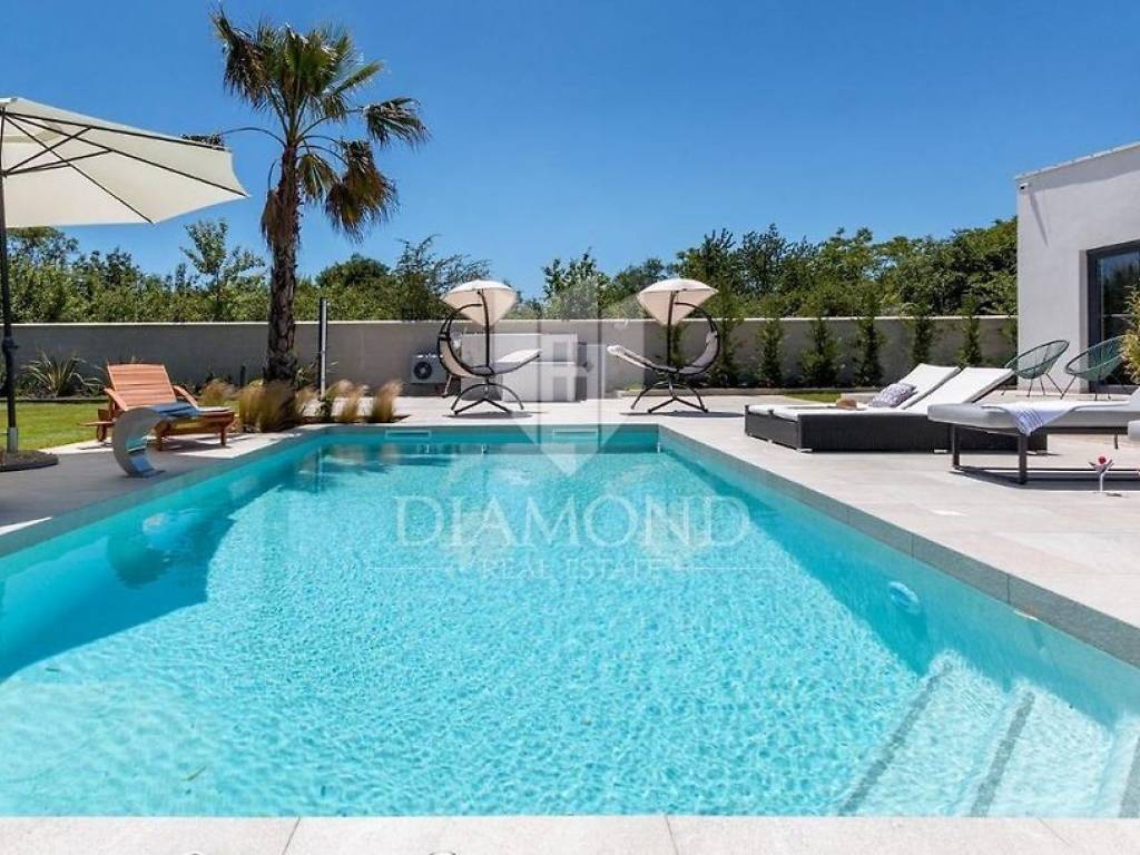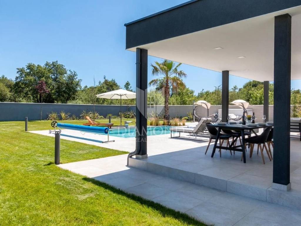 Liznjan, surroundings, we are selling a beautiful holiday house with a modern design. Located just a few kilometers from the first beach and all the necessary amenities for a luxurious vacation, there is this modern design single-family house. The total square footage of 70 m2 includes a comfortable living room with a dining room, a fully equipped kitchen, two bedrooms and two bathrooms. The house has air conditioners installed in all rooms, and electric underfloor heating throughout the entire property and is equipped with modern and functional furniture. The living area is connected to the outdoor covered terrace where there is a summer kitchen and a dining area with a view of the pool and garden. The spacious garden covers 1118 m2, it is completely fenced and decorated and maintained. The crown of the garden is certainly the beautiful heated pool of 32m2 with salt water. Covered parking and beautiful green areas are provided for additional facilities such as a children's playground. The house is located in a secluded area and is well connected by traffic with a well-maintained access road. Within a radius of 5 kilometers, there are all the necessary amenities such as restaurants, shops, cafes, and the first beach is only 4 kilometers away. Pula, the capital of tourist attractions, is 8 kilometers away. The property has a well-established tourist rental business, which the new owner has the option to take over or keep this beautiful property for himself and use it as his own holiday home to escape from everyday life in the beautiful green and blue Istria.