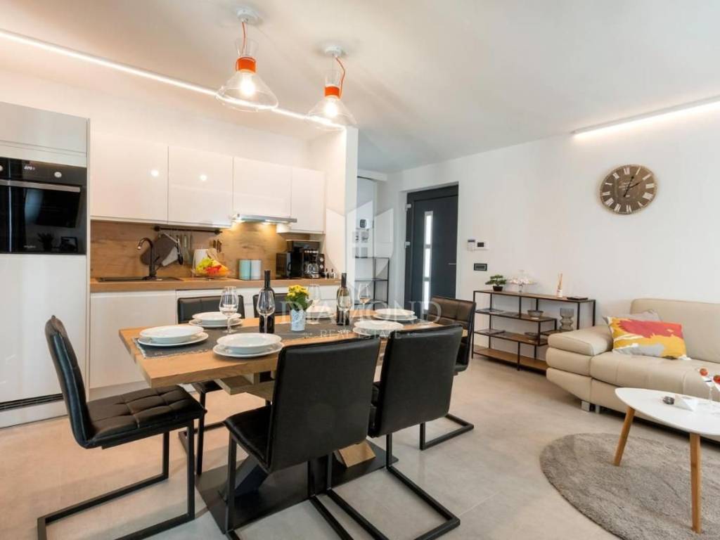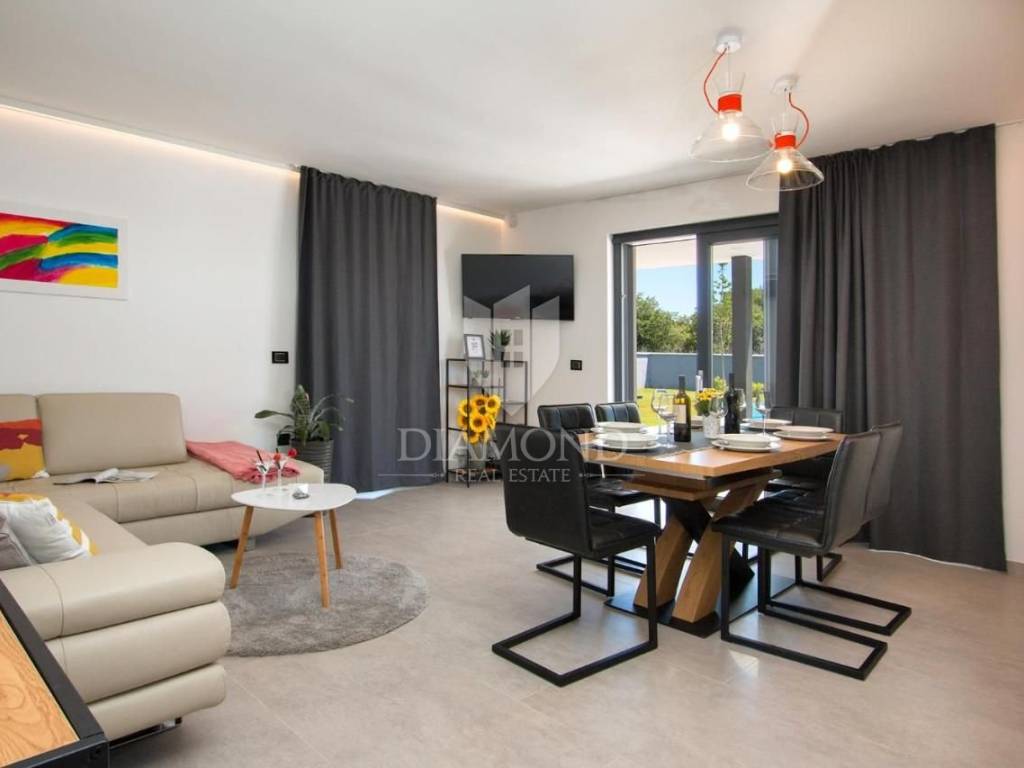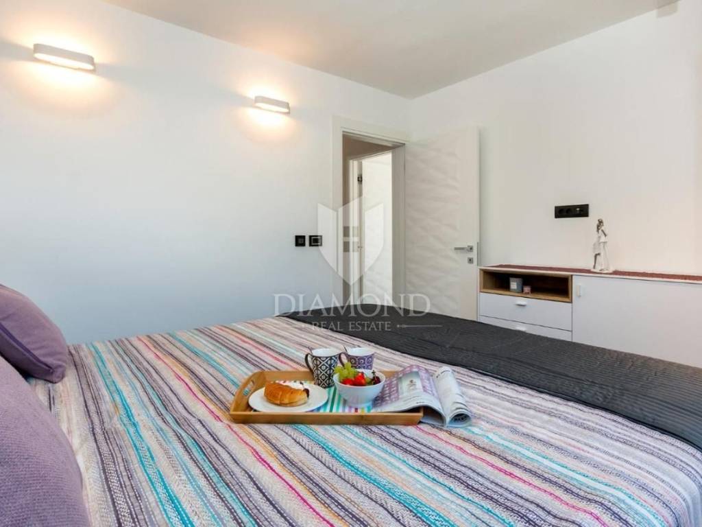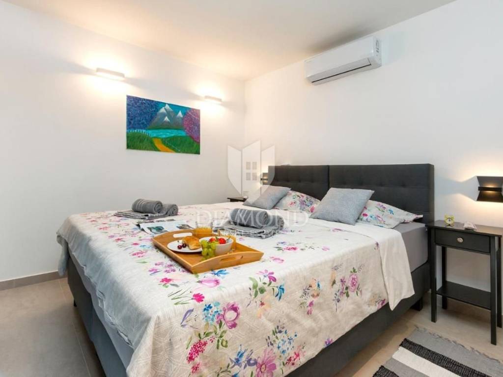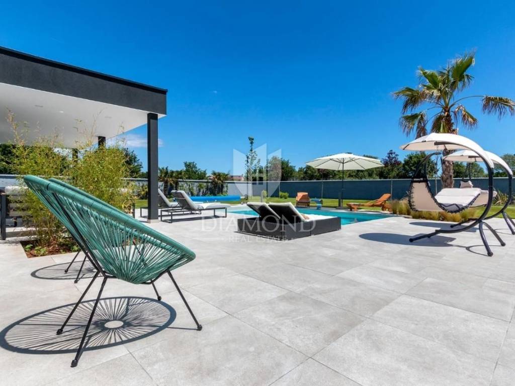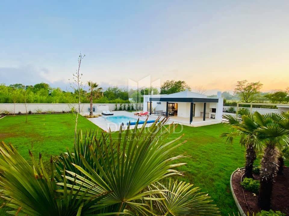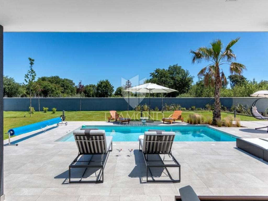 Liznjan, surroundings, we are selling a beautiful holiday house with a modern design. Located just a few kilometers from the first beach and all the necessary amenities for a luxurious vacation, there is this modern design single-family house. The total square footage of 70 m2 includes a comfortable living room with a dining room, a fully equipped kitchen, two bedrooms and two bathrooms. The house has air conditioners installed in all rooms, and electric underfloor heating throughout the entire property and is equipped with modern and functional furniture. The living area is connected to the outdoor covered terrace where there is a summer kitchen and a dining area with a view of the pool and garden. The spacious garden covers 1118 m2, it is completely fenced and decorated and maintained. The crown of the garden is certainly the beautiful heated pool of 32m2 with salt water. Covered parking and beautiful green areas are provided for additional facilities such as a children's playground. The house is located in a secluded area and is well connected by traffic with a well-maintained access road. Within a radius of 5 kilometers, there are all the necessary amenities such as restaurants, shops, cafes, and the first beach is only 4 kilometers away. Pula, the capital of tourist attractions, is 8 kilometers away. The property has a well-established tourist rental business, which the new owner has the option to take over or keep this beautiful property for himself and use it as his own holiday home to escape from everyday life in the beautiful green and blue Istria.