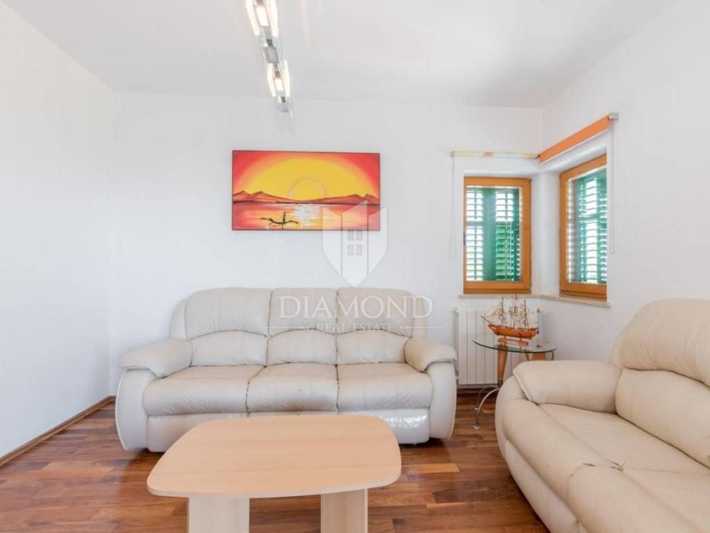 The ground floor includes an apartment with a hallway, kitchen and dining room, a spacious living room, two bedrooms, a bathroom, a storage room and a covered terrace with an enchanting view of the sea. On the first floor there is another apartment with an entrance hall, hallway, bathroom, bedroom and living room with kitchen and terrace. The house is equipped with oil central heating and air conditioning.