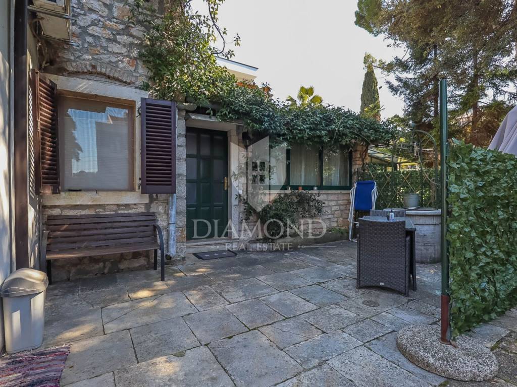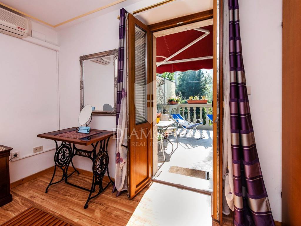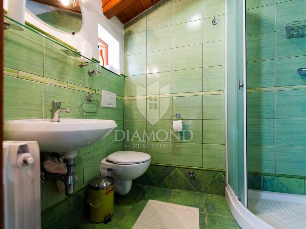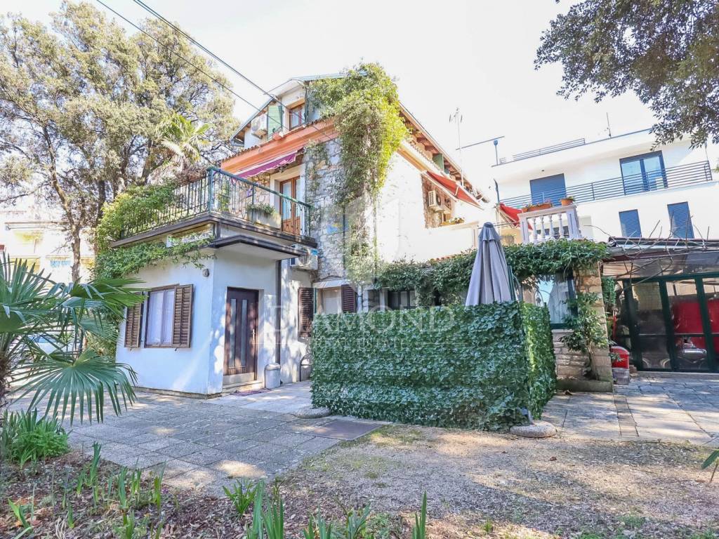 The house consists of one larger apartment on the ground floor with three bedrooms, kitchen and dining room, living room and storage. A separate entrance leads to the first and second floor or high attic of the house and there are two rooms that have their own bathroom and shared kitchen and dining room and are currently used for tourist rent. Rooms on the first floor have access to the terrace overlooking the sea and Rovinj. The house is surrounded by a green belt and leaves the impression of great privacy, although it is located in a residential part of town.