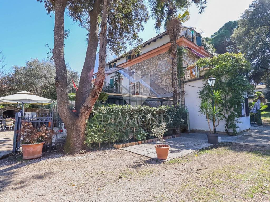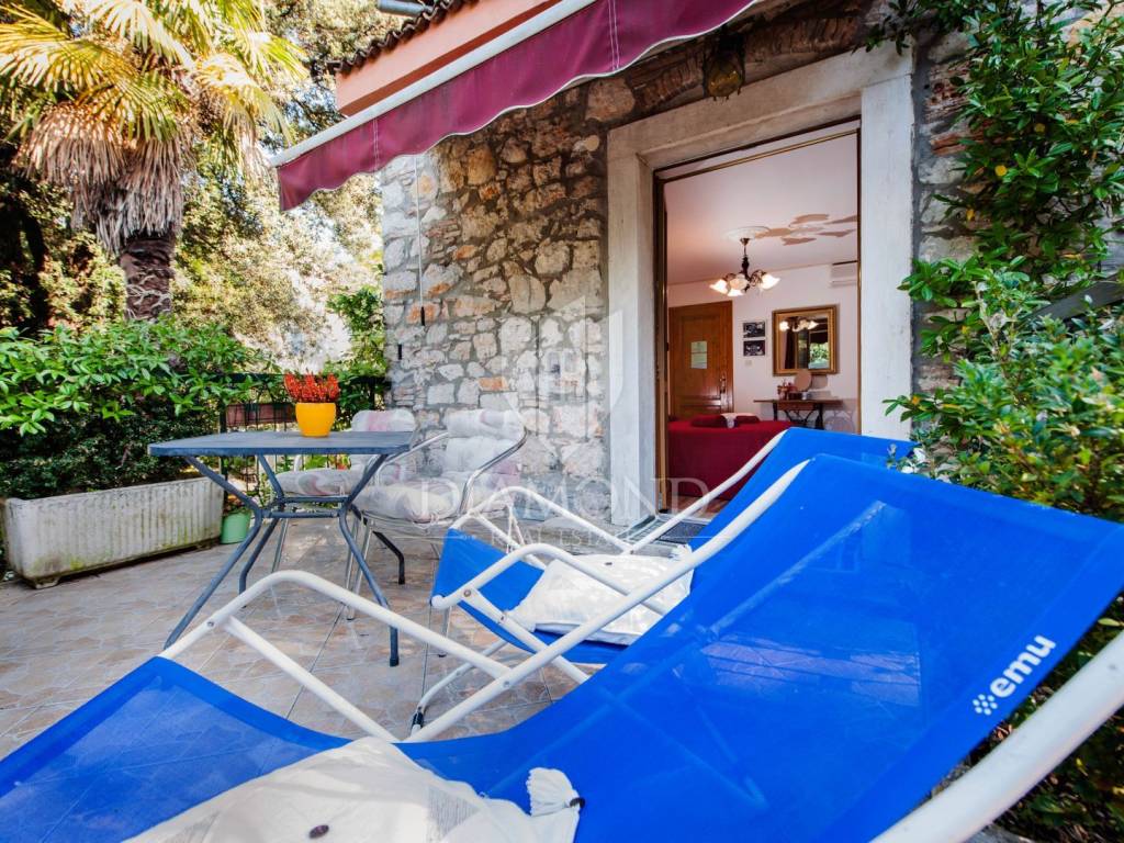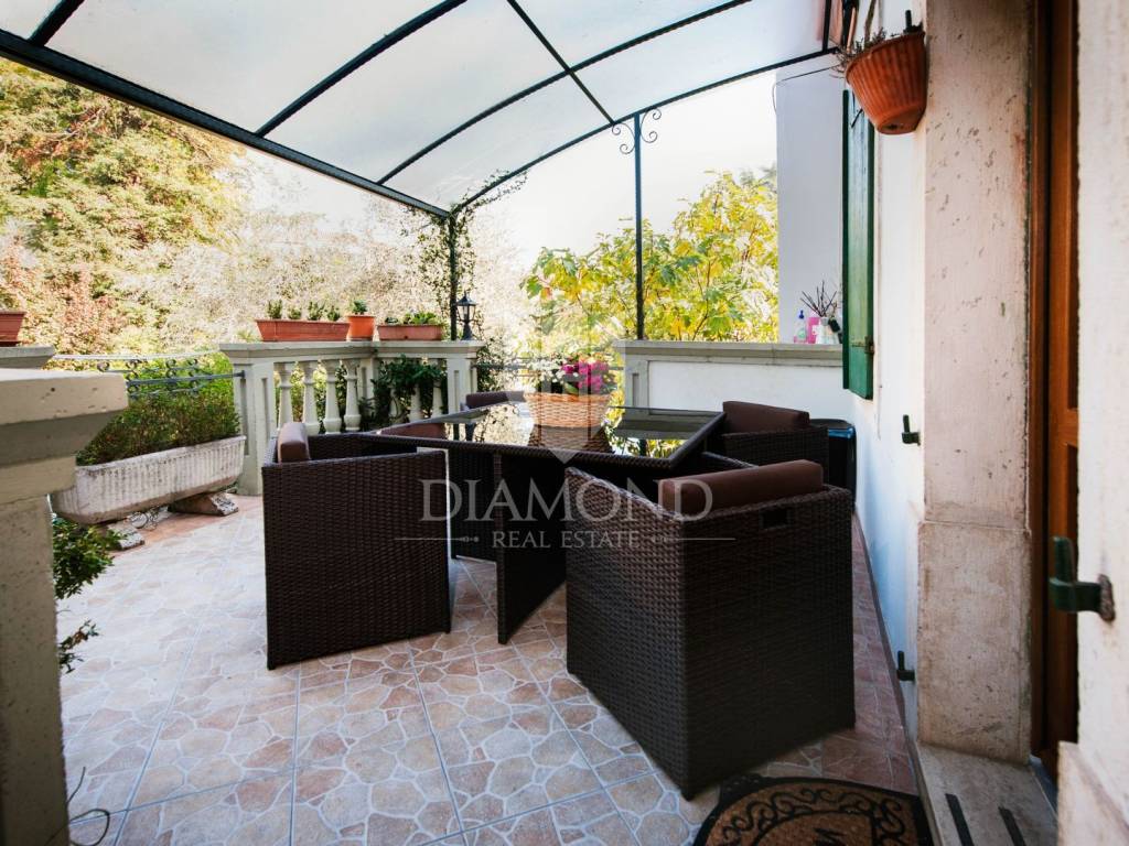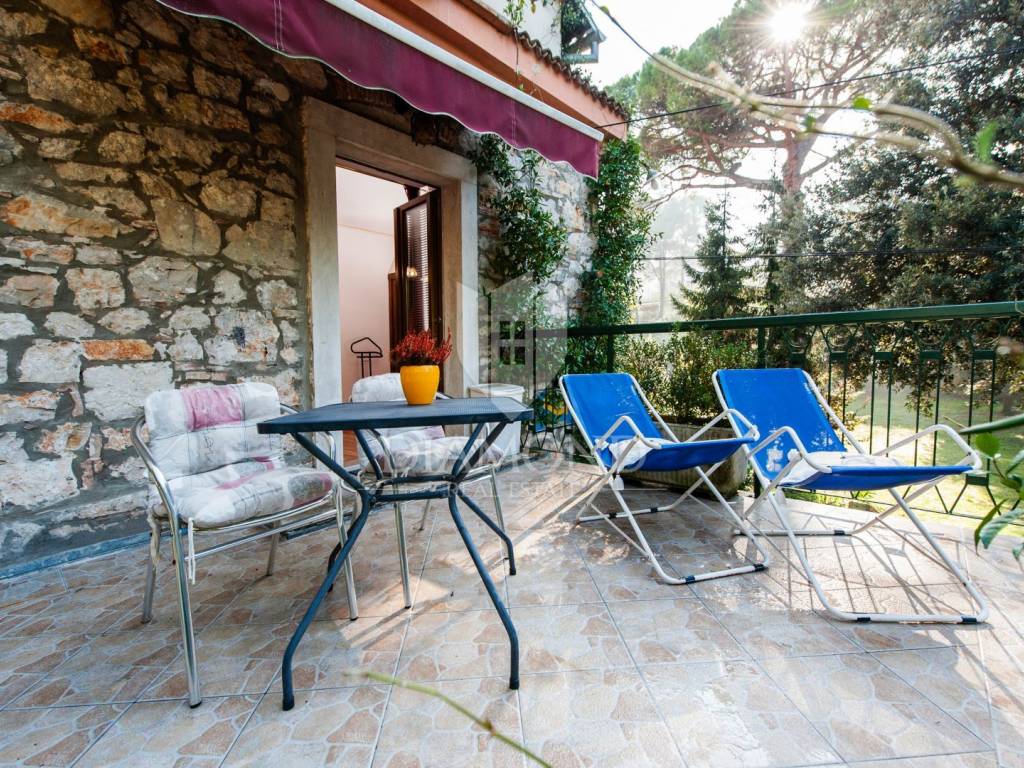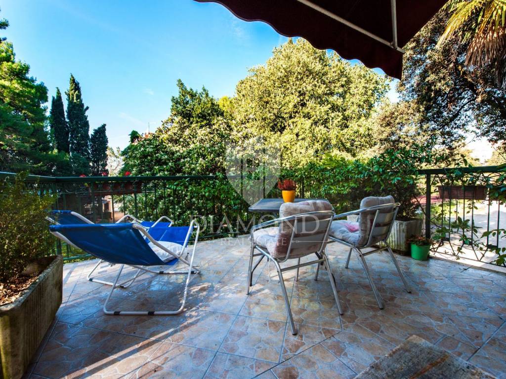 The house consists of one larger apartment on the ground floor with three bedrooms, kitchen and dining room, living room and storage. A separate entrance leads to the first and second floor or high attic of the house and there are two rooms that have their own bathroom and shared kitchen and dining room and are currently used for tourist rent. Rooms on the first floor have access to the terrace overlooking the sea and Rovinj. The house is surrounded by a green belt and leaves the impression of great privacy, although it is located in a residential part of town.