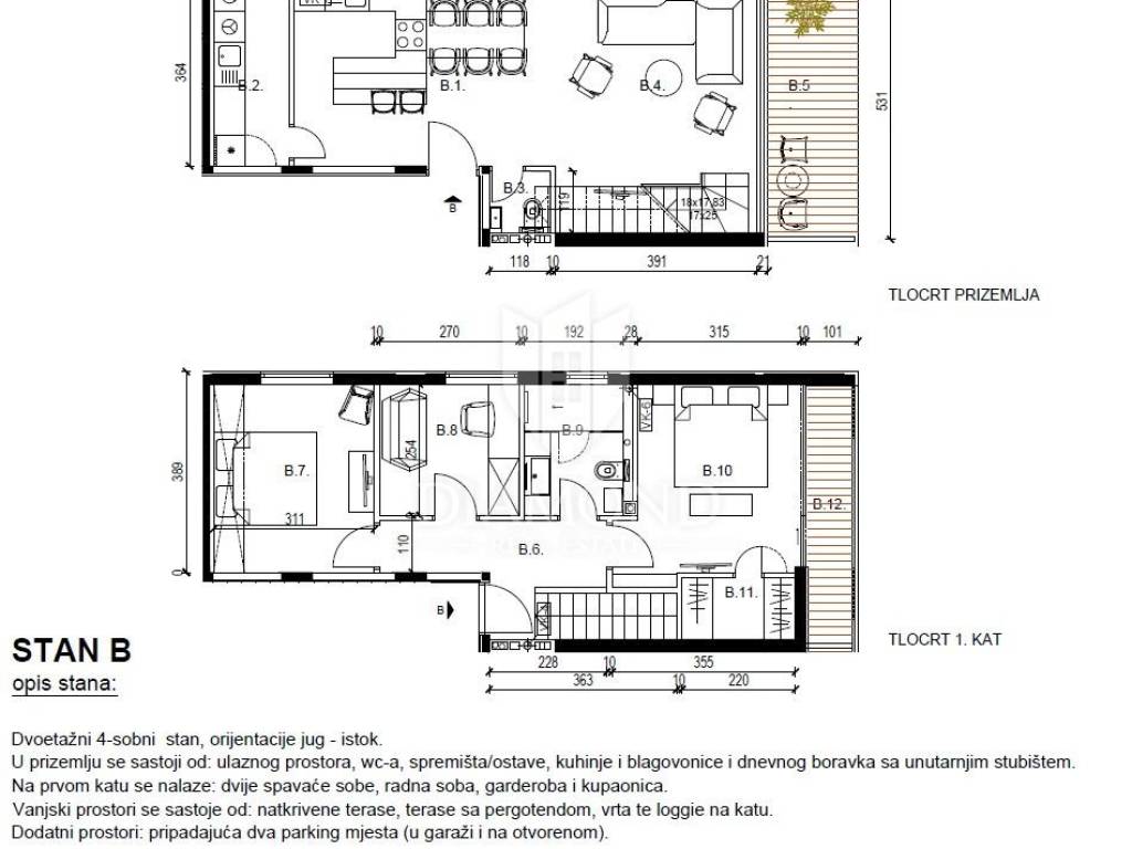 This apartment is located on the ground floor and extends over two floors with a total living area of 98.60 m2. On the ground floor there is a large open space concept where there is a kitchen, dining room and living room as well as a toilet, storage room and a staircase that leads us to the first floor where there are two bedrooms, a study and a bathroom. The master bedroom has a walk-in closet as well as an exit to its own terrace. This apartment also has an outdoor parking space. The private garden of approx. 120m2 provides enough space to enjoy the fresh air. The total net usable area of the apartment is 109.58m2.