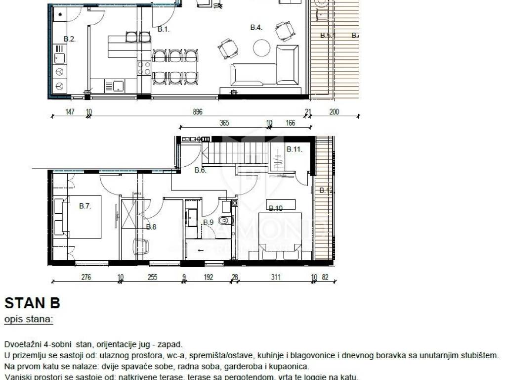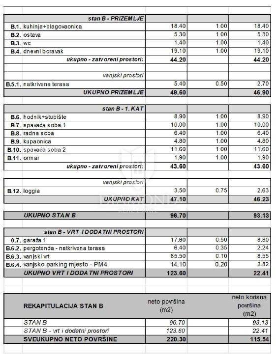 This apartment with a total usable area of ​​115.54 m2, which includes an outdoor parking space as well as a garage and a spacious garden, extends over two floors. The ground floor of the apartment is dominated by the open space concept, which consists of an entrance area, a guest toilet, a living room, a dining room and a kitchen through which you enter the storage room. The exit to the garden is designed through the glass wall in the living room, while the first floor of this apartment leads to a staircase that is discreetly integrated into the design of the living room. On the upper floor there are two more bedrooms, the main of which has a walk-in closet, a study and a bathroom. The living area of ​​this apartment is 93.13m2.