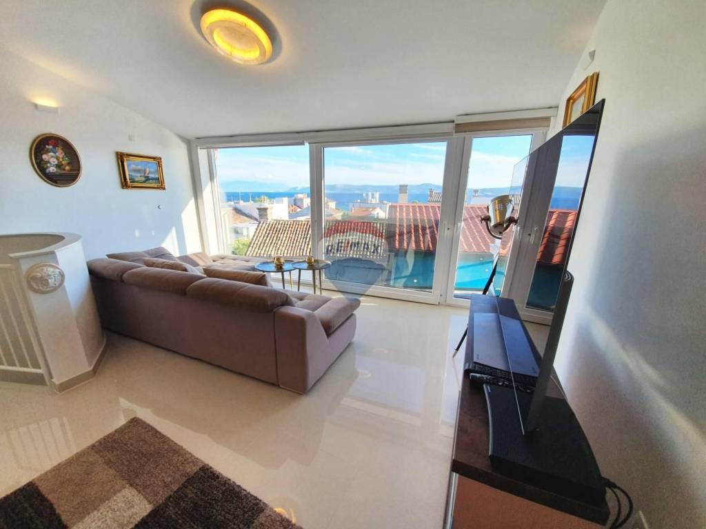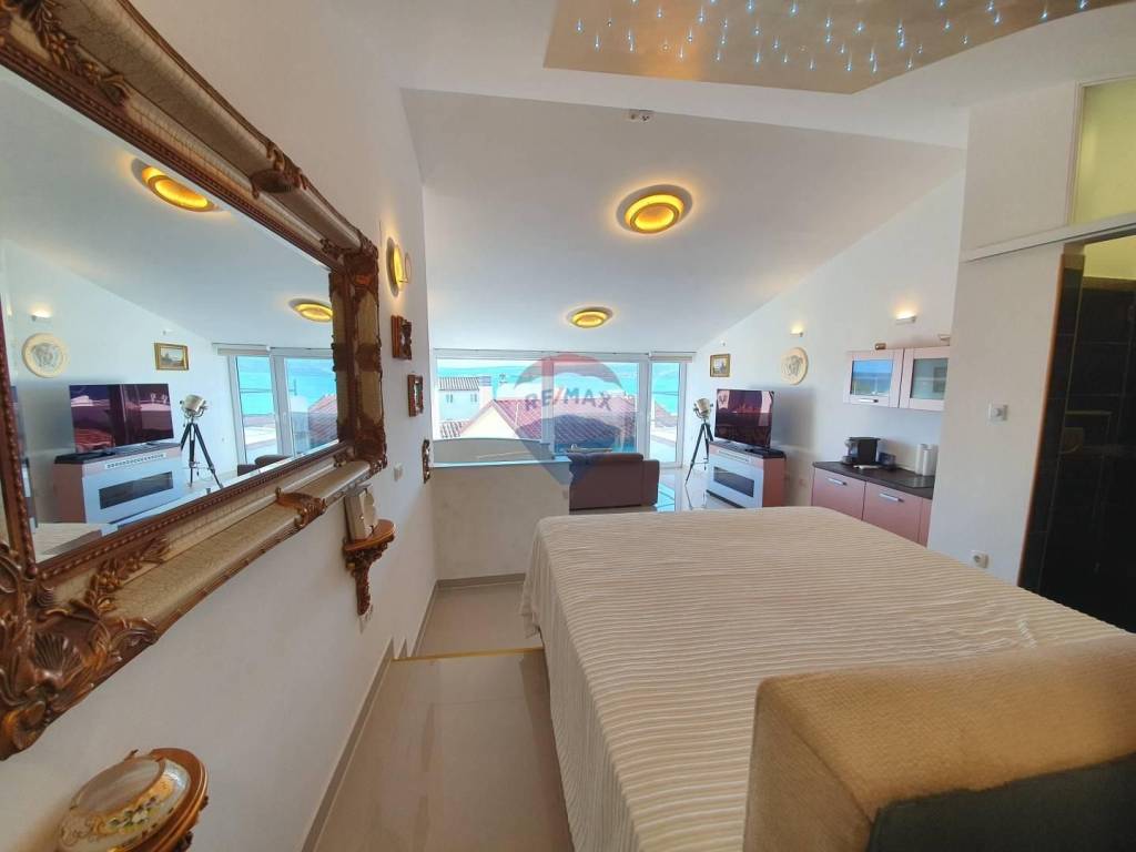We are selling a house on 4 floors with a garage in the center of Crikvenica, 200m on foot from the sea. On the first floor of the house with a separate entrance there is an equipped studio apartment with a yard, external stairs lead to the second floor where through a closed loggia you enter the living room with kitchen. On the second floor there is a garage for a car and a toilet. The third and fourth floors have separate entrances. On the third floor there is a bathroom and two bedrooms, one of which has a walk-in closet and exit to the balcony. An internal staircase leads to the fourth floor, which consists of an open space kitchen with living room, bedroom, bathroom, toilet and walk in closet. From the fourth floor there is a beautiful sea view which can be seen from the bed. The property is also excellent for tourism.