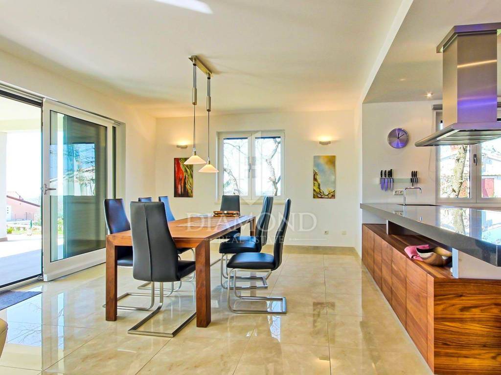 The house is spread over three floors and has an area of approximately 400m2, while it is located on a plot of land of 934m2. Starting from the basement, where there is a social room, a utility room for laundry, a toilet and a large boiler room with all the systems in the house, we climb the central staircase to the ground floor. There is a large living room with a wonderful kitchen and dining room, a pantry, an office or study, and a toilet. On the first floor we find three bedrooms, one room that can be a small living room for socializing or another bedroom and two bathrooms. It is also possible to go to the attic via a staircase that descends from the ceiling, and in the attic there is a room that is still waiting for its purpose. As for heating and cooling, a floor heating and cooling system has been installed using heat pumps. The house abounds with solar panels on the roof and in the garden, which serve to heat water and use it for household purposes, therefore, the house is eco-conscious and as such can provide savings throughout the year.