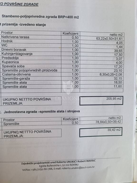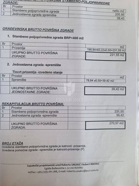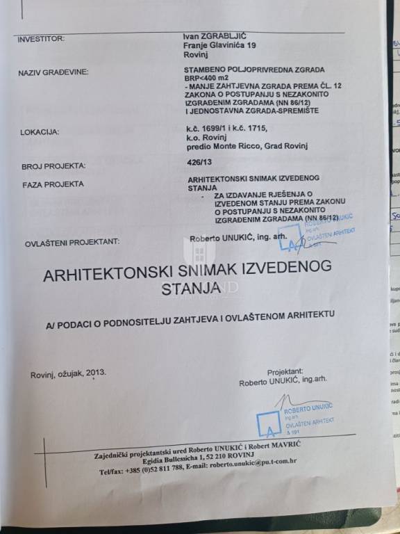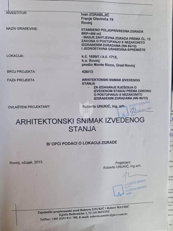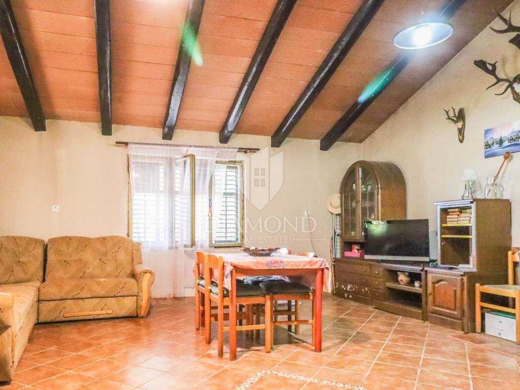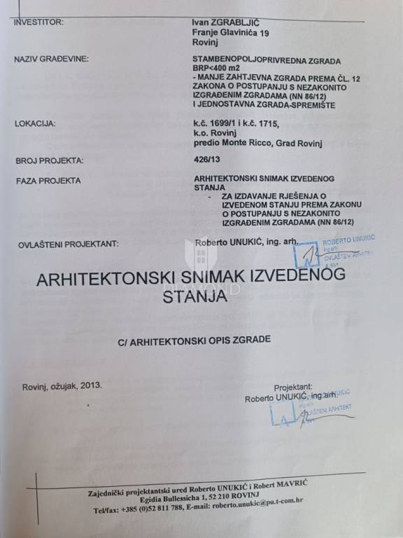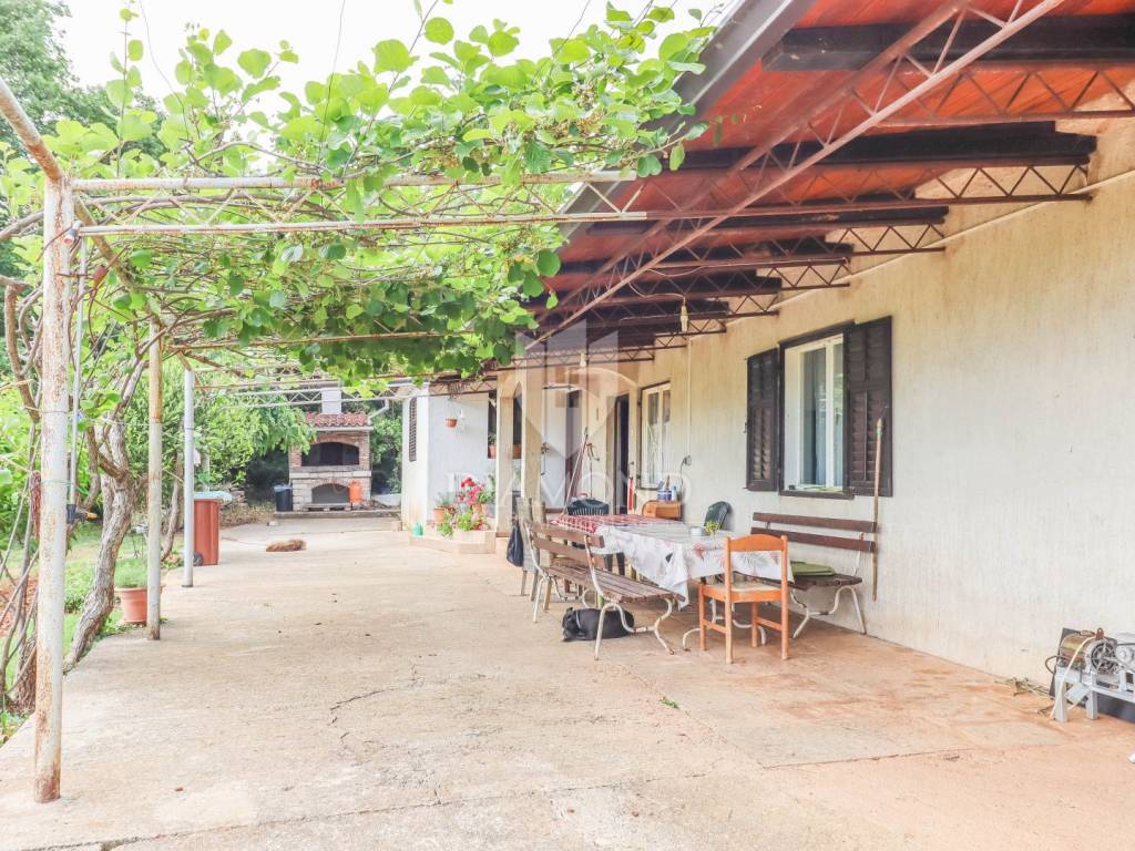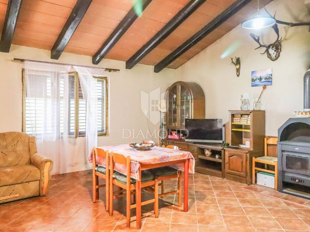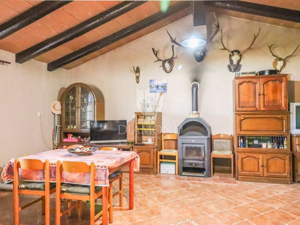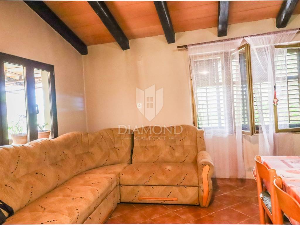 This house, hidden among olive trees and surrounded by a beautiful forest, is less than 1 kilometer from the beautiful Rovinj beaches. It is located on a building plot of approximately 400 m2, with two additional buildings, with a total gross area of 270 m2. The house consists of two units with separate entrances. The first unit consists of a large open space of 42 m2, which offers plenty of light and the possibility to decorate as desired, a hallway and a bathroom. The second unit, with an area of 50 m2, consists of a living room with kitchen and dining room, hallway, bathroom and bedroom. In front of the house is a beautiful covered terrace of 32 m2 with a view of the beautiful nature and a parking lot with enough space to park several cars. Behind the house there are two more legalized buildings with an area of 90 m2 that can be arranged or upgraded as desired. The land that surrounds the house guarantees you privacy, peace and quiet. This is a really good opportunity for anyone who wants to live, rest or build near the beach, enjoying the relaxing environment and the charms of this truly unique location in Rovinj.