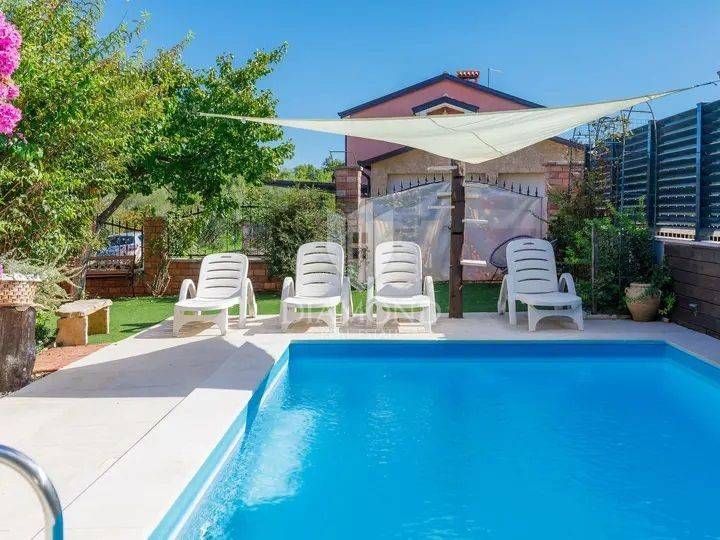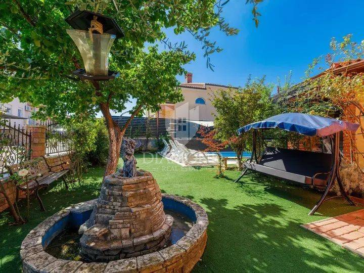 The total area of the house is 211 m2, it extends over two floors and consists of 3 apartments. On the ground floor there is a large spacious apartment of 84 m2. It consists of a living room with a kitchen and a dining room, 3 bedrooms, a storage room and a bathroom and a covered terrace. The first floor is accessed by external stairs, where there are 2 apartments, each with its own entrance. The first apartment has an area of 44 m2 and consists of a living room with kitchen and dining room, 2 bedrooms and a bathroom. The second apartment has a surface of 40 m2. It consists of a living room with kitchen and dining room, 1 bedroom, bathroom and terrace. Heating is central with gas, the apartment on the ground floor also has a wood stove, and cooling is with air conditioners. The house has solar panels on the roof that give it its own source of electricity. It has a beautiful and well-kept garden of 294 m2, where there is a summer kitchen, a swimming pool with a sun deck, a 42 m2 garage and a parking lot.