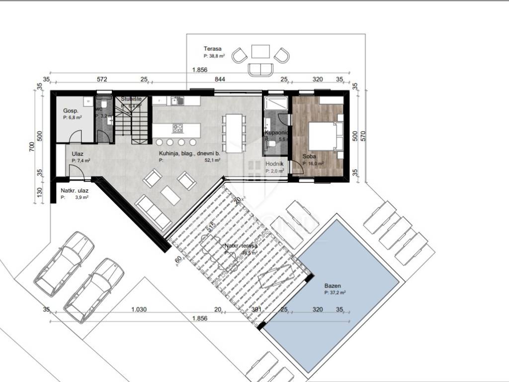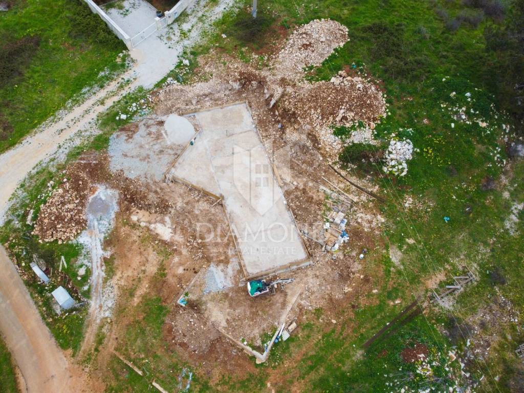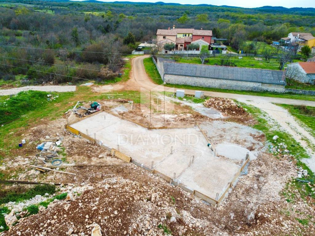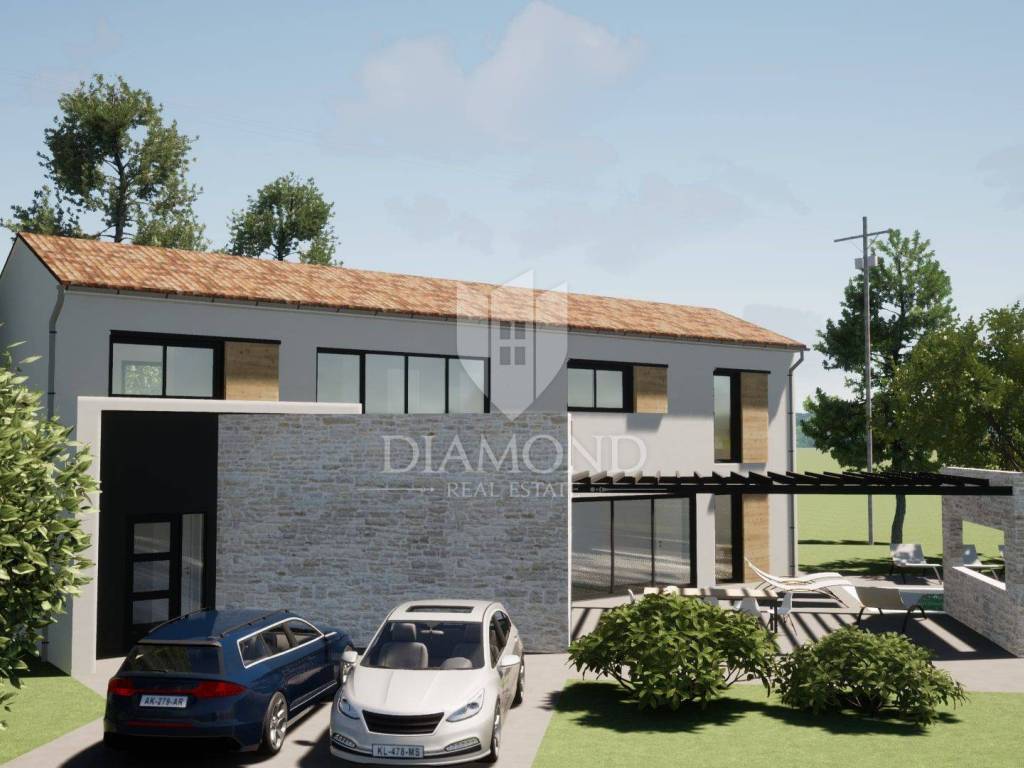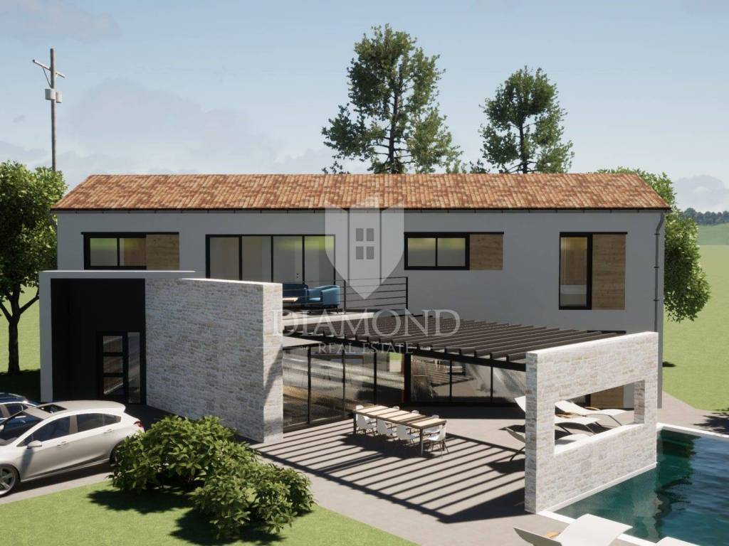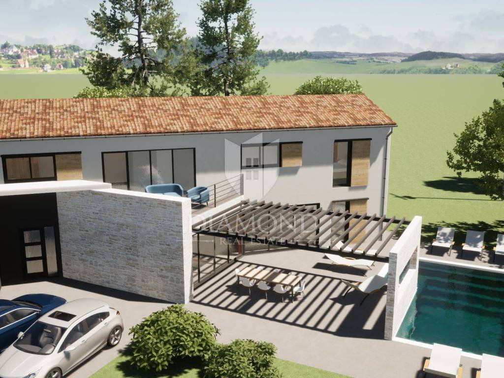 In the suburbs of the city of Poreč, on a plot of land of 864 m2, this idyllic villa with nature will be located. Its total size will be 228.80 m2. The villa is spread over two floors. On the ground floor of the villa, we pass through the corridor and come to the spacious living room, dining room and kitchen, which will be according to the open space concept, one bedroom with bathroom and toilet. The living room leads directly to the covered terrace where the swimming pool is located. On the first floor, there are three more spacious bedrooms, two of which have direct access to the bathroom from the room, and the third uses the bathroom from the room next door. Large glass walls will be installed throughout the villa, which allow a large influx of sunlight, which gives the space itself a large source of light. Heating of the house will be made possible by underfloor heating and air conditioners, which are also used for cooling on hot summer days. The garden in front of the house will be planted and decorated with Mediterranean plants, and the central place in the garden is occupied by a large swimming pool with a sunbathing area that allows full enjoyment on hot summer days. Restaurants, a school, a kindergarten, a post office, a shop, a church, and trails for a pleasant walk or bike ride in nature are not far from the place itself. Poreč and the beaches are only 14 km from the town. The first beaches and tourist camps are located only 8 km away from the place. The place is a very typical Istrian place with Istrian stone houses and several holiday villas. The special feature of the place is that the villa is located on the edge of the urban area and is surrounded by the wonderful beauty of nature and the chirping of birds. The planned completion of construction is autumn/2024.