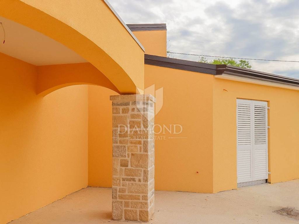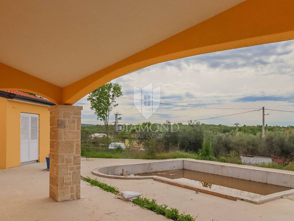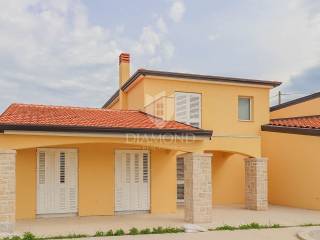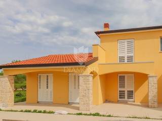 The house has a total area of 153 m2 and extends over two floors. On the ground floor there is a large living room with an open-plan kitchen and dining room, a wardrobe, an entrance hall and 2 bedrooms, each with its own bathroom, one of which has an exit to its own terrace. From the living room you can reach the covered terrace from which you can access the landscaped garden of 1060 m2, where there is a summer kitchen, a beautiful swimming pool with a sunbathing area and two parking spaces. The first floor is accessed by internal stairs, where there is a bathroom and 1 large bedroom with 2 terraces. The house is built from high-quality materials with underfloor heating with a heat pump and cooling with air conditioners. The carpentry will be PVC glazed with isopan glass, the external walls will be made of Porotherm bricks, 25 cm thick with 10 cm thermal insulation, and the floors will be made of ceramics or wood.