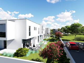 The house extends over two floors, with a total area of 141 m2 with terraces. On the ground floor there is a living room with an open-plan kitchen and dining room, 1 bedroom with its own bathroom, a hallway, a storage room with a laundry room and a guest toilet. From the living room there is access to a covered terrace, from which you can access the garden, where you can build a swimming pool if you wish. The first floor is accessed by an internal staircase with a bathroom, 2 terraces and 3 bedrooms, 1 of which is a master bedroom with its own bathroom, dressing room and terrace. The house is built from high-quality building materials with electric underfloor heating in the bathrooms and air conditioners. It has two parking spaces.