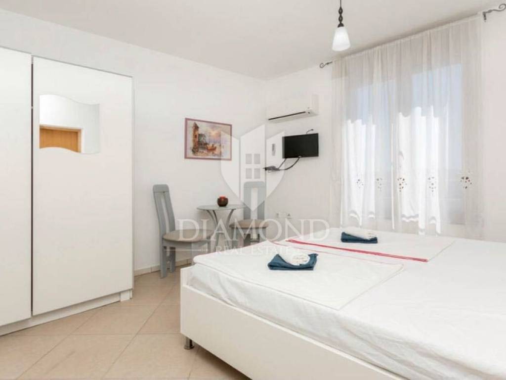 The house spreads over three floors with a total of eleven studio apartments which are fully equipped and ready to use. There are eight in all covered terraces and enough space in the yard for three parking spaces.