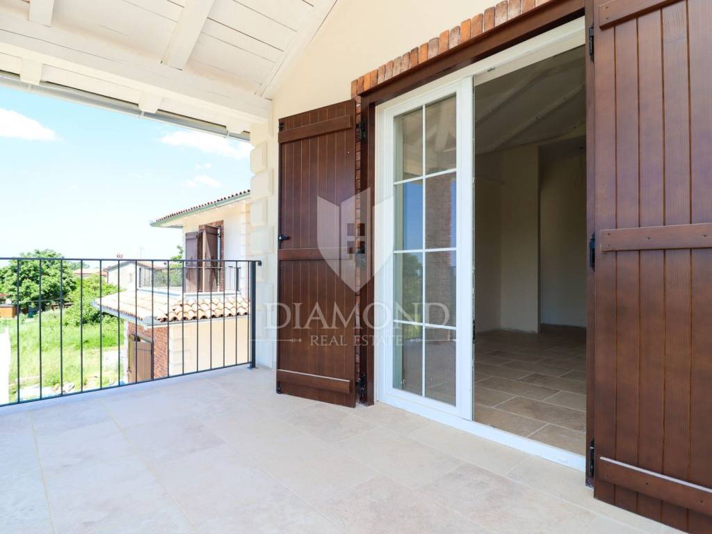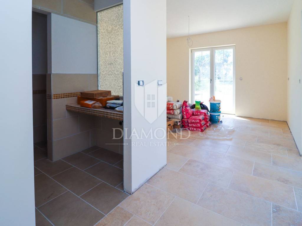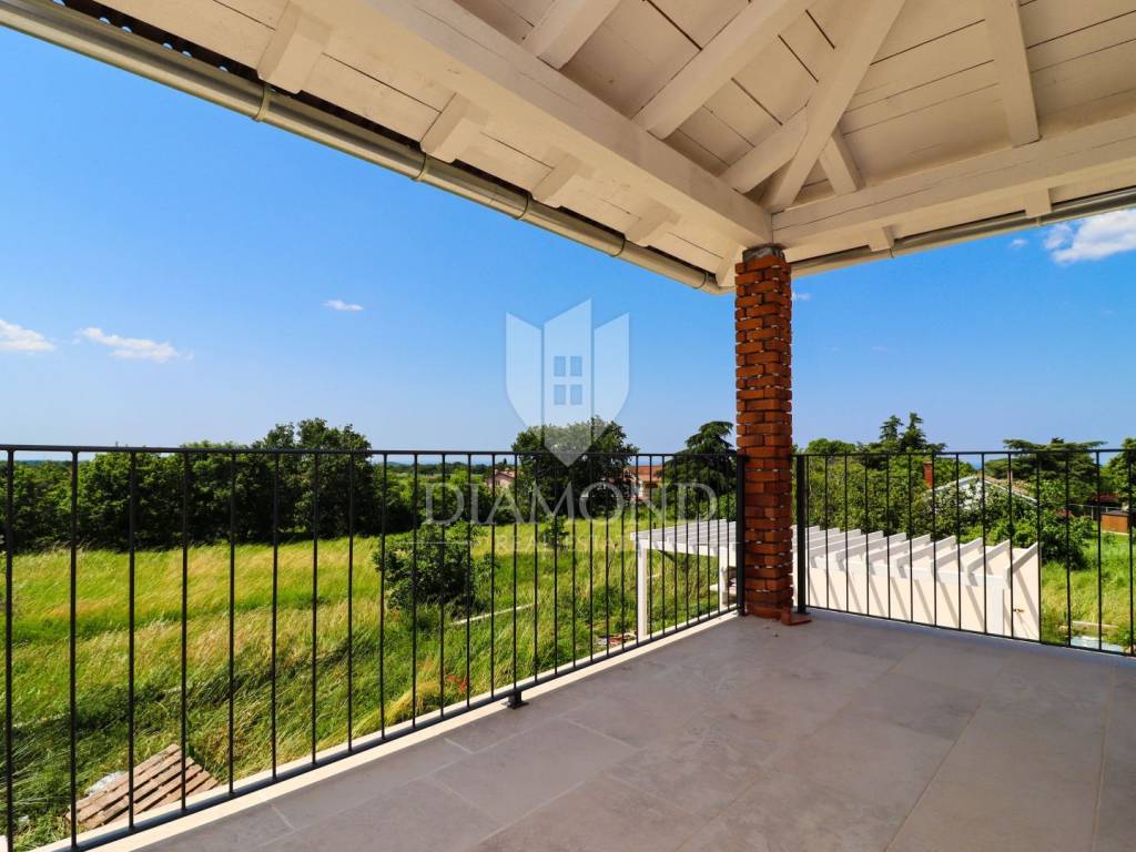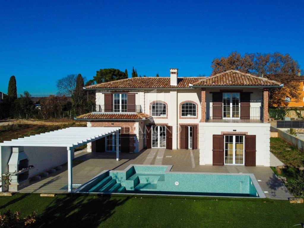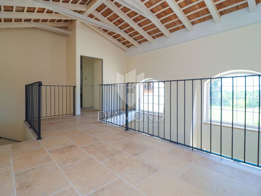 This fantastic rustic villa with a swimming pool is for sale in a place not far from the city of Poreč. Its total area is 174.17 m2 and extends over two floors. On the ground floor of the villa there is a living room, kitchen, dining room, toilet, laundry room, bedroom with bathroom and exit to the terrace and another room that is intended for a sauna but is prepared for another bedroom with its own bathroom, a technical room and a storage room . There is a wood-burning fireplace in the living room, which provides additional warmth to the home in winter. The internal staircase leads to the gallery on the first floor, where there is a library and two more spacious bedrooms, each with its own bathroom and a separate terrace with a beautiful view of nature and the sea. The villa is heated via air conditioning and underfloor heating with a heat pump. The living room and the kitchen lead directly to the covered terrace where there is a summer kitchen and a sun deck with a swimming pool. The garden around the house will be planted and decorated with Mediterranean plants. parking is located in front of the villa. Facilities such as a school, kindergarten, crèche, shop, post office, pharmacy, tourist camps, catering facilities, walks in nature and along the beach are only 5 km away from the city of Poreč.