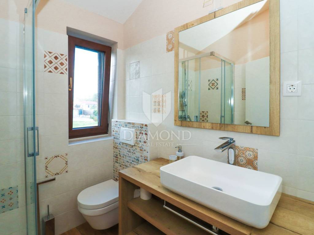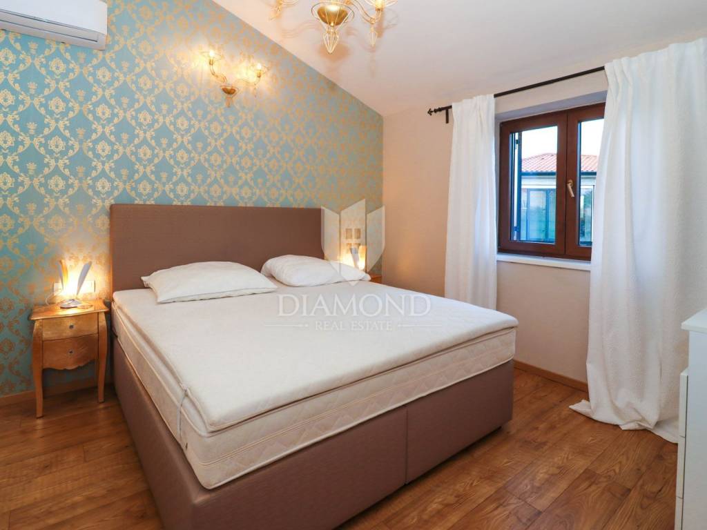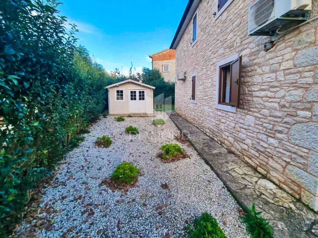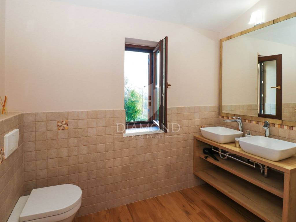 This idyllic stone house is located in a quiet place between Vrsar and the Lim Channel. The town of Vrsar is located at the entrance to the Lim Bay, Vrsar is a place of magical sea views, vibrant colors and typical Mediterranean beauty. The house is located on a plot of 650 m2, its size is 168 m2. On the ground floor there is a spacious living room which is open space connected to the kitchen and dining room with access to a covered terrace where there is a swimming pool, one bedroom, bathroom, toilet and pantry. With an elegant stone lighted staircase we come to the first floor of this beautiful house where there are three comfortable bedrooms, one with its own bathroom and a balcony overlooking the pool and another bathroom. The whole house is equipped with indigenous Istrian stone and style. The garden is arranged and fenced and in front of the house there is a covered parking lot. Behind the house is a wooden house that serves as another pantry, and right next to it is a fireplace and a wooden table. At only 3 km away there are restaurants, winery, school and kindergarten, pharmacy, church and paths for a pleasant walk in nature. Porec and the beaches are only 15 km away.
