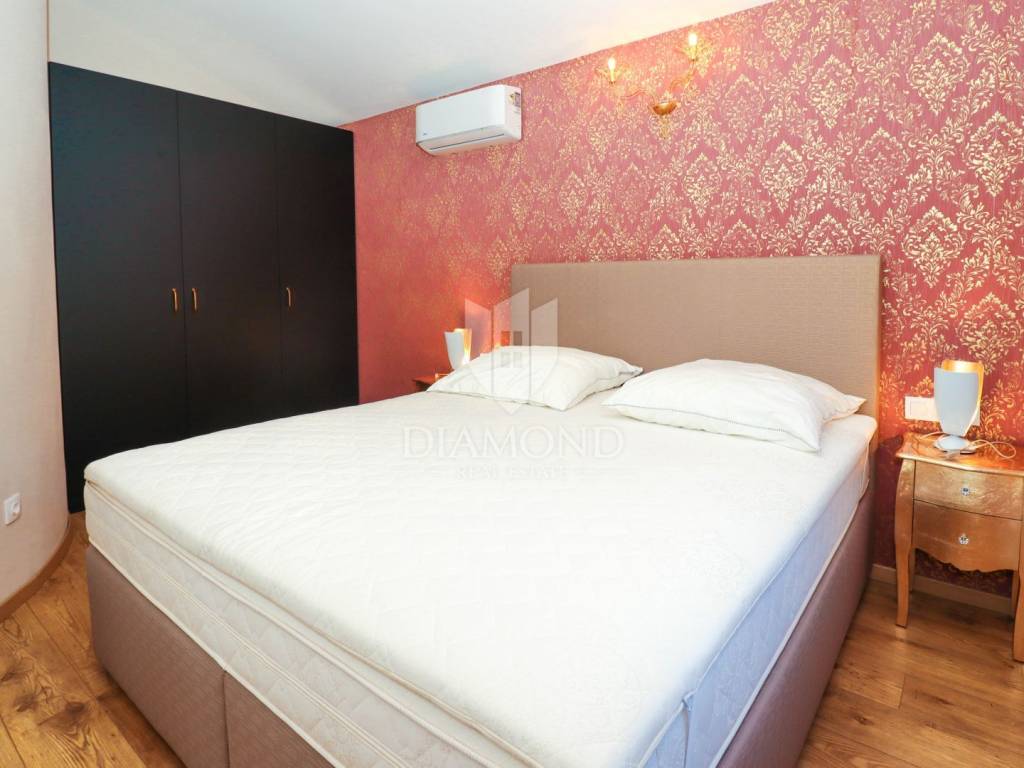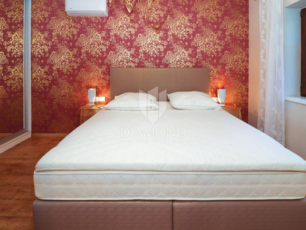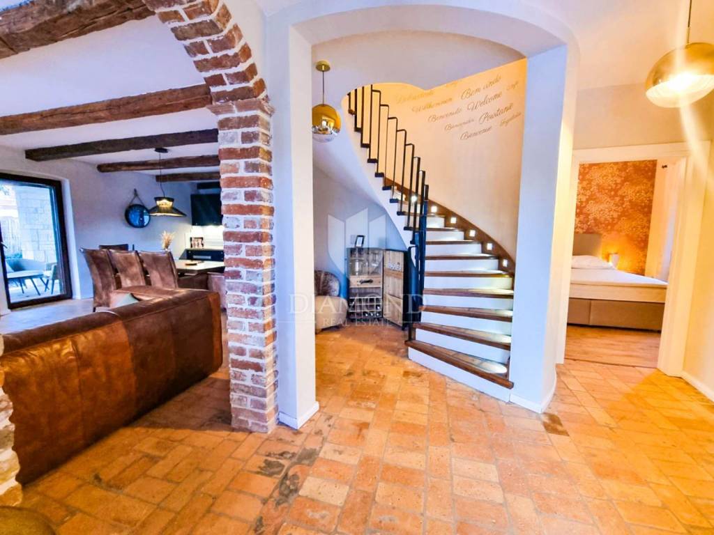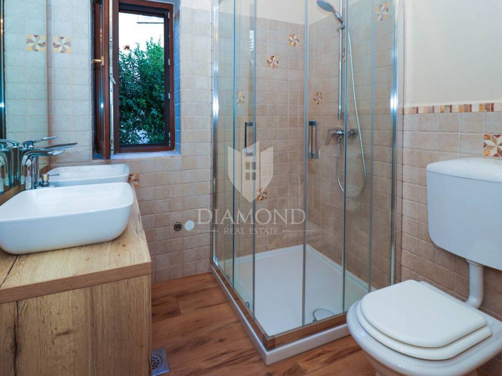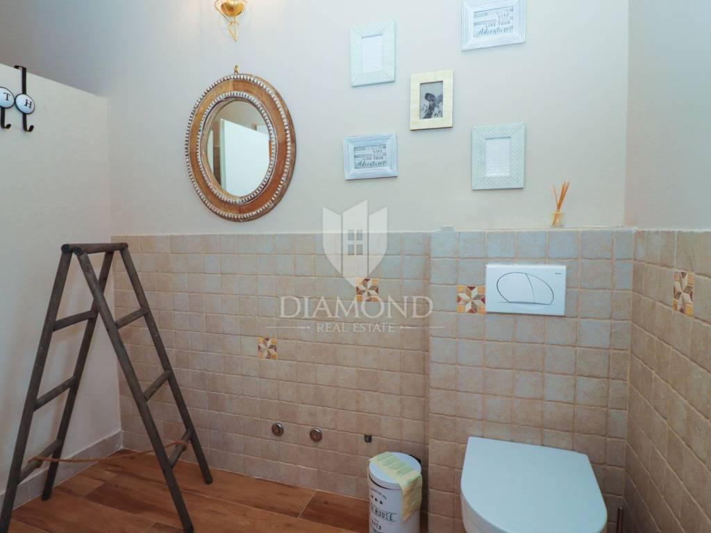 This idyllic stone house is located in a quiet place between Vrsar and the Lim Channel. The town of Vrsar is located at the entrance to the Lim Bay, Vrsar is a place of magical sea views, vibrant colors and typical Mediterranean beauty. The house is located on a plot of 650 m2, its size is 168 m2. On the ground floor there is a spacious living room which is open space connected to the kitchen and dining room with access to a covered terrace where there is a swimming pool, one bedroom, bathroom, toilet and pantry. With an elegant stone lighted staircase we come to the first floor of this beautiful house where there are three comfortable bedrooms, one with its own bathroom and a balcony overlooking the pool and another bathroom. The whole house is equipped with indigenous Istrian stone and style. The garden is arranged and fenced and in front of the house there is a covered parking lot. Behind the house is a wooden house that serves as another pantry, and right next to it is a fireplace and a wooden table. At only 3 km away there are restaurants, winery, school and kindergarten, pharmacy, church and paths for a pleasant walk in nature. Porec and the beaches are only 15 km away.