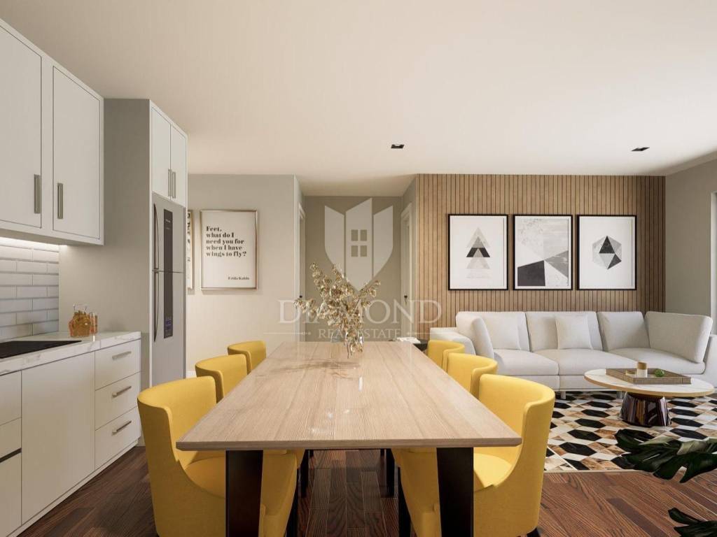The apartment is located on the 1. floor of a smaller building with only 4 apartments. The apartment has a total area of 66m2 and consists of 2 bedrooms, 2 bathrooms, a kitchen and a living room with access to a terrace with a panoramic view of the sea. The apartment has underfloor heating and air conditioners, which can also be used for heating and cooling. The apartment includes a storage room and one parking space with power supply for an electric vehicle. The apartment works on a turnkey basis, made of high-quality materials. Construction has started and the end is expected in the summer of 2025.