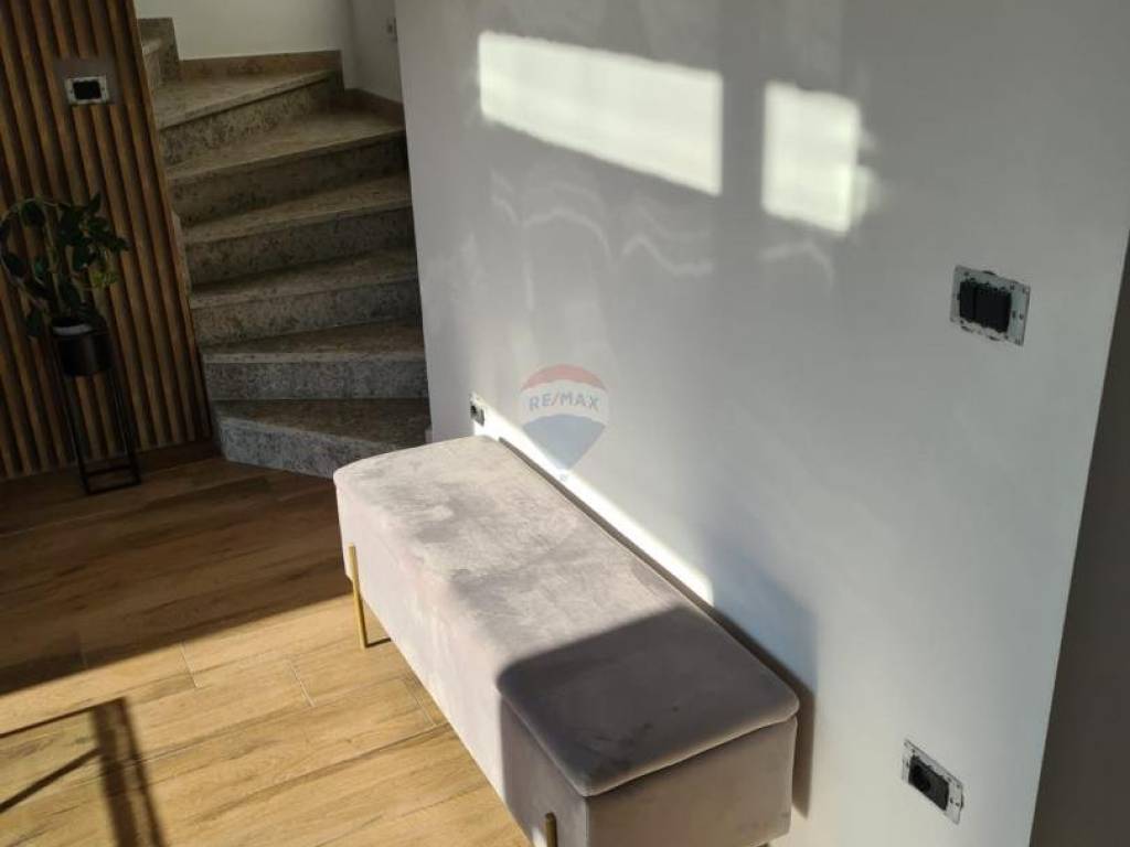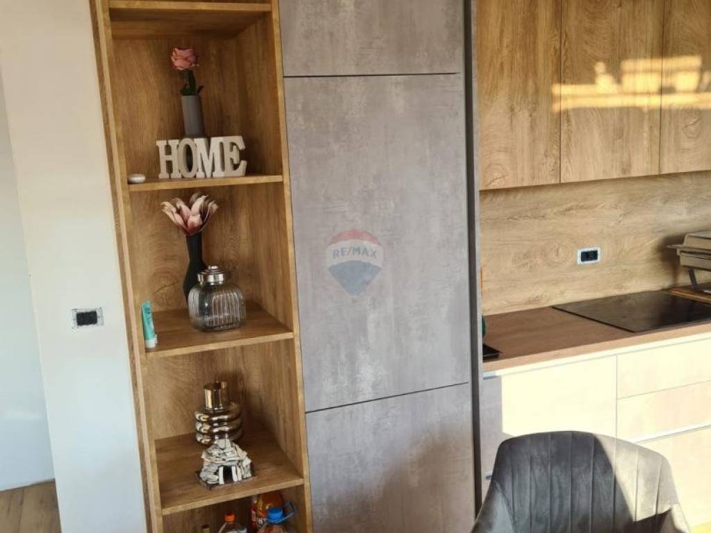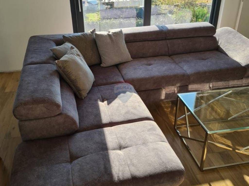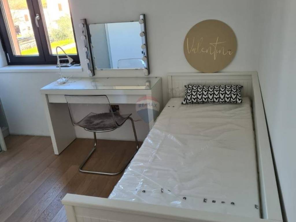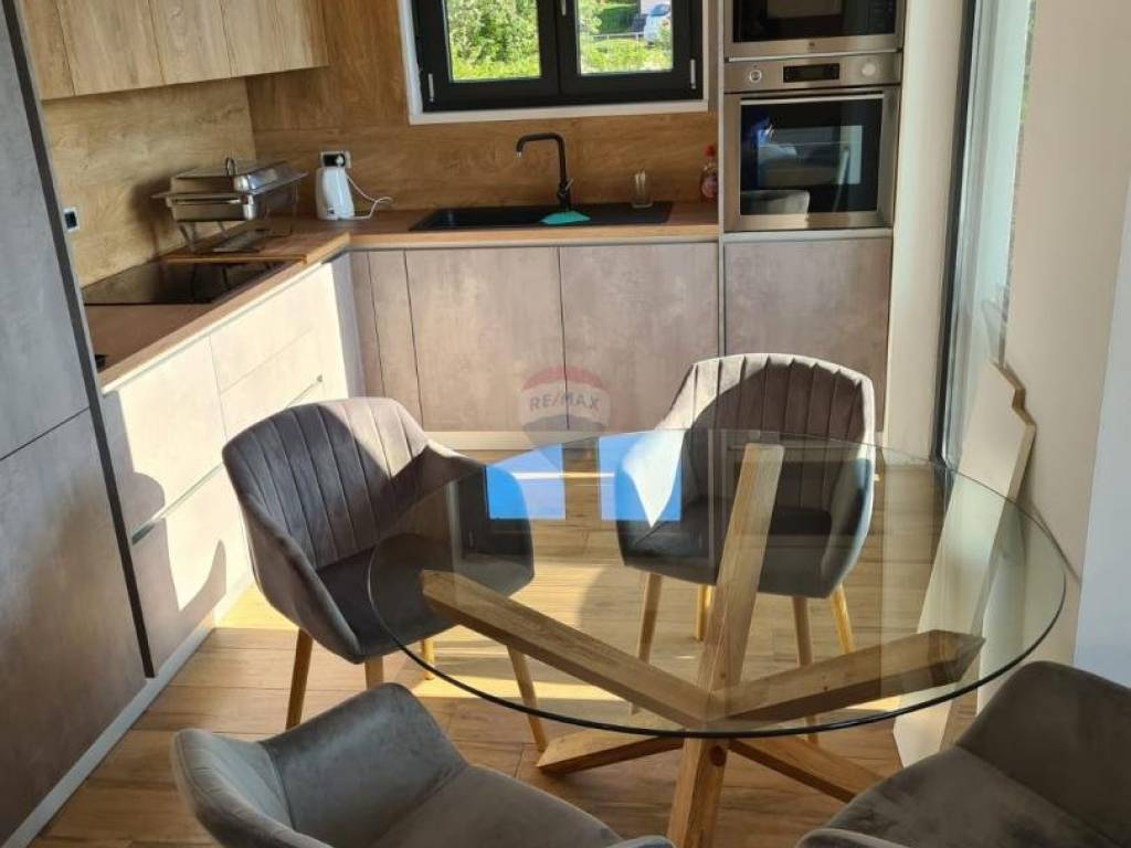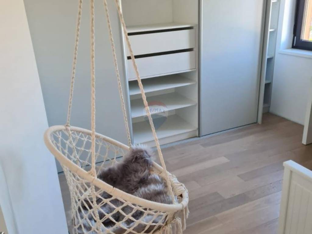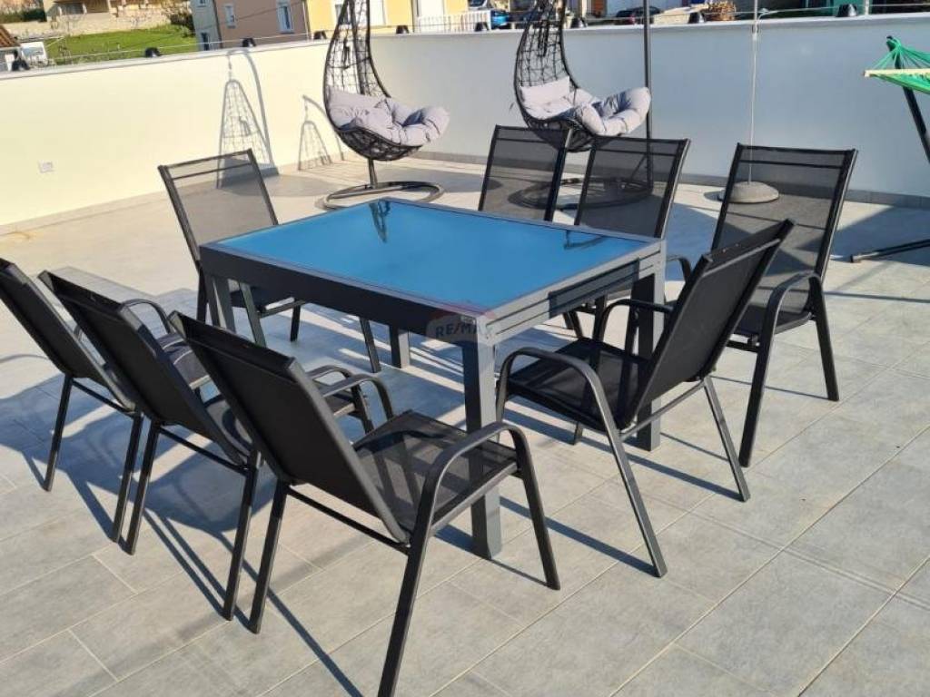 Near Poreč, at a distance of 7 km, an apartment is for sale on the first floor with a roof terrace and a beautiful view of the sea. Its area is 70.73m2, plus a skylight of 11.53m2. The apartment consists of an entrance hall, a kitchen with a dining room and a living room with an open space that has two glass walls that give the apartment light and a view of the sea. It also has two bedrooms, a bathroom and a covered terrace. The apartment has a furnished roof terrace with electricity and water and reinforced fittings for a jacuzzi measuring 80m2. It is fully furnished and equipped with top quality furniture and appliances and is being sold as such. Heating is provided via air conditioning, and floor heating is installed in the bathroom. The apartment has one parking spot.