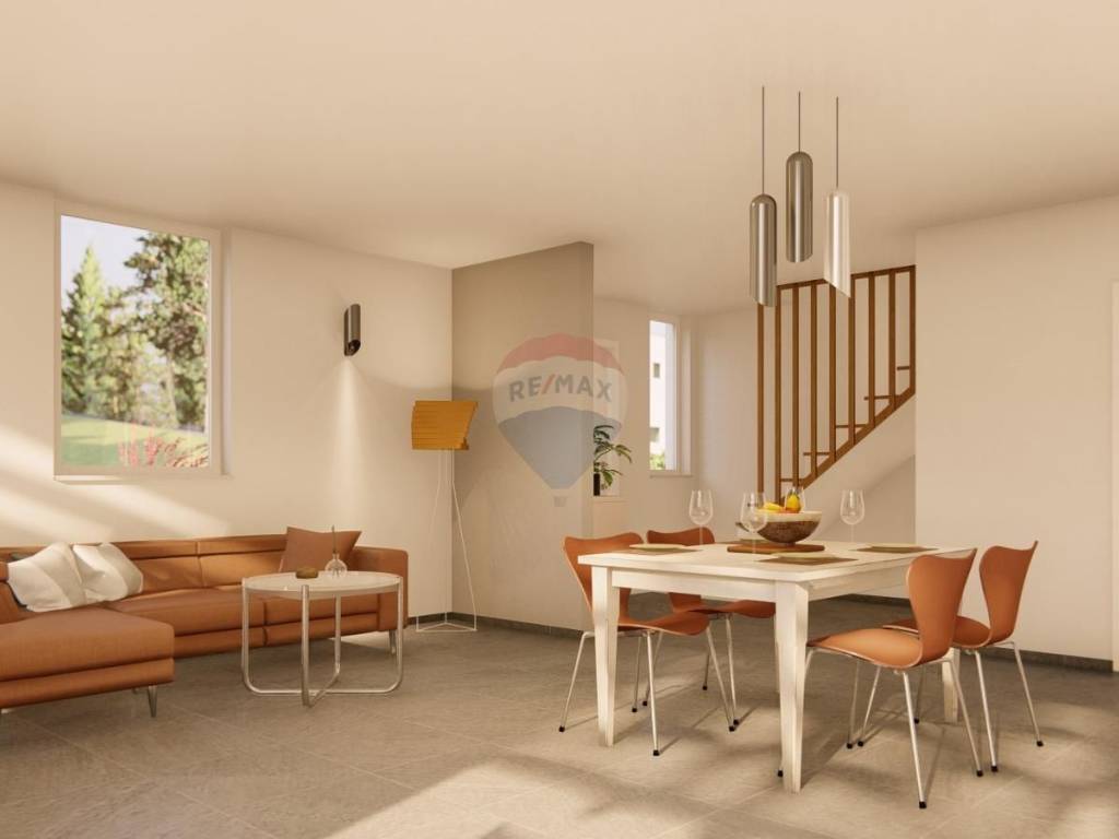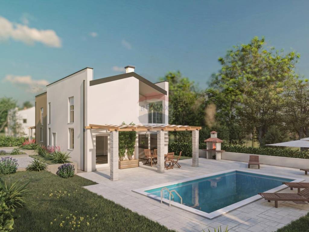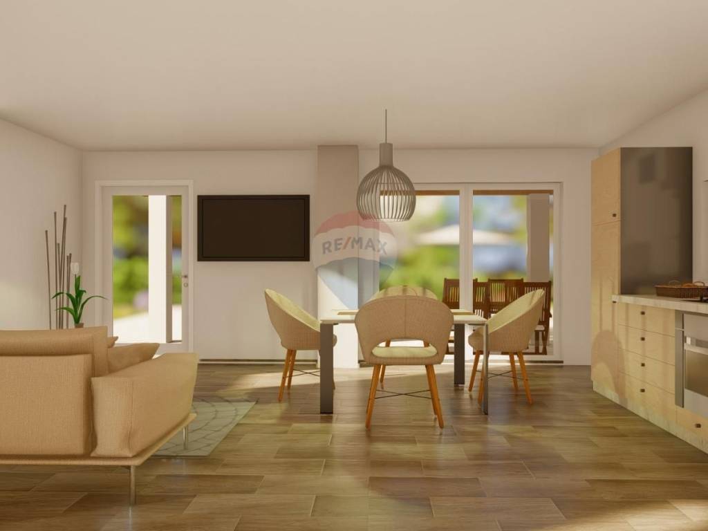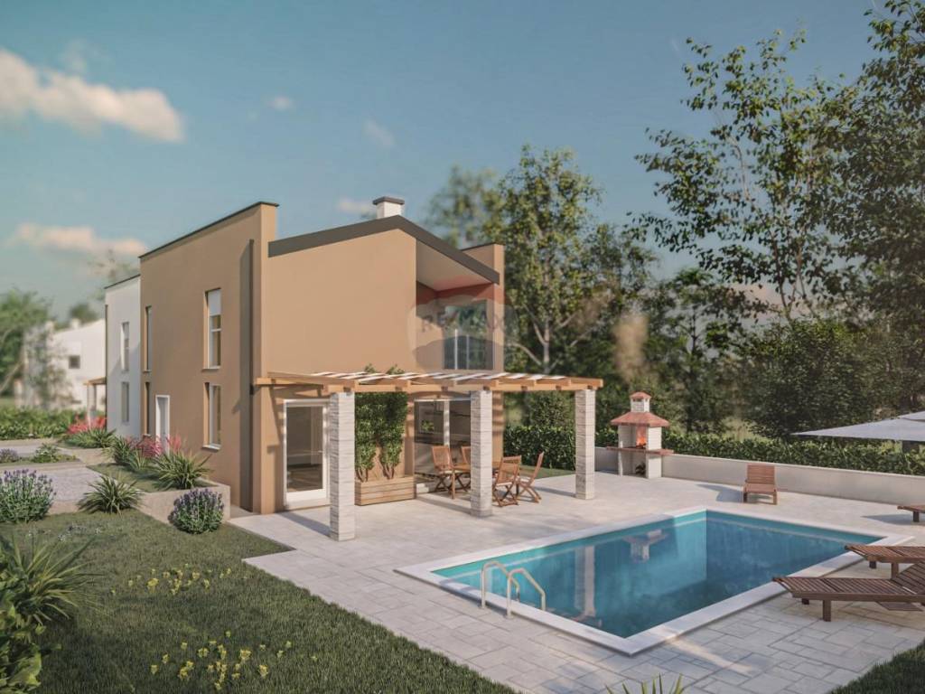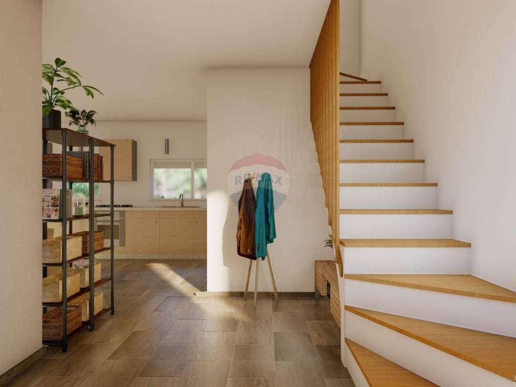 A semi-detached house for sale in the vicinity of Tinjan with a living area of 84 m2 and a garden of 250 m2. The ground floor consists of an open space consisting of a kitchen, a living room and a bathroom. The living room leads to the terrace and pool. On the first floor there are two bedrooms, a toilet and a laundry room. One bedroom has a balcony. Heating is planned for air conditioning, and at the same time, the first phase for central heating is also prepared. The house is suitable for family life due to its quiet location. It can also be used as an investment for tourist rental.