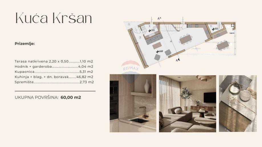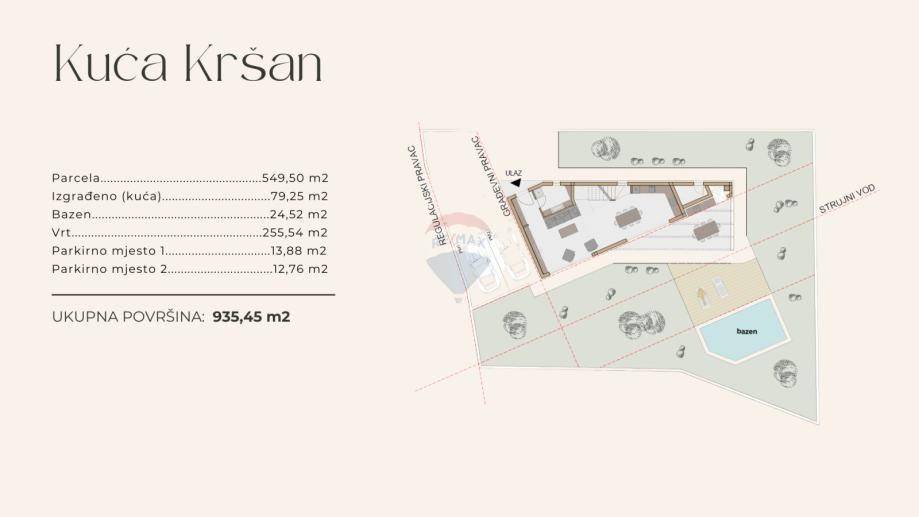 U Kršanu, lijepom ruralnom istarskom kraju, prodajemo građevinsko zemljište površine 550 m2 s ishodovanom građevinskom dozvolom za kuću površine 115 m2 s bazenom.