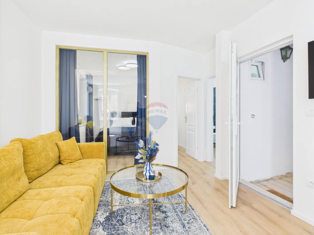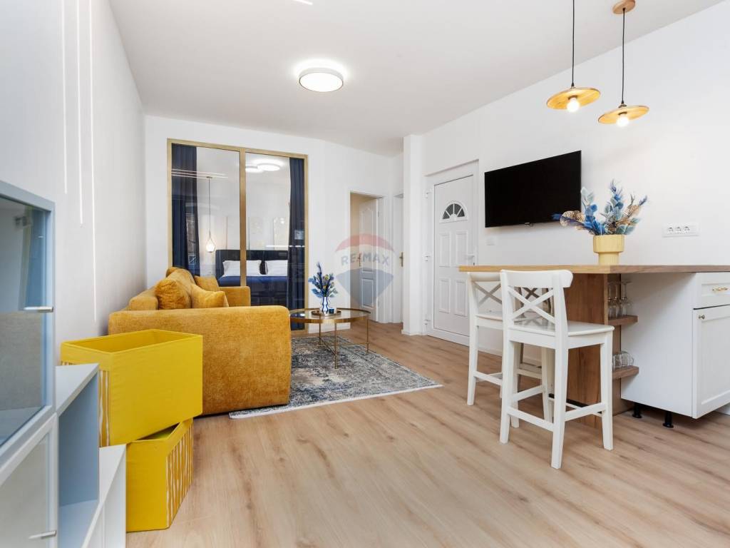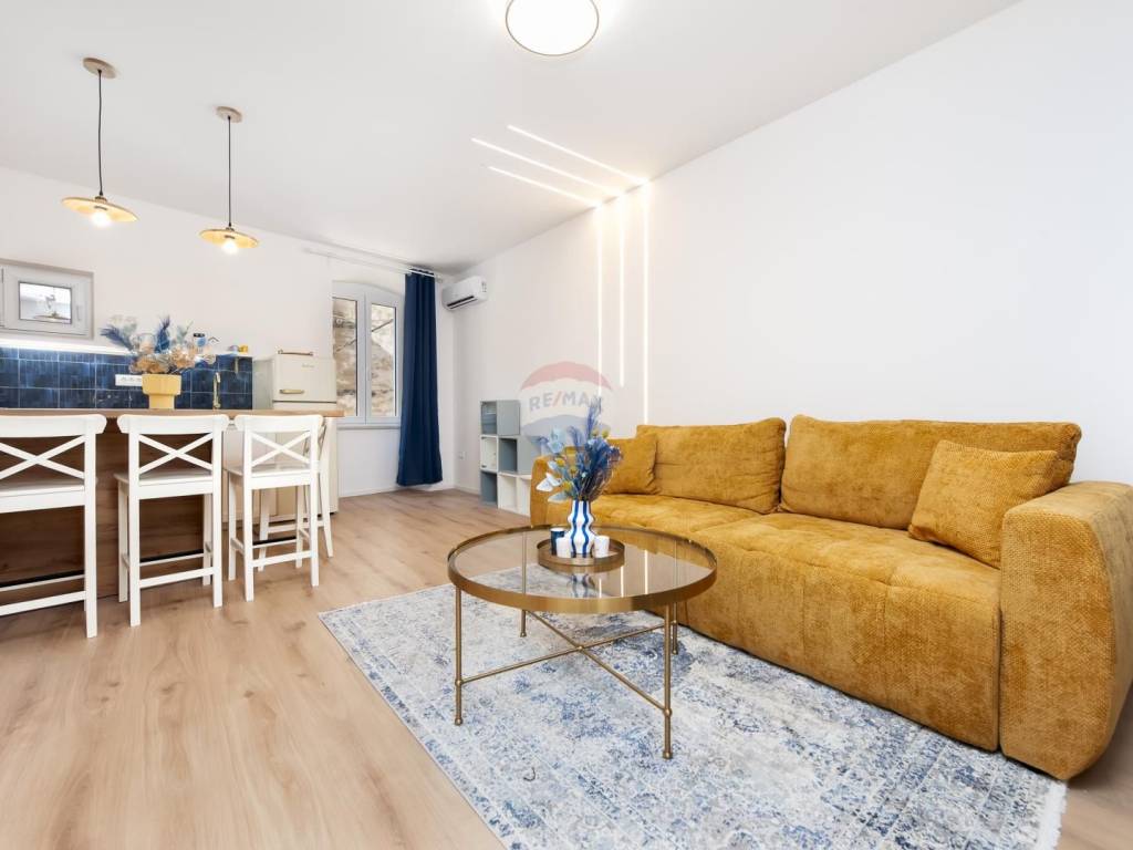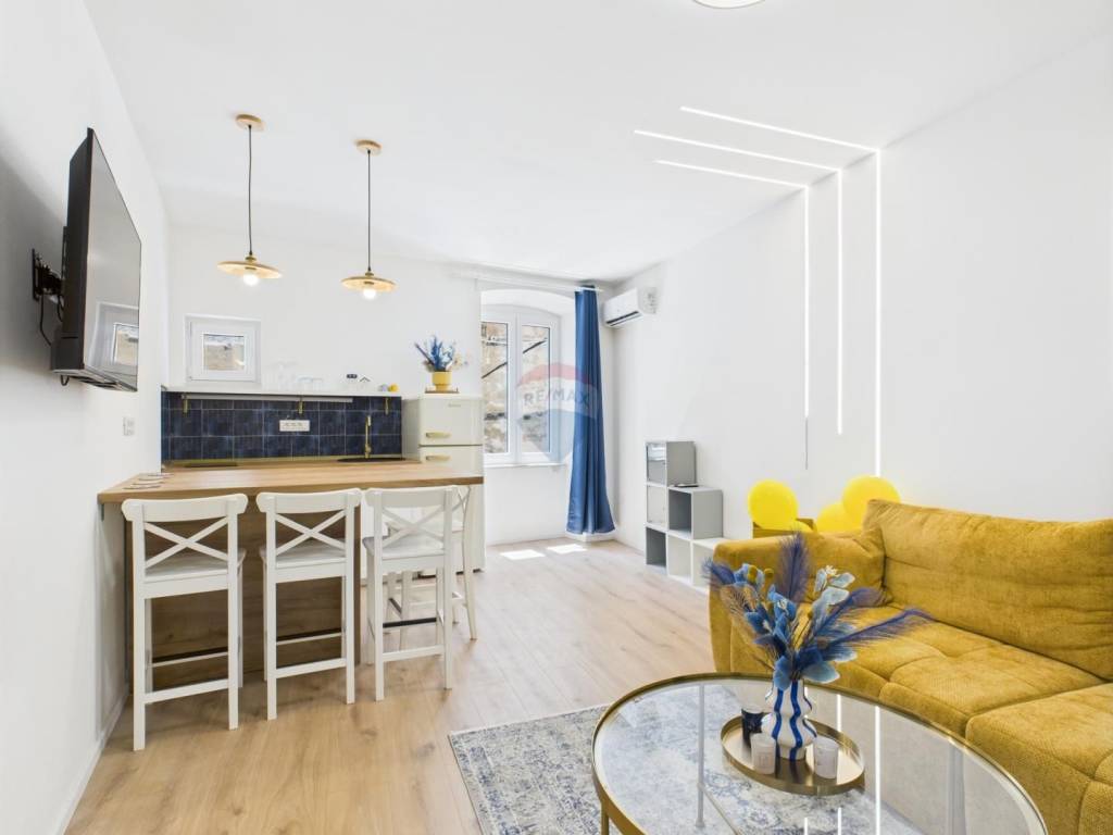 The apartment is for sale and is located on the first floor of a historic building in the old town, on a quiet street close to all essential amenities. It has been completely renovated, combining modern living standards with traditional architectural features. The layout includes one bedroom, a living room, a kitchen with dining area, and a bathroom. The space is bright, functional, and tastefully furnished. The location provides quick access to shops, restaurants, cultural venues, and public transport. This property is suitable for everyday living or as an investment for rental.