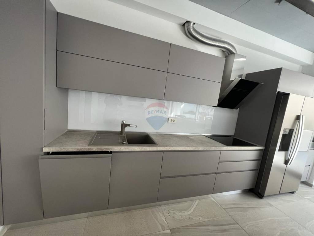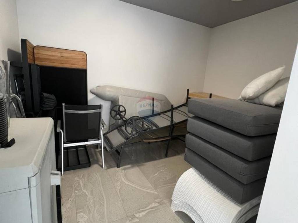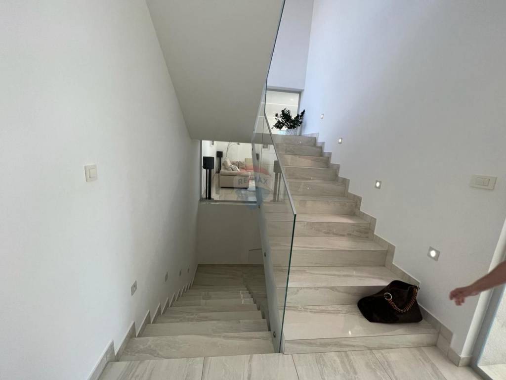 The ground floor consists of a large kitchen, dining room, toilet, living room with large sliding walls through which you can access the garden with a swimming pool and a wonderful view of the sea. Downstairs there is a garage for two cars and a storage room.