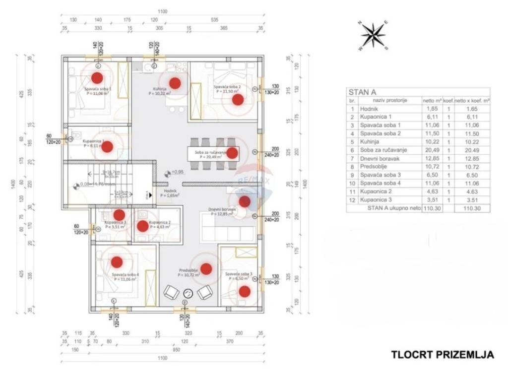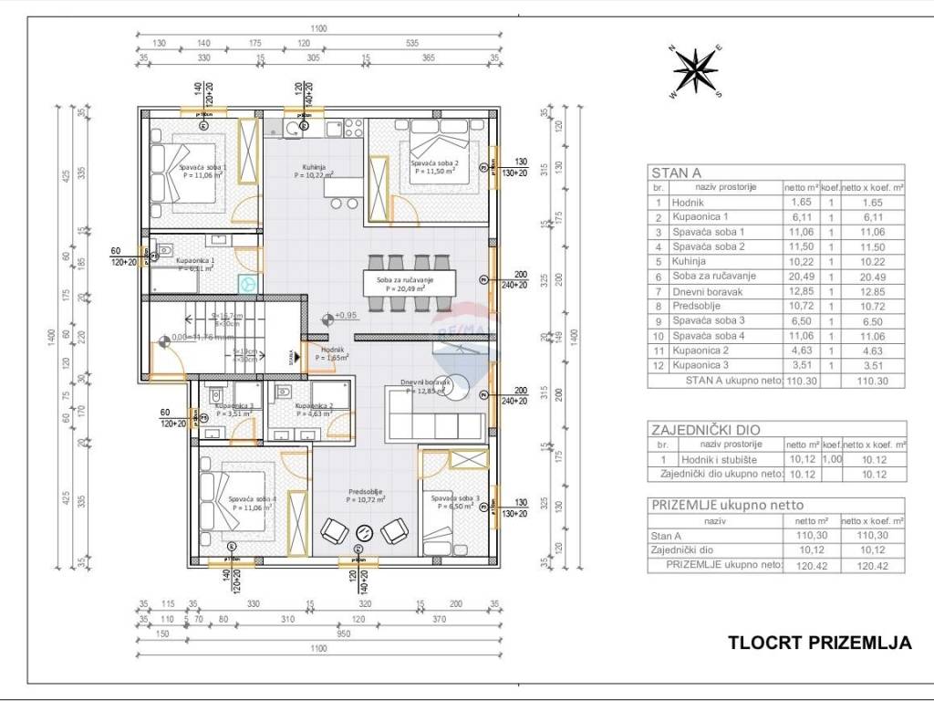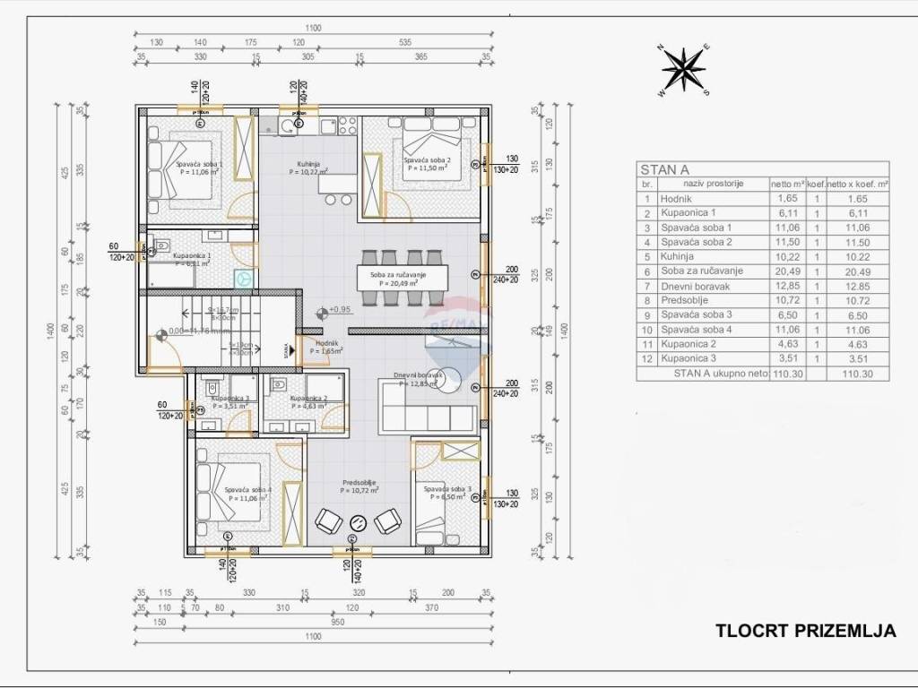 RE/MAX Centar nekretnina presents a high-quality four-bedroom apartment – marked as unit C, with a total area of 110.30 m², located on the ground floor of a modern new building.