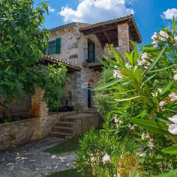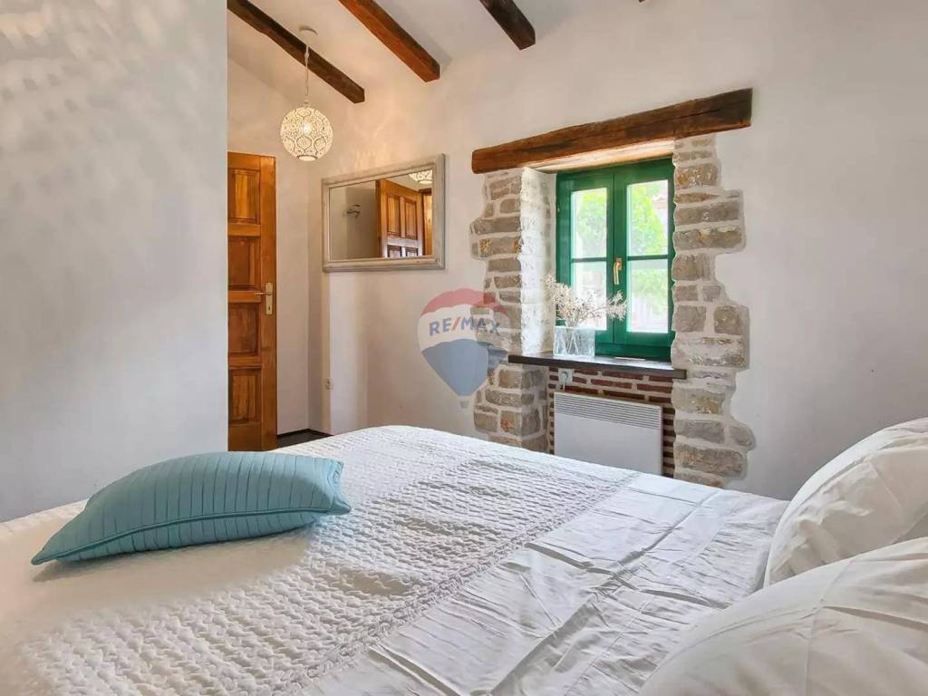 The detached villa is located on a stone-fenced plot offering complete privacy and a pleasant atmosphere. The villa consists of a ground floor and first floor, fully furnished with the main goal of preserving the true Istrian charm and comfort that a stone house provides. On the ground floor, there is a living room with a wood-burning fireplace, dining room, fully equipped kitchen, and a guest toilet. The floor is designed functionally and filled with natural light. Upstairs, there are two comfortable bedrooms, one of which has a terrace with panoramic views, and a bathroom equipped with top-quality fittings, offering a practical layout for daily life or tourist stays.