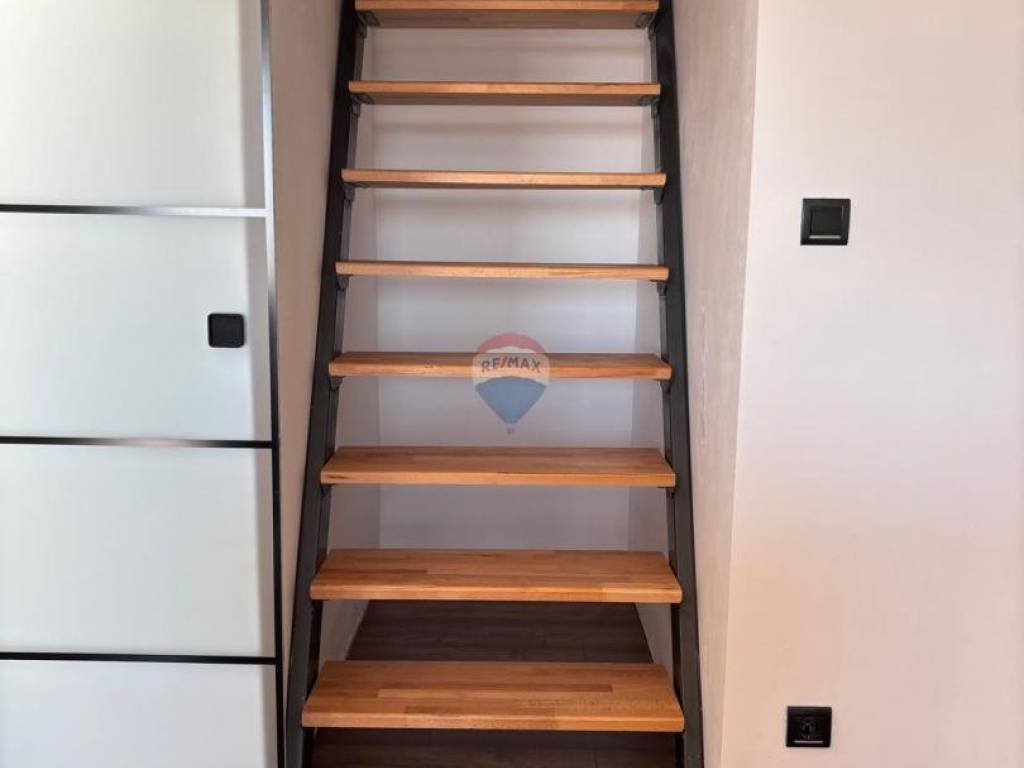 The apartment spans two floors. The first level includes an entrance hallway, dining area with kitchen, spacious living room, one bedroom, a walk-in wardrobe, a bathroom, and a balcony. The upper level – the attic – offers additional privacy and comfort, featuring two children’s bedrooms, a second bathroom, and a large rooftop terrace perfect for relaxing, sunbathing, or spending time with family and friends.