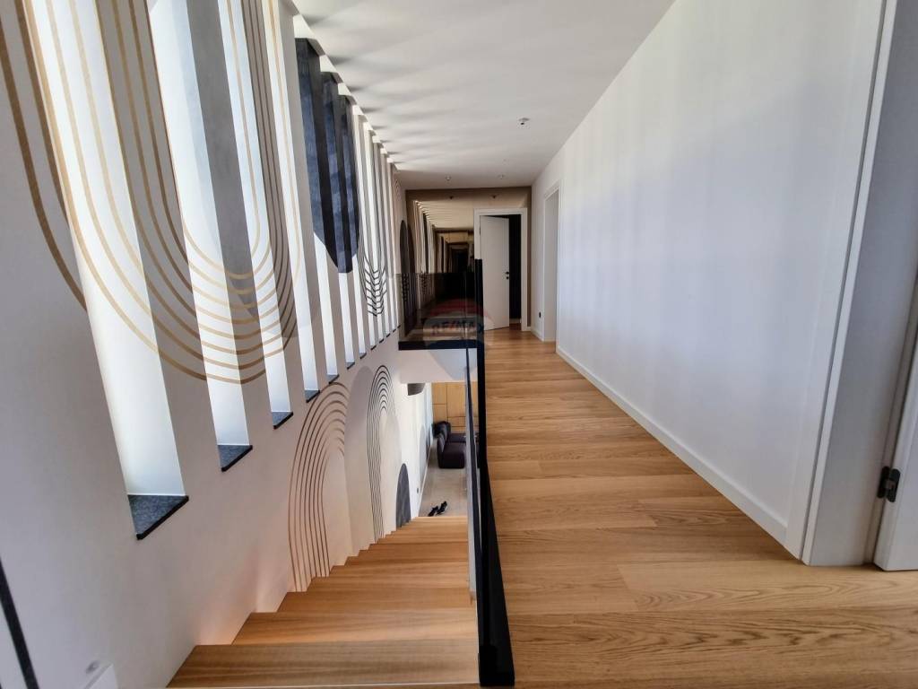 The staircase is made in the style of floating stairs with a steel substructure on which wooden treads are mounted, on each tread there is lighting that turns on when you reach the stairs. The pool is heated and made in the dimension of 10x3 meters with glass ceramic tiles and electrolysis.