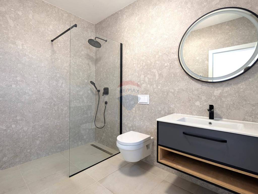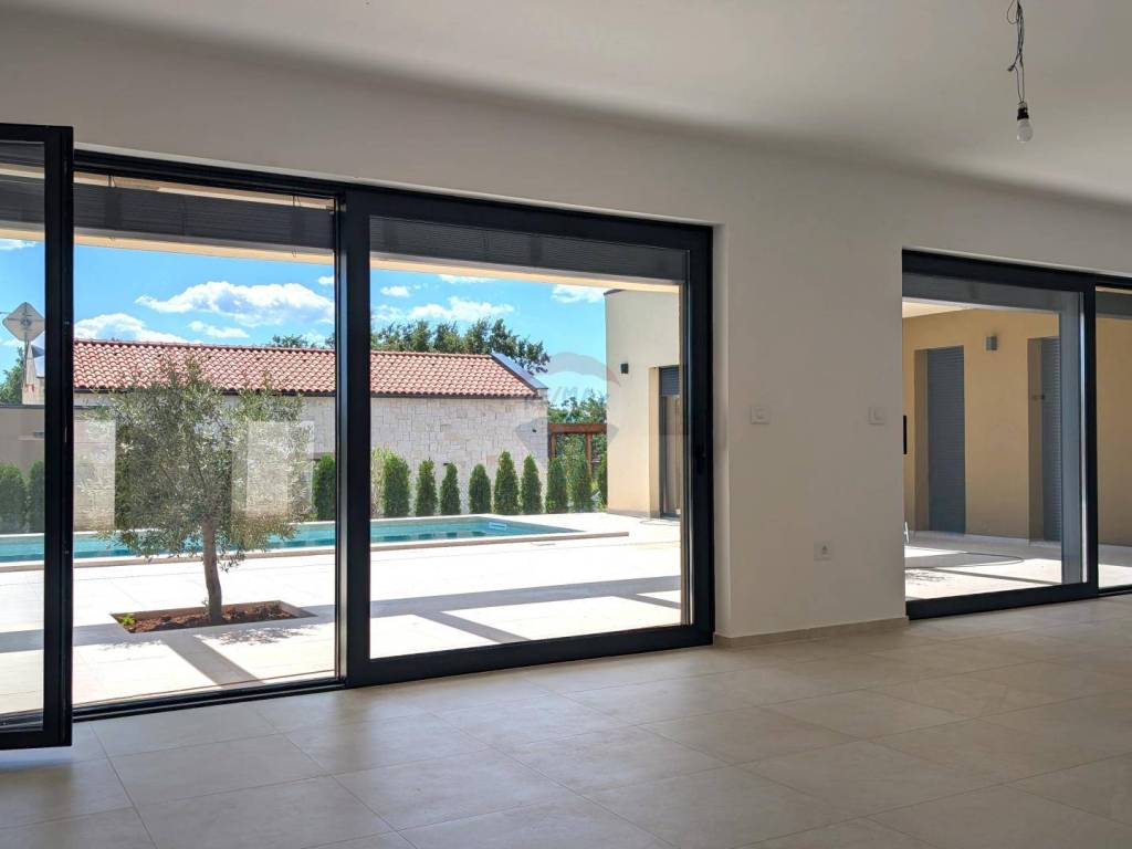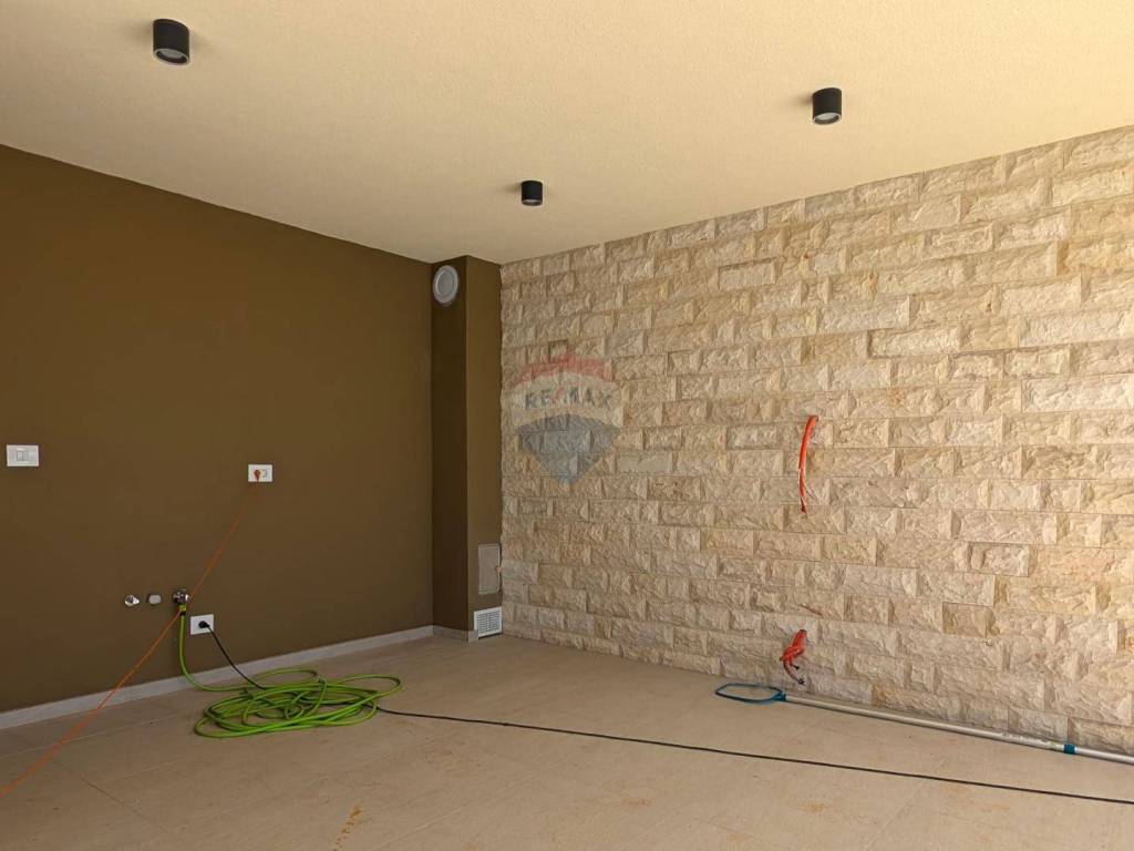 Next to the pool, there is a summer kitchen with another toilet. The house is equipped with high-end ceramics and sanitary ware, aluminum joinery with triple-glazed windows, electric shutters, underfloor heating in all rooms, and the entire property is air-conditioned via a heat pump system. The pool is heated and uses salt water.