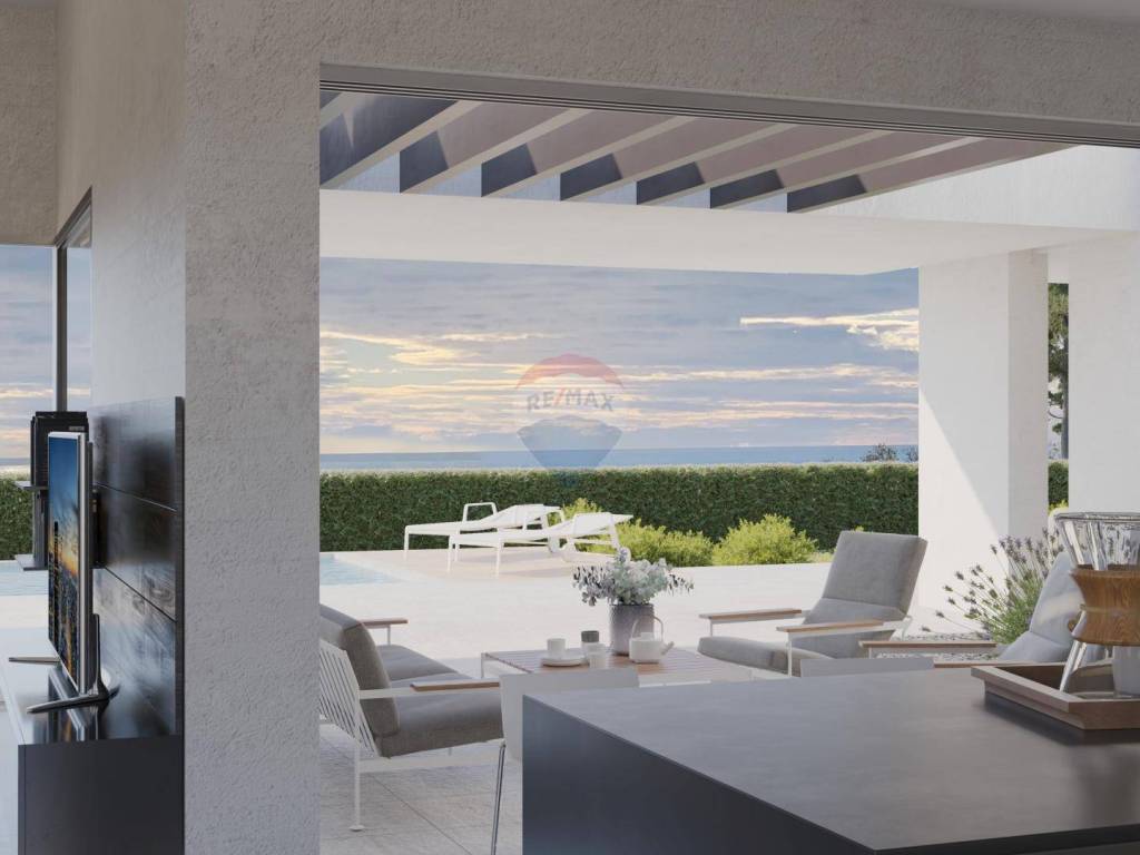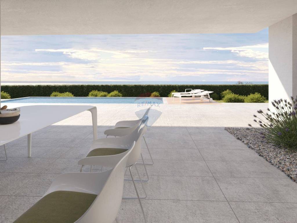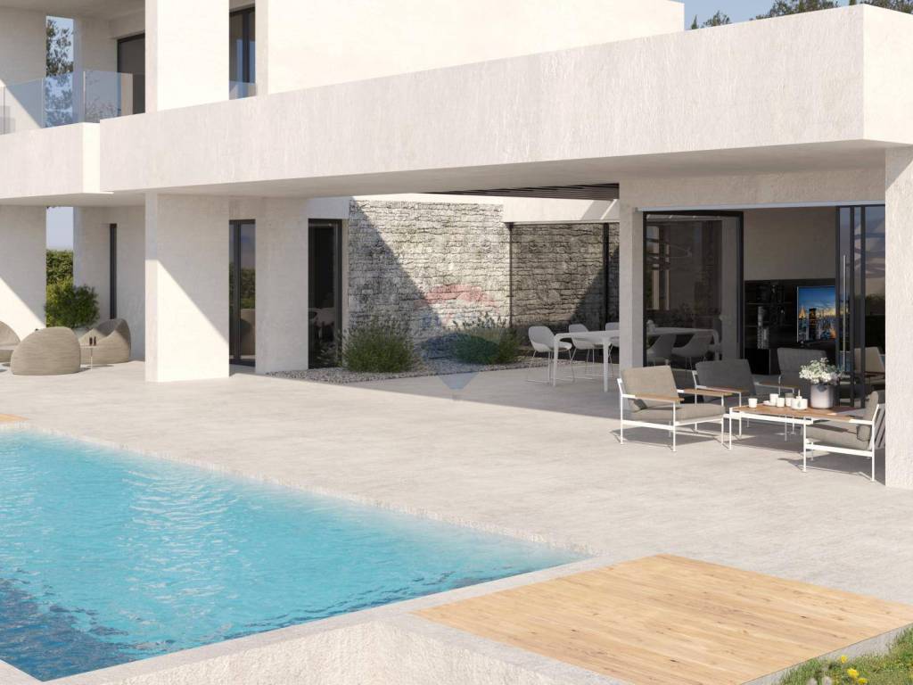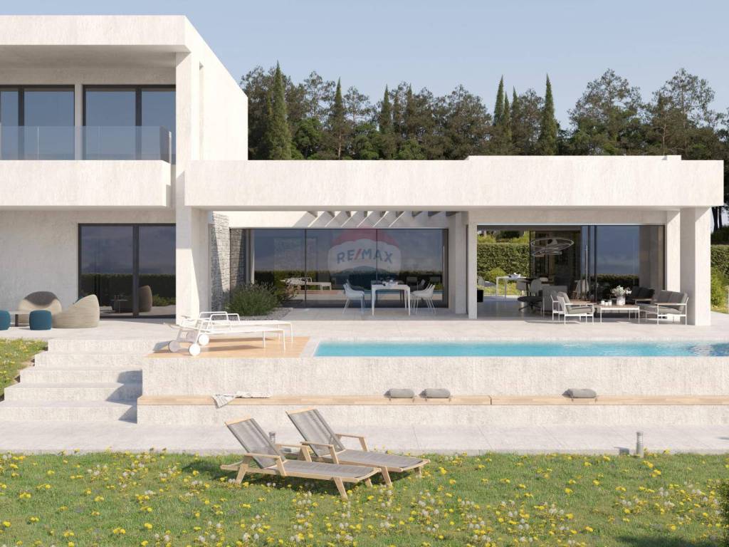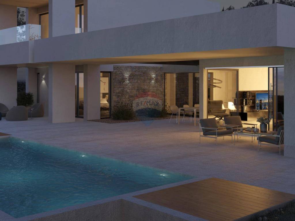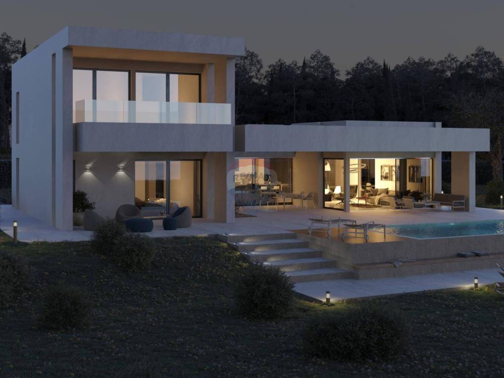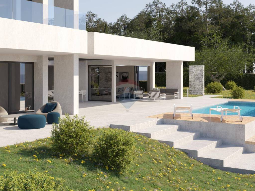 A beautiful, modern villa under construction on an area of 1260 m2 in a unique location, surrounded by olive groves and with a panoramic view of the sea, the Brijuna Islands and greenery.