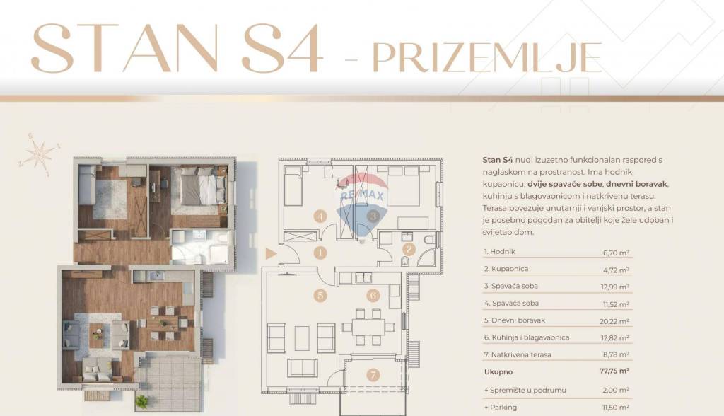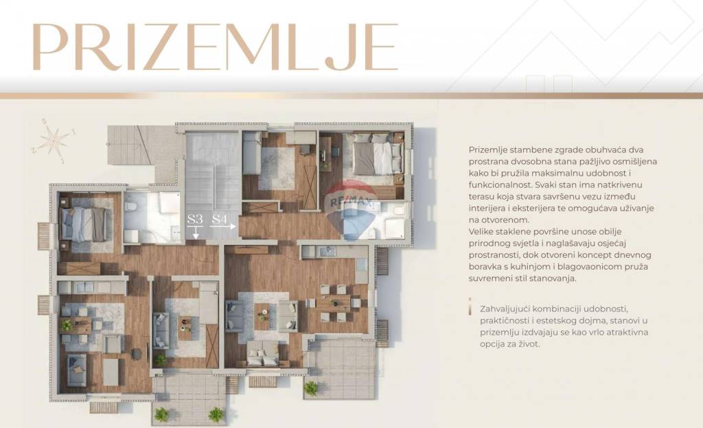 RE/MAX centar nekretnine offers a 2-bedroom + living room apartment of 77.75 m2 in a new building (2026) in a quiet location surrounded by greenery in Saršoni.