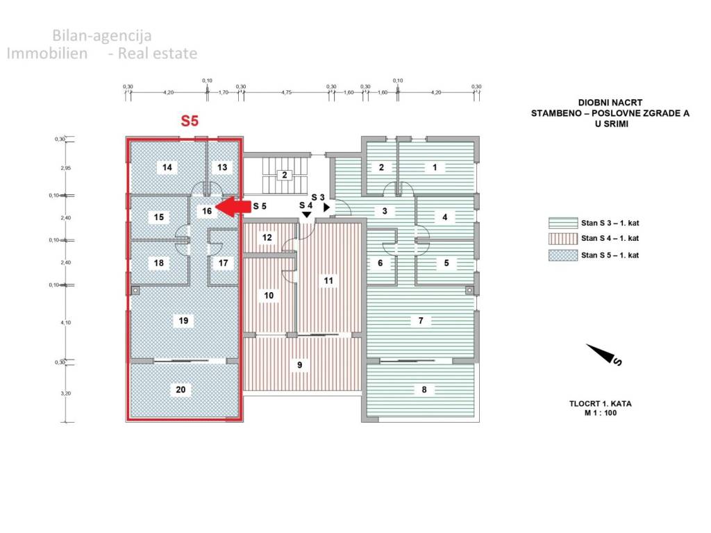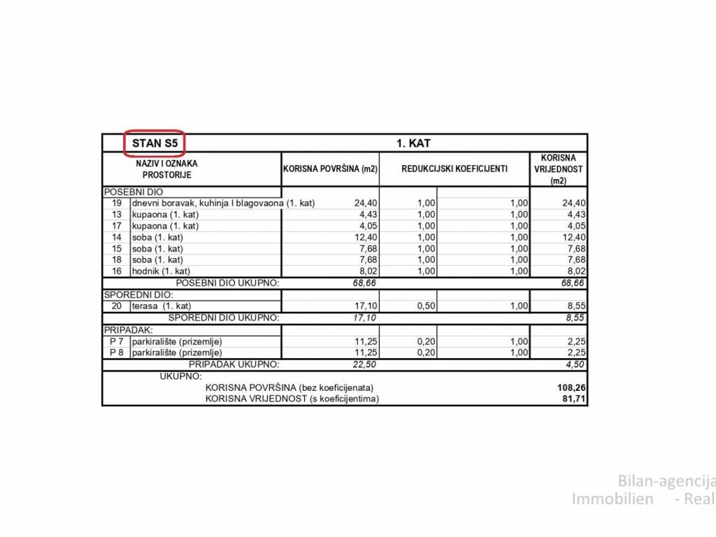 The apartment marked S-5 is located on the first floor of a building with a ground floor and two floors. It consists of 3 bedrooms, 2 bathrooms, kitchen-dining room-living room, hallway and terrace. The apartment has 2 parking spaces. The total and actual area of all of the above (apartment, terrace, parking lot) is 108.26 m2.