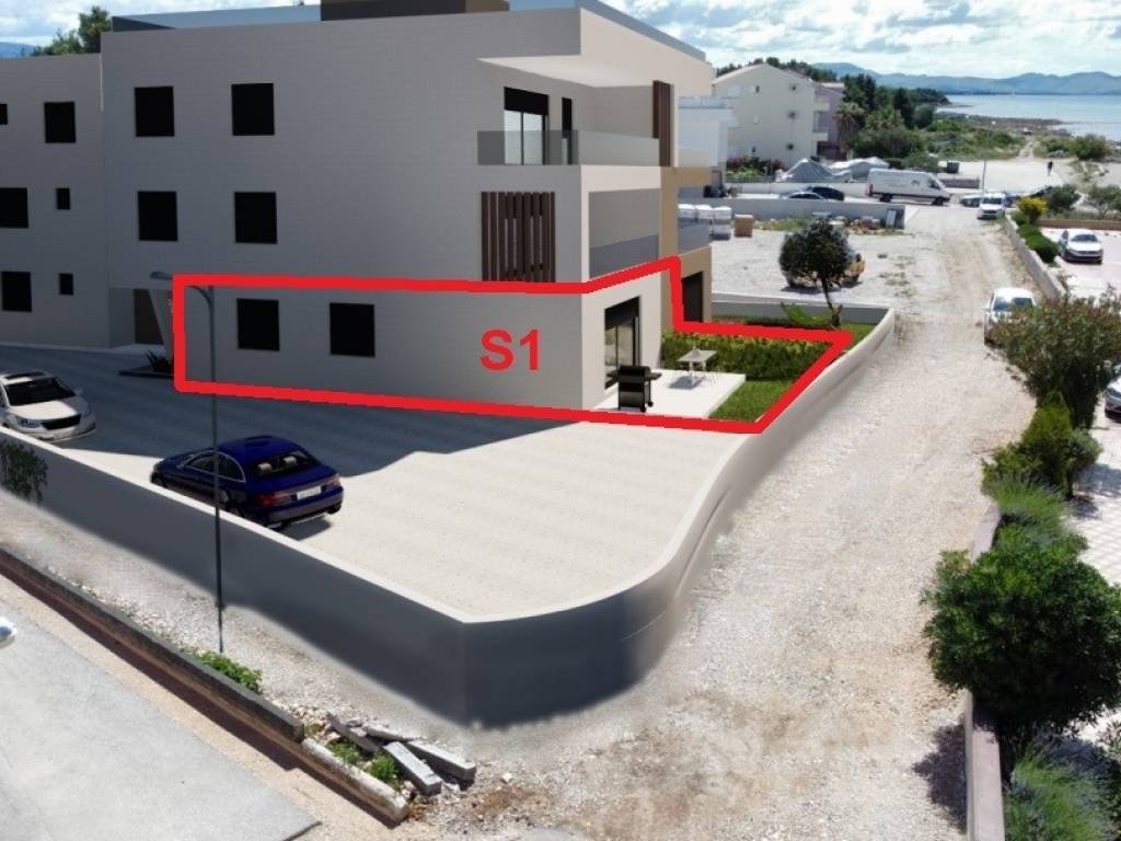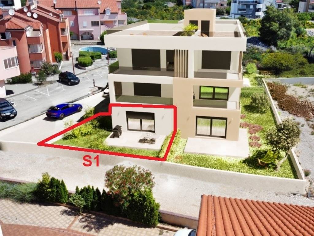 The apartment marked TS-S1 consists of 2 bedrooms, a hallway and anteroom, a kitchen-dining room-living room, 2 bathrooms, a terrace and a garden. The apartment has one parking space.