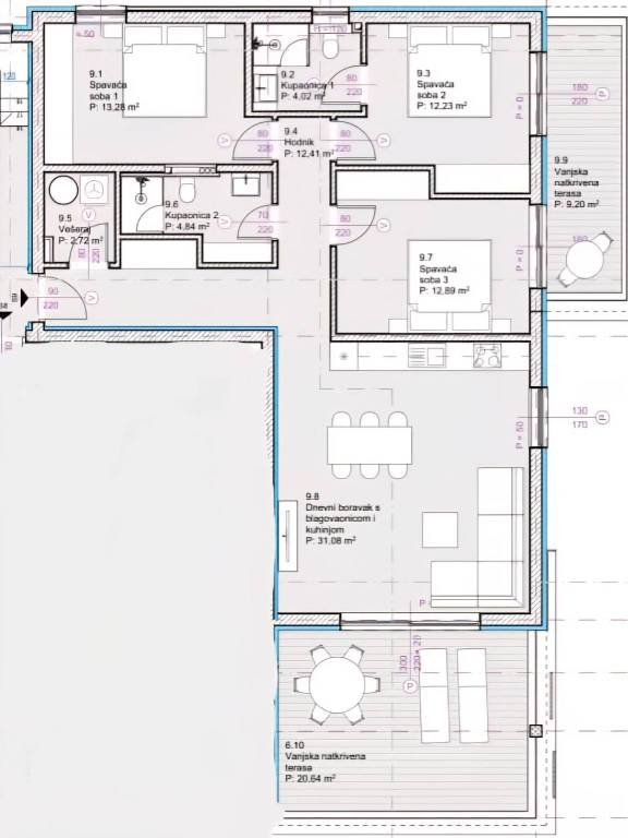 hodnika tri spavaće sobe, od kojih dvije imaju izlaz na natkrivenu terasu veličine 9,20 metara kvadratnih dvije kupaonice jednog vešeraja sa WC-om prostranog dnevnog boravka s blagovaonicom i kuhinjom izlaz na natkrivenu terasu ( 21 metara kvadratnih ) s pogledom na mjesto i more dva parking mjesta
