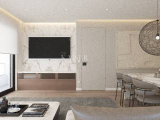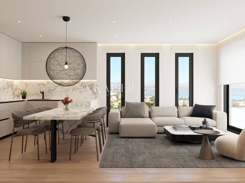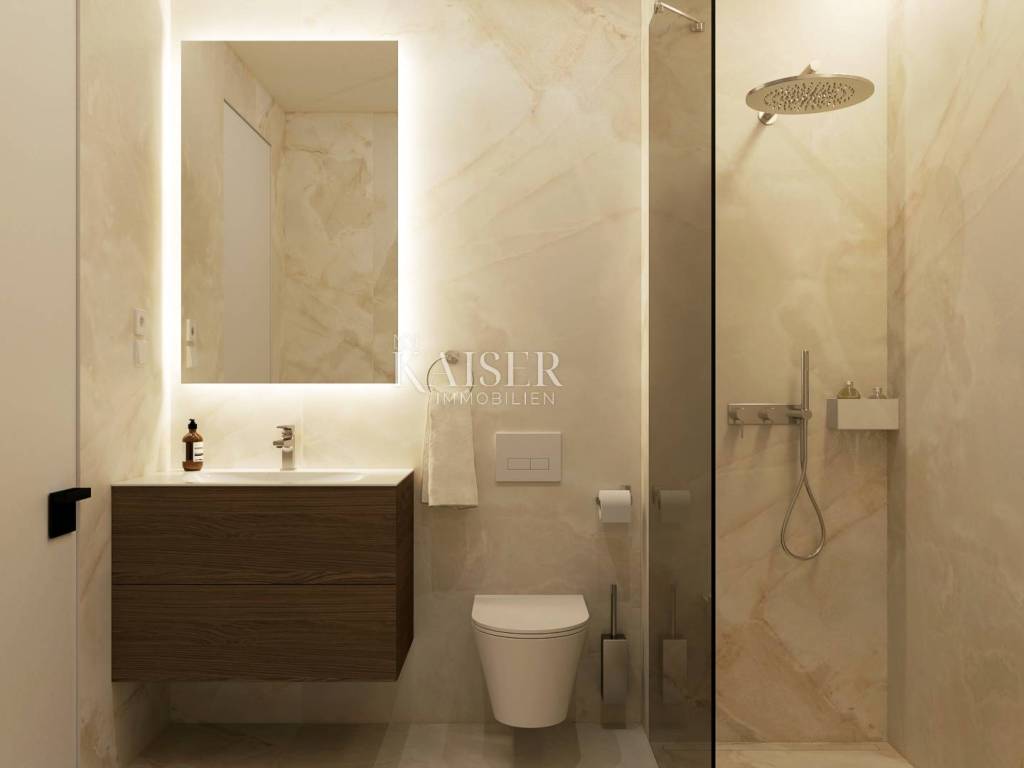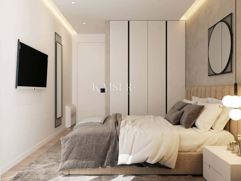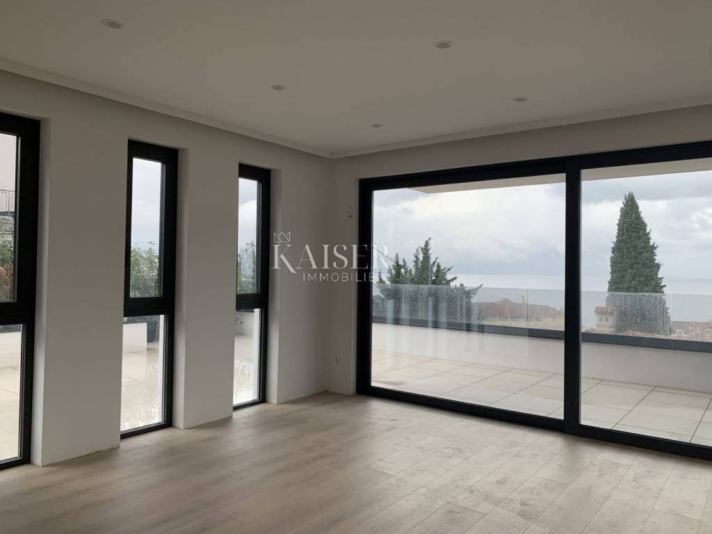 On the ground floor of a new building near the center of Opatija, Kaiser immobilie offers an exclusive apartment with a terrace and greenery of a well-maintained environment with a view towards the sea. Modern architecture of the building with quality materials and an elevator with which you can easily reach the apartment on the ground floor from the underground garage. The apartment consists of: hallway, living room with kitchen and dining room, two bedrooms, two bathrooms and pantry, storage room, two parking spaces, covered and uncovered terraces and green areas in a total area of 210.33 m2. The apartment has underfloor heating. electricity, and in addition there are air conditioners for temperature regulation in winter and summer. All amenities essential for life are within reach of the apartment, just 5 minutes' walk to the center, as well as the famous Opatija beach Slatina. If we don't want the hustle and bustle of Opatija's beaches, there is a communal pool with deckchairs in the garden with greenery and a view of the sea. Opatija is located close to Italy, Austria, and Slovenia, which makes the location interesting and quickly connected to the rest of Europe by highway. Ljubljana, Zagreb, Pula airports are 1 hour and 30 minutes away, and Krk airport is 40 minutes away. Vienna-Wien 5 hours by car, Trieste 1 hour, Ljubljana 1 hour-30 minutes, Zagreb 1 hour-30 minutes, Pula airport 1 hour-20 minutes, Krk airport 40 minutes, Berlin 10 hours. For additional information and a tour, contact your agent: Eli Lovko, mob: 0916133776; eli@kaiser-immobilien.hr Agency commission is 3% + VAT