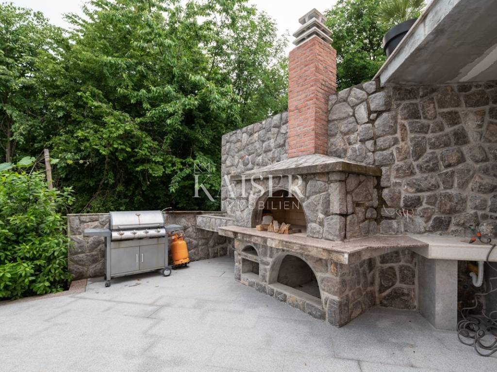 Kaiser Immobilien presents this beautiful family house with swimming pool. It is located in a quiet, pleasant location, only 10 minutes' drive from the center of Matulje and all necessary facilities. With a total area of 403 m² and an excellent layout of rooms, the house consists of several floors. In the basement there is a large garage with storage space. On the first floor there is a spacious and bright living room with access to the terrace and a kitchen with a dining area and access to the balcony. On the middle floor there are two bedrooms, each room has access to its own balcony and its own bathroom. On the last floor there is an attic apartment consisting of a living room, a kitchen and a dining area in an open space concept, with an exit to the balcony, two bathrooms with toilets and walk-in showers, and two bedrooms. Next to the house is a 525 m² garden with a swimming pool, jacuzzi, terrace with barbecue and space for socializing. Special attention was paid to the details (such as the fireplace in the living room, lighting fixtures throughout the house, artistic paintings, the choice of materials and color palette) and the selection of high-quality materials (parquet, tiles, furniture, kitchen appliances, etc.). The house is sold fully furnished and decorated.