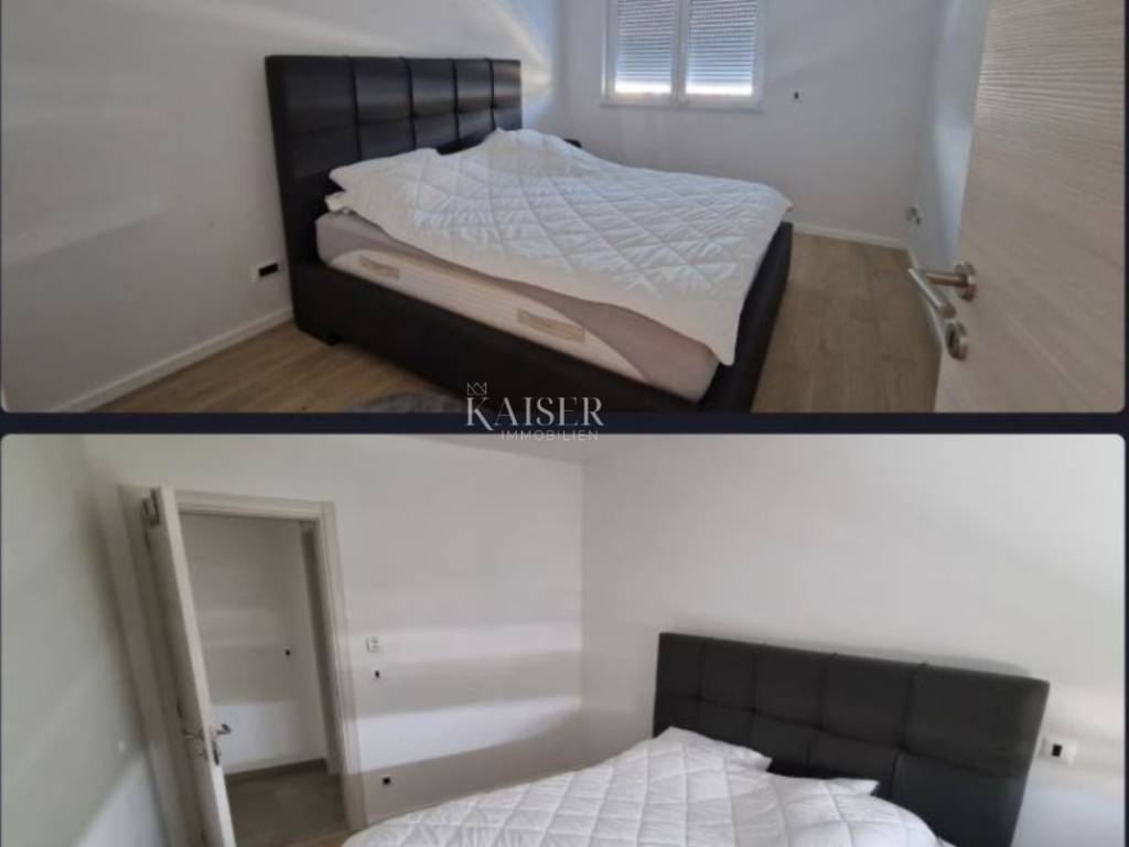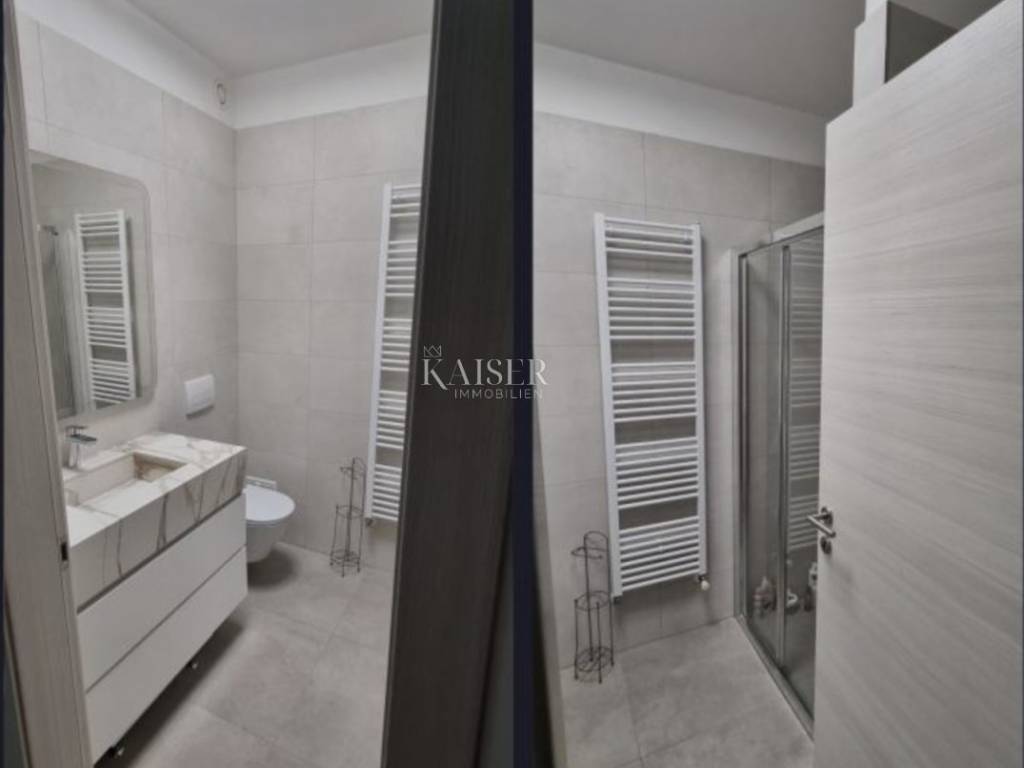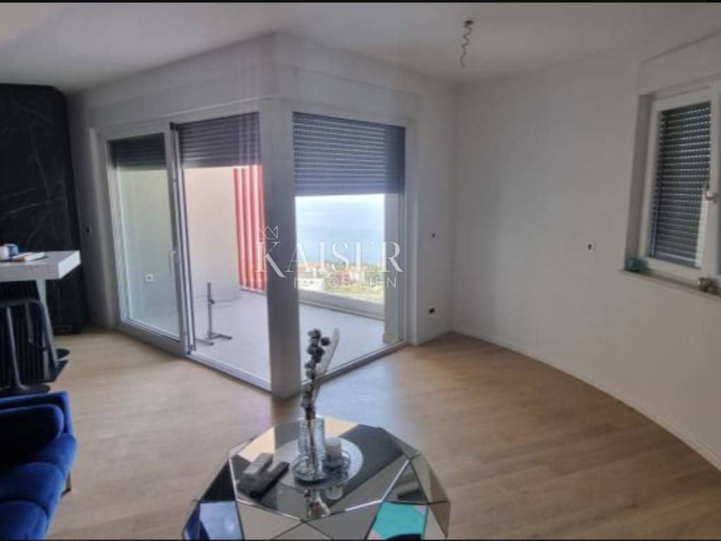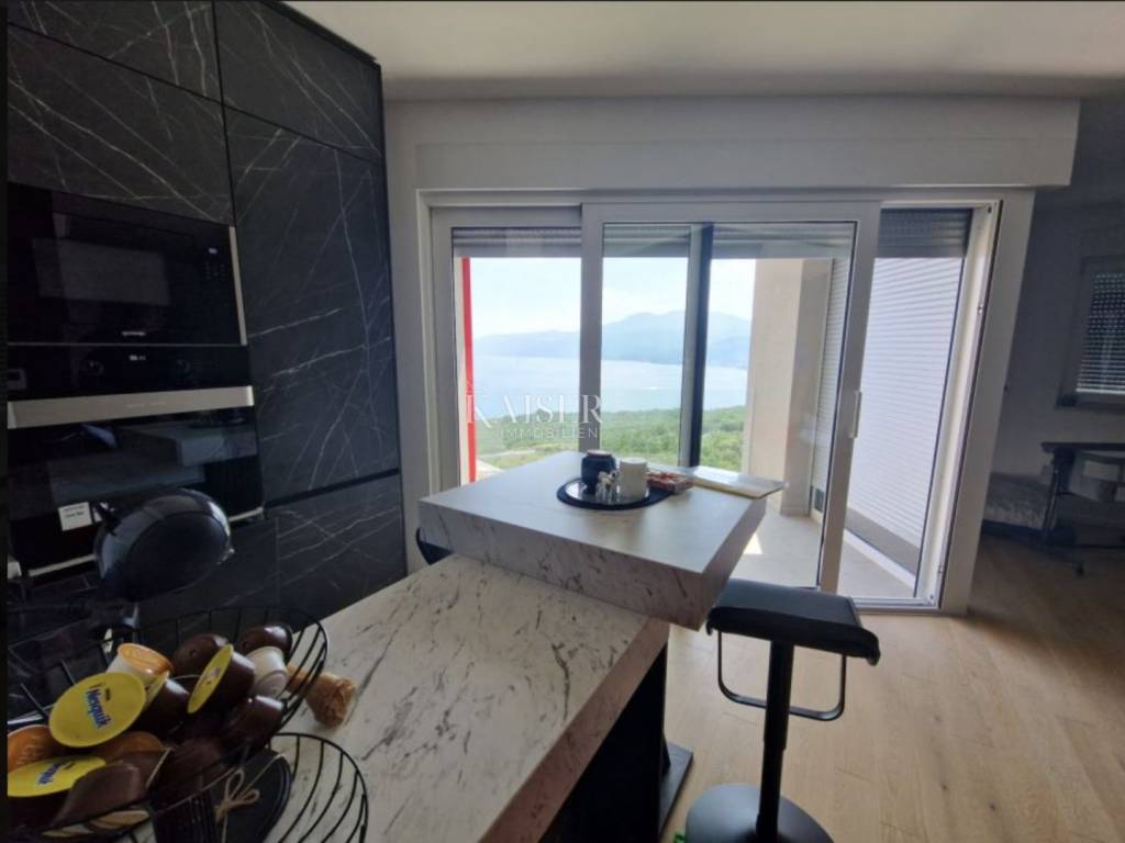 Kaiser Immobilien presents a modern furnished apartment in a new building on the 8th floor, with a total living area of 76.80m2. It consists of a kitchen with a dining room and a living room, two bedrooms, a bathroom, a hallway, a loggia and a storage room. The smaller room is arranged as a walk-in closet with the possibility of adding a smaller 90x200 bed or a desk. The apartment is oriented on both sides to the north and north-west. Of course, the dominant northwest orientation ensures plenty of sun in the living room during the afternoon hours, from which there is access to the loggia with a wonderful view of the sea. From the loggia there is a beautiful panoramic view of Opatija, the Rijeka Bay and the islands, and the hilly hinterland. The bedrooms are oriented towards the north. The apartment is completely covered with underfloor heating. Each room has its own thermostat. The building is equipped with a video intercom. Air conditioning is installed in the living room. The building is equipped with video surveillance and a fire alarm system. The price includes complete furniture and all household appliances. The apartment has two garage parking spaces with a total area of 25m2. For additional information, contact us with confidence on the phone number +385 914100031, or on the email address: romana@kaiser-immobilien.hr.
