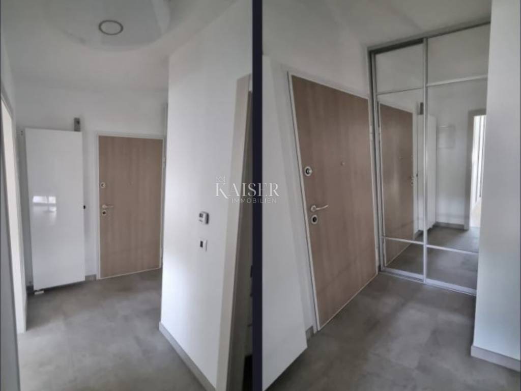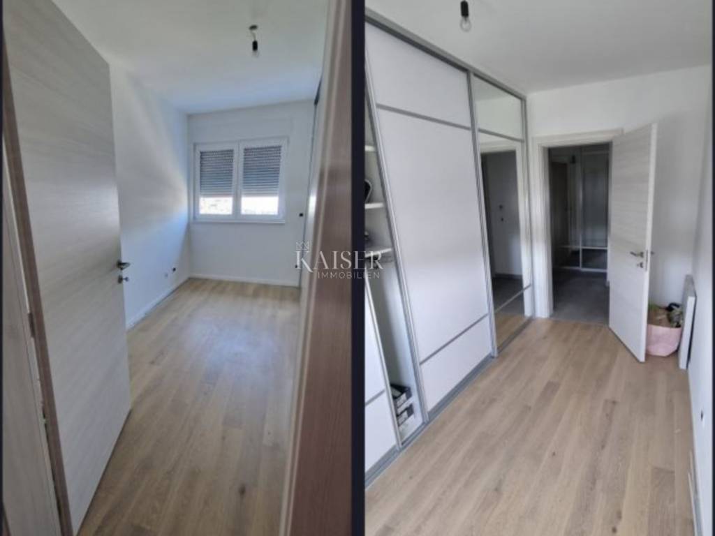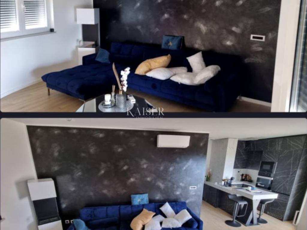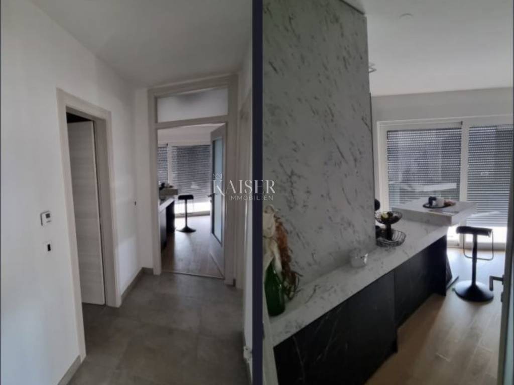 Kaiser Immobilien presents a modern furnished apartment in a new building on the 8th floor, with a total living area of 76.80m2. It consists of a kitchen with a dining room and a living room, two bedrooms, a bathroom, a hallway, a loggia and a storage room. The smaller room is arranged as a walk-in closet with the possibility of adding a smaller 90x200 bed or a desk. The apartment is oriented on both sides to the north and north-west. Of course, the dominant northwest orientation ensures plenty of sun in the living room during the afternoon hours, from which there is access to the loggia with a wonderful view of the sea. From the loggia there is a beautiful panoramic view of Opatija, the Rijeka Bay and the islands, and the hilly hinterland. The bedrooms are oriented towards the north. The apartment is completely covered with underfloor heating. Each room has its own thermostat. The building is equipped with a video intercom. Air conditioning is installed in the living room. The building is equipped with video surveillance and a fire alarm system. The price includes complete furniture and all household appliances. The apartment has two garage parking spaces with a total area of 25m2. For additional information, contact us with confidence on the phone number +385 914100031, or on the email address: romana@kaiser-immobilien.hr.