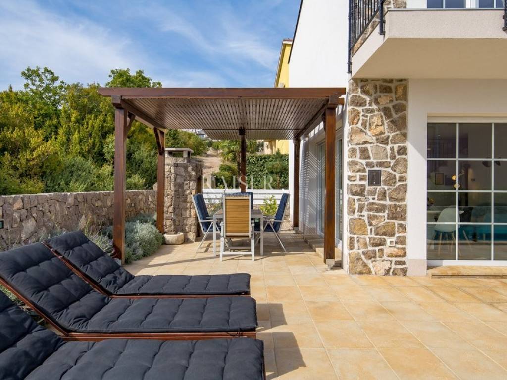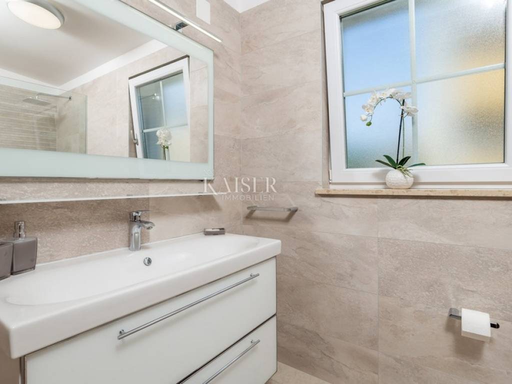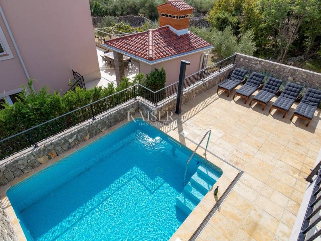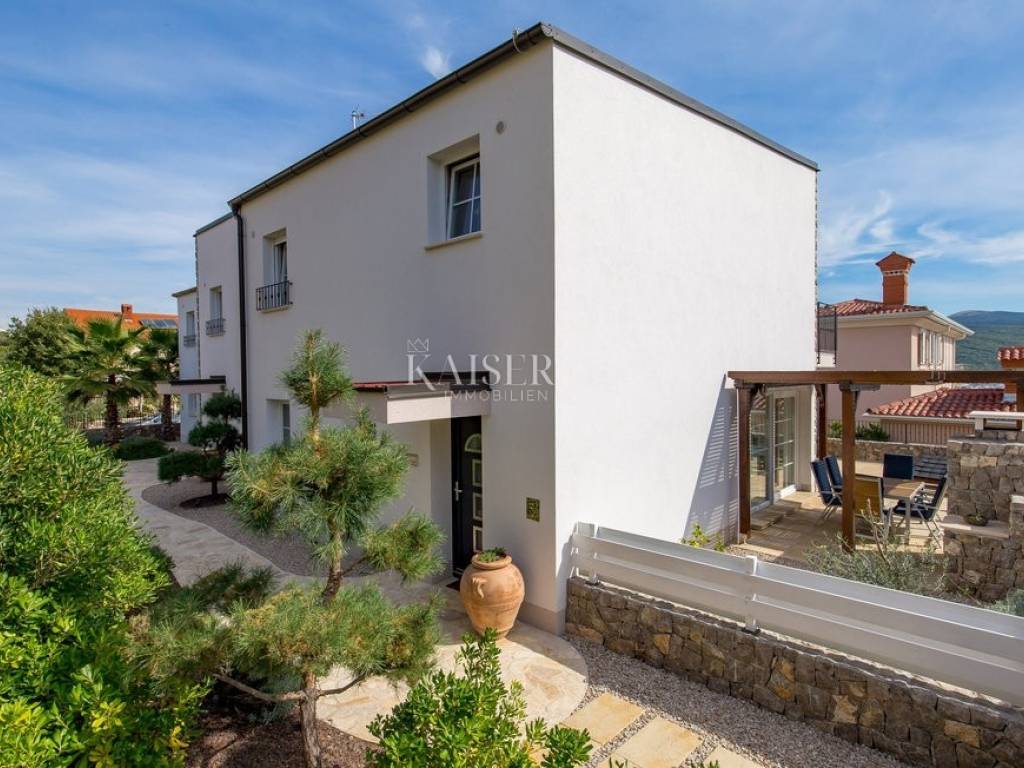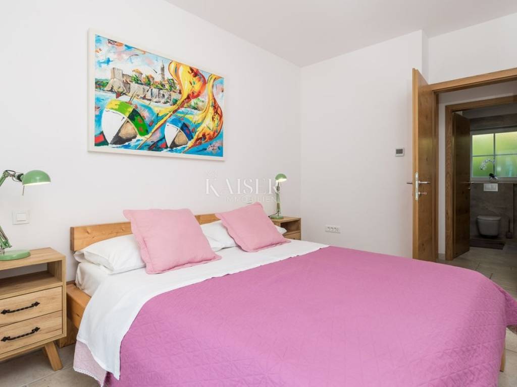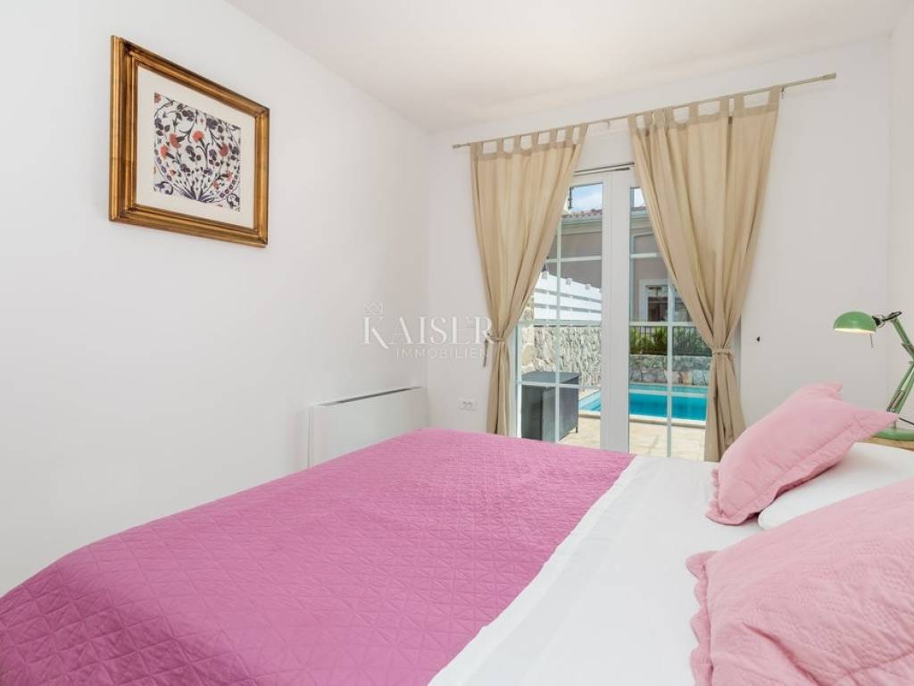 Kornić is a small town on the island of Krk, the first written mention of Kornić dates back to 1503. Kornić has approximately 350 permanent residents and is located about 6 km from the town of Krk and 3 km from Punt. Kornić has a beautiful view of Puntarska Vala and the islet of Košljun with the Franciscan monastery. This place offers rest and peace, idyllic nature and beautifully decorated beaches with a lot of facilities and is an ideal starting point for discovering the island, because all the bigger places on the island are really within reach from Kornić. Kaiser Immobilien presents you a beautiful two-story villa with a total living area of 110.23 m². This modern and spacious apartment offers everything you need for a comfortable and luxurious life, with the added advantage that all the new furniture remains in the apartment, allowing you to move in immediately and enjoy your new home. On the ground floor, with an area of 54.09 m², there is an entrance area, a fully equipped and modern kitchen, a dining room, a spacious living room, a space under the stairs, a hallway, a bathroom and one bedroom. The ground floor leads to a covered terrace of 5.38 m², ideal for relaxation. The first floor, which covers 54.53 m², contains two bedrooms, a wardrobe, a hallway and two more bathrooms. The first floor leads to a balcony of 2.70 m², which offers a beautiful view of the greenery and the sea. What makes this apartment stand out are the outdoor spaces. The apartment has a large terrace outside the building with an area of 51.51 m², perfect for enjoying the outdoors, and a garden with an area of 19.44 m², where you can create your own green corner. There is also an outdoor swimming pool with an area of 19.99 m², as well as an outdoor shower, which makes this space ideal for relaxation and fun during warm days, but also in winter due to the heating of the pool. Heating and cooling in the villa is ensured by underfloor heating and a heat pump, which guarantees pleasant temperatures throughout the year. The villa also has two parking spaces, each with an area of 12.50 m². This apartment represents a perfect combination of modern design, comfort and practicality, providing everything you need for a comfortable and luxurious life. Distances to facilities: Restaurant: 750m Shop: 600m Bakery: 250m Beach: 600m Marina Punat: 1.8 km Airport: 28 km Krk: 6 km Punat: 3km Distances to major cities: Kornić - Ljubljana: 150 km Kornić - Budapest: 500 km Kornić- Munich: 550 km Kornić- Vienna: 520 km Kornić- Prague: 850 km Agency commission for the buyer is 3% + VAT and is paid in case of real estate purchase, upon conclusion of the first legal deed. ID-CODE: 127-018 If you want to visit the property in person, please contact: Jennifer Hofmann E-mail: jennifer@kaiser-immobilien.hr Phone: +385-91-515-0887 http://kaiser-immobilien.hr/