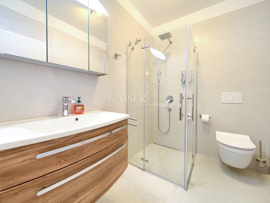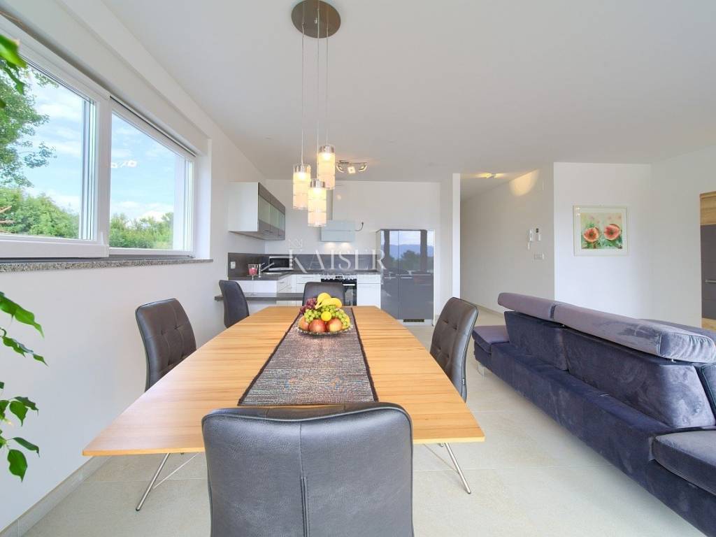 Linardići was founded in the 15th century when Prince Frankopan settled that part of the island. Today, about 138 inhabitants live in Linardići, who are mainly engaged in agriculture, olive growing, and more recently tourism. Kaiser Immobilien presents you a luxurious villa with an area of 410m2, located in a quiet location with a beautiful view of the sea. It consists of four separate apartments, distributed on the ground and first floor, and an additional large basement. The ground floor of this villa offers two separate apartments. The first apartment, with a total area of 83.08m2, consists of a spacious entrance area of 12.48m2, a modern bathroom with a shower of 4.41m2, two bedrooms of 11.22m2 each, and an additional bathroom with a shower and a toilet of 5, 94m2. At the end of the corridor there is a spacious living room with an open kitchen and dining room of 33.50 m2, which leads to a covered terrace of 13.60 m2. The second apartment on the ground floor, with an area of 78.88 m2, has a similar layout, but includes an additional storage room of 2.89 m2. The entrance area of this apartment is 8.72m2, and the bathrooms are 4.41m2 and 5.94m2. The bedrooms are 11.22m2 and 10.26m2. Living room with kitchen and dining room, also 33.50m2, leads to a terrace of 9.70m2 with direct access to the heated pool measuring 8x4m and a parking space. There are two more apartments on the first floor. The third apartment has a total area of 84.39m2, with an entrance area of 12.48m2, two bathrooms (4.41m2 and 5.94m2), and two bedrooms of 11.22m2 each. The living room with kitchen and dining room occupies 30.21 m2, and from the living room you can access a spacious balcony of 17.82 m2 with an enchanting view of the sea and the island of Cres. The fourth apartment, with an area of 81.46 m2, consists of an entrance area of 8.72 m2, two bathrooms (5.94 m2 and 4.41 m2), and bedrooms of 11.22 m2 and 10.26 m2, one of which offers a beautiful view of the sea . The living room of 33.50 m2 with kitchen and dining room leads to the balcony of 9.03 m2, where you can enjoy unforgettable sunsets. The villa has a total of 12 rooms, of which 8 are bedrooms and 8 bathrooms. Each apartment has one parking space, and the spacious garden of 600 m2 provides additional parking spaces. The apartments are categorized with 5 stars, and considering occupancy during four months of the year, it represents an excellent investment opportunity. The special feature of the villa is the high-quality construction according to German standards and the luxurious furniture that remains with the purchase. The villa also boasts a large basement of 59.18m2, which is currently used as an office, but offers numerous possibilities for other uses. The yard includes a covered terrace that serves as a covered parking lot in the winter, and as a space for socializing in the summer, with an outdoor kitchen and barbecue. The pool equipment is located in a separate room under the pool, which can also serve as an additional storage space. A comfortable temperature in winter and summer in the villa is provided by 12 air conditioners for heating and cooling, as well as underfloor heating through a solar thermal power plant, which enables ecologically sustainable and energy-efficient heating. All apartments are equipped with PVC windows and doors with three-layer glass. It is also possible to buy individual apartments.