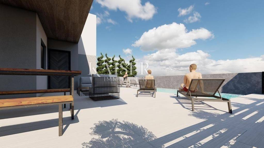 Kaiser Immobilien has the honor to present you floors in a luxury villa under construction with four apartments, in Nova Vasa near Poreč. The apartments are spread over 2 floors and consist of a hallway, three bedrooms, three bathrooms, a toilet, a living room, a kitchen and a dining room. Each apartment has a terrace on the ground floor, and a balcony on the first floor. All apartments will be heated with a system of heat pumps, and will be equipped with a swimming pool and a jacuzzi. The expected completion of construction is the twelfth month of 2023.