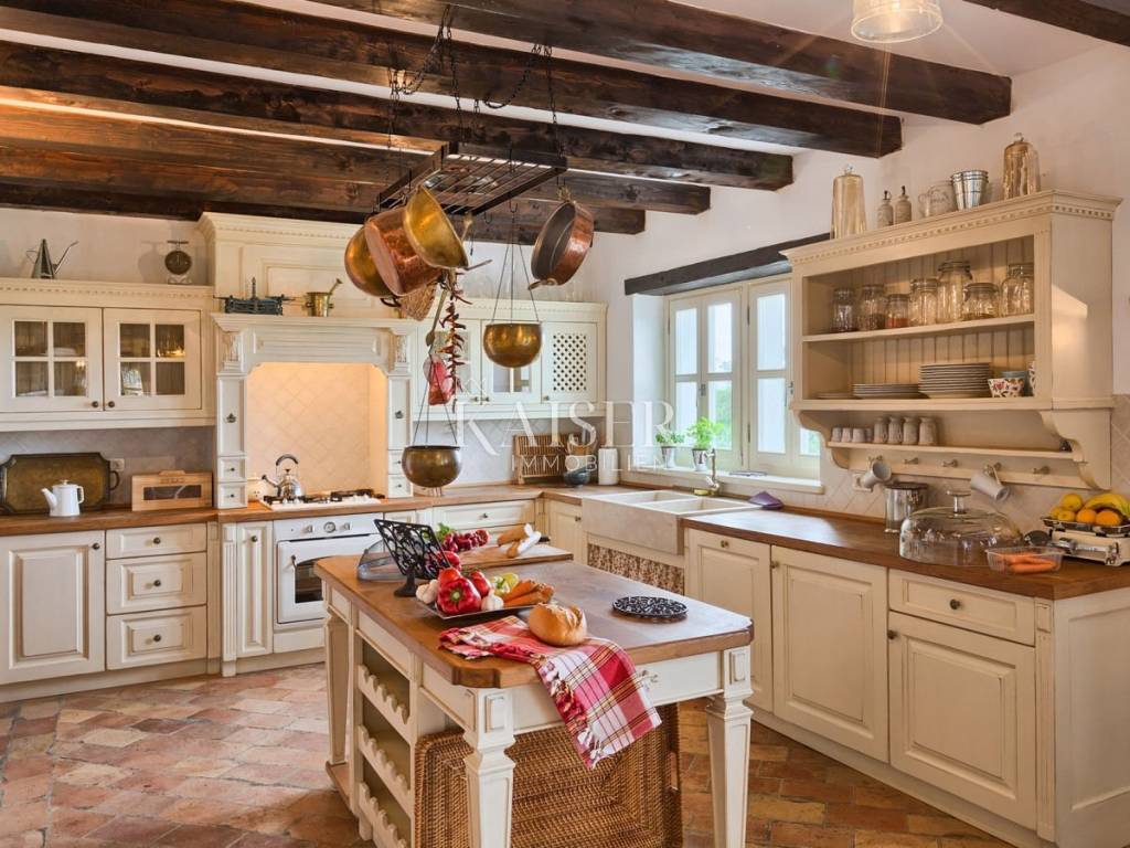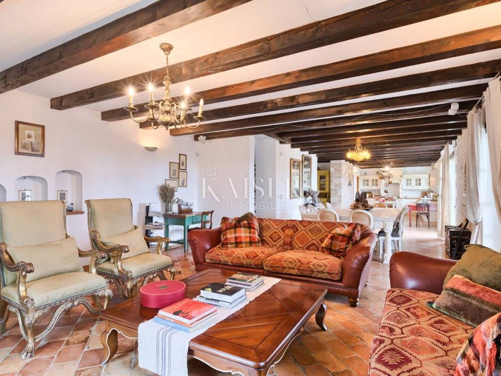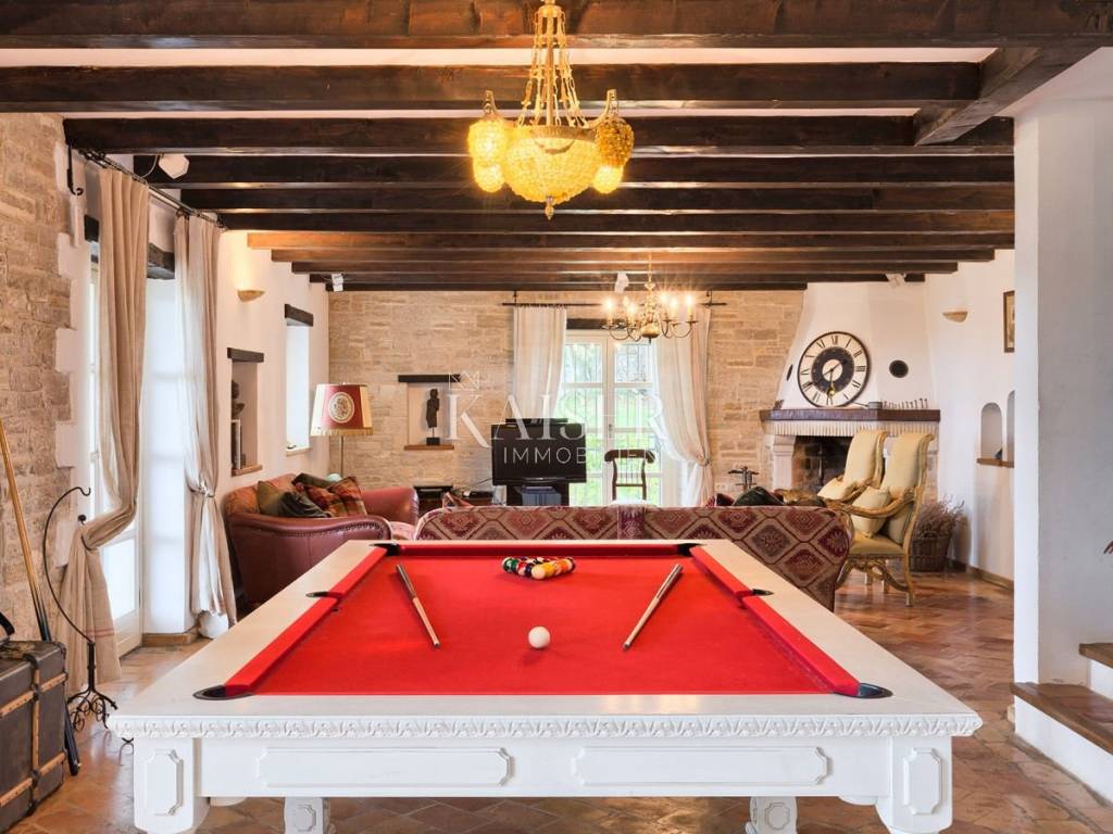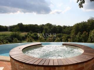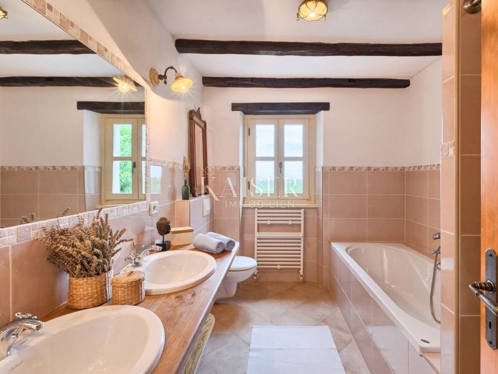 Kaiser Immobilien offers a beautiful house built from local stone and natural materials. It is in complete harmony with the landscape and is adapted to traditional architecture. It is a house with a net area of 215 m2, which covers the ground floor and the first floor. The ground floor offers a spacious open concept layout of the kitchen, living room and dining room. There are three bedrooms on the first floor. All rooms have ceiling fans, bathrooms and a large shared terrace in the shade. In addition, the house has an outdoor shower, a jacuzzi, a heated pool and a summer kitchen with a grill. The house is perfectly positioned to enjoy privacy and peace, but is well connected to cities such as Motovun, Hum, Pula, Livade, Grožnjan, Rovinj and many other places.