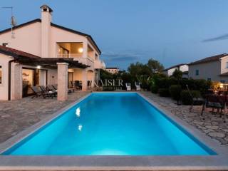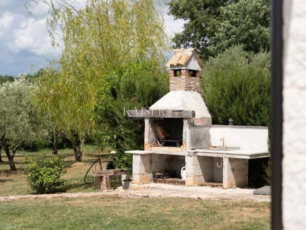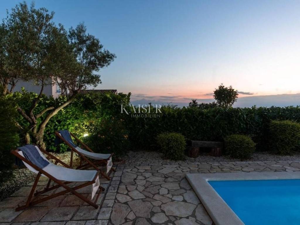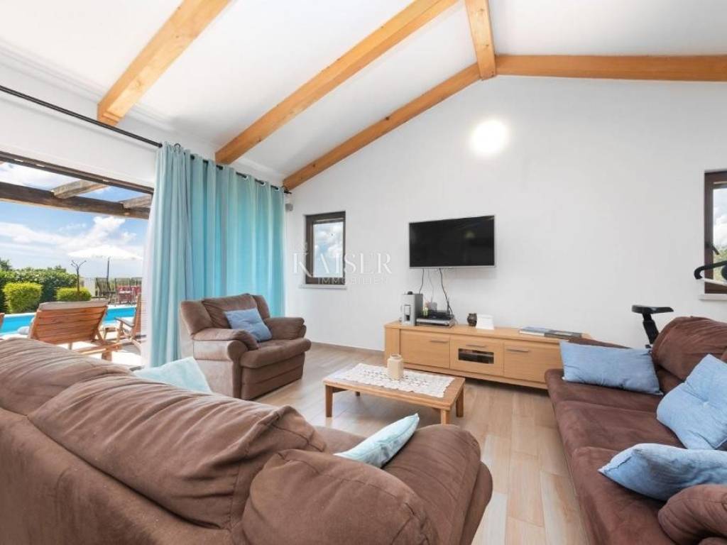 Kaiser Immobilien is selling a house with a swimming pool in a wonderful location with a panoramic view of the sea, nature and surrounding villages. It is located in a small village near Višnjan and only 13 km from Poreč and beautiful beaches. Višnjan is a beautiful town with all necessary facilities such as market, restaurant, cafe bar, bank, post office, clinic, pharmacy and many other facilities. On the ground floor there is a fully equipped open kitchen connected to the dining room and living room, as well as a bedroom with a double bed and a private bathroom. On the first floor there are two more beautifully decorated and spacious bedrooms, one with a double bed and one with two single beds. Both rooms have their own bathroom and balcony. Heating and cooling are provided by air conditioners in all rooms. Heating is also provided by a beautiful indoor fireplace and underfloor heating that is carried throughout the entire house. The terrace offers a beautiful view of the sea and the surrounding nature. You can enjoy all the mentioned beautiful scenes from the private pool of 36 m2, from the comfortable deckchairs around the pool or while preparing a meal on the outdoor grill. There is private parking for 2 vehicles on the 750 m2 garden. Ownership clear 1/1.