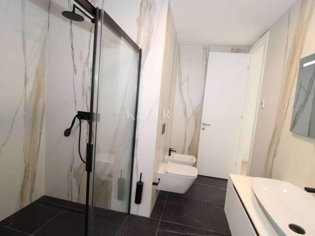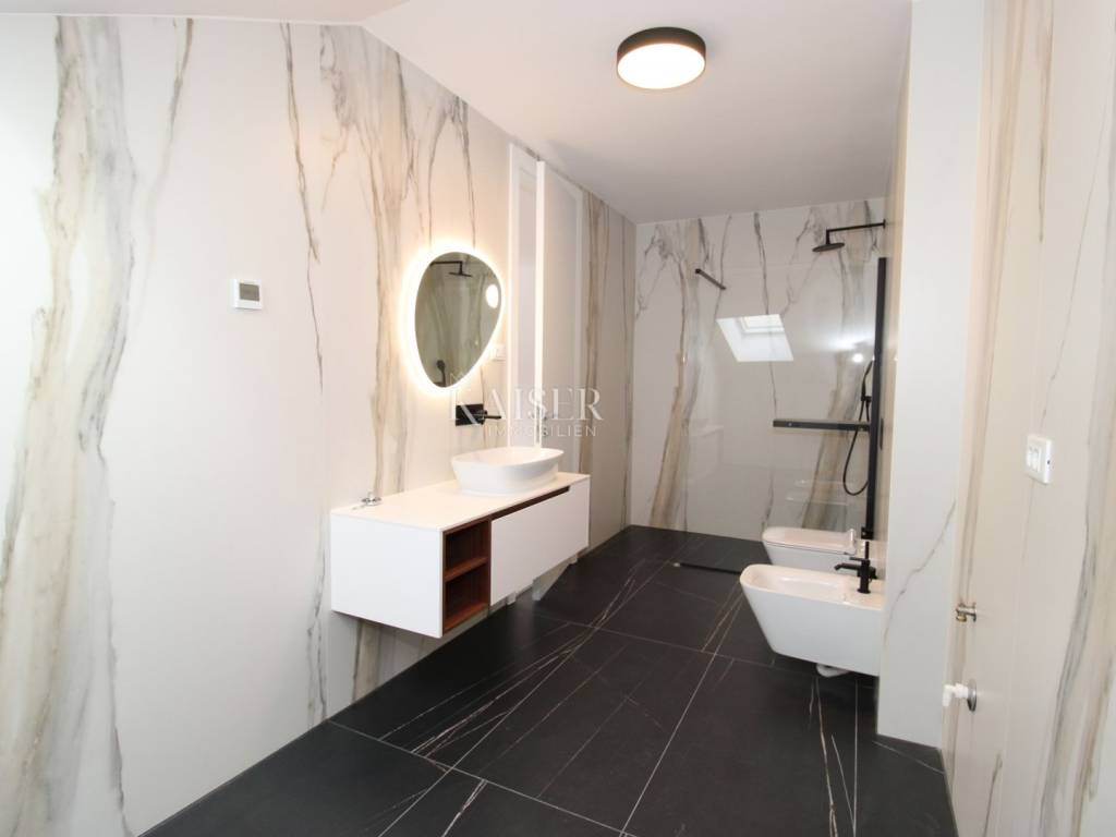 Near the center of Opatija, within easy reach of the famous promenade and Slatina, surrounded by natural greenery, there is a new building of modern design adapted to the terrain, standards and requirements of the new era. Penthouse on the last third floor and the roof covers an area of 545.79 m2 and offers us: living room with kitchen and dining room, three bedrooms, three bathrooms, wardrobe, hallway, toilet, large terrace, two balconies, staircase to the roof terraces, roof terrace, swimming pool, sun deck and storage on the roof, parking space 12.39 m2, parking space 12.50 m2, parking space 13.77 m2, all in the basement garage and parking space 12.50 m2 in the garden. The space is heated and cooled by fan coils, the most modern heating and cooling systems that provide complete comfort, and the bathrooms also have underfloor heating. We get to this floor by elevator directly into the space, and of course there is also a staircase option. In front of us opens the central part intended for the living room, kitchen and dining room with access to a large covered terrace and a view of the sea. On the left and right side of the central part, there are bedrooms with bathrooms and each one has access to a balcony and a terrace that also offers a beautiful view of the sea. The feature of this space is the large glass surfaces that visually and practically connect us with the surrounding space, giving us a feeling of spaciousness, as well as the materials used on the floor and bathrooms. Going out to the roof terrace via the stairs from the living room opens up a spectacular view of Opatija, Rijeka, the islands, Kvarner, and in which surroundings we can cool off on the outdoor roof pool in an area completely protected from other views. The entrance to the garage and the garage as well as the surroundings of the building are covered by video surveillance. At the back of the building there is a communal outdoor pool. The surroundings of the building are decorated with Mediterranean greenery and plants. The first beaches of Opatija are located approx. 500 meters away, and the center itself is about a 15-minute walk away. In addition to summer comfort, beautiful beaches, restaurants, outdoor entertainment, summer cinema, this destination also offers us the possibility of skiing on Platka and other winter joys in winter, which is only about 35-40 minutes away by car from our location. Convince yourself of what is offered by coming to the property that is offered to you. For all information, contact the agent. The excellent connection of Opatija with Rijeka, Zagreb, Trieste, Vienna, Munich, Ljubljana makes this place exceptional for life as well as business. Allow us to show you this excellent property by calling: Eli Lovko 00 385 91 6133776 eli@kaiser-immobilien.hr