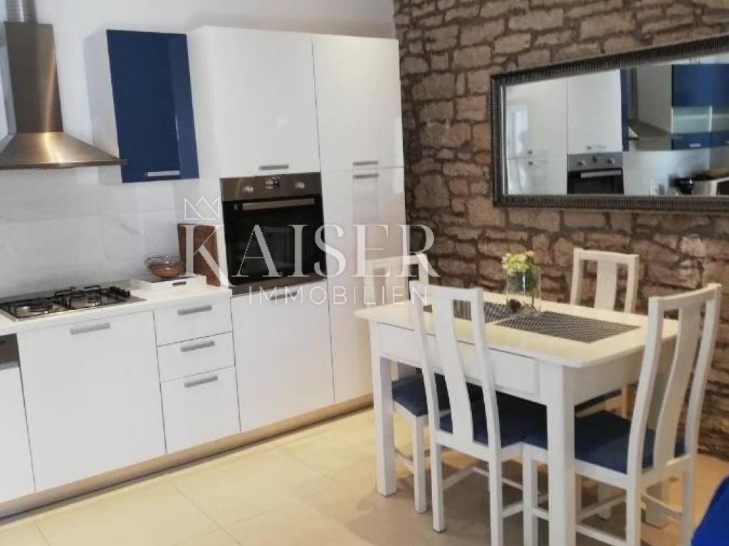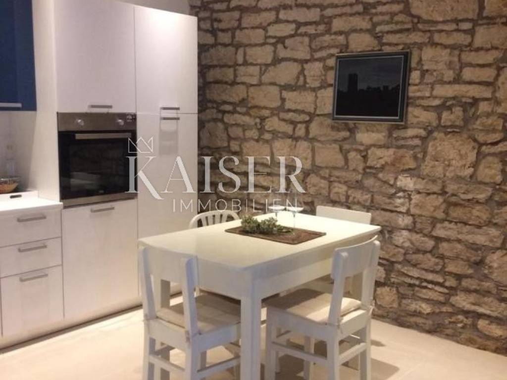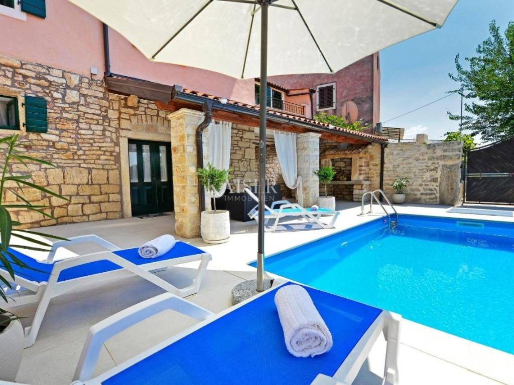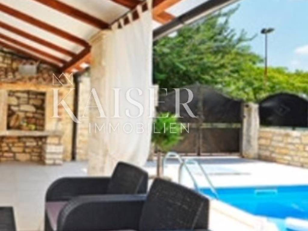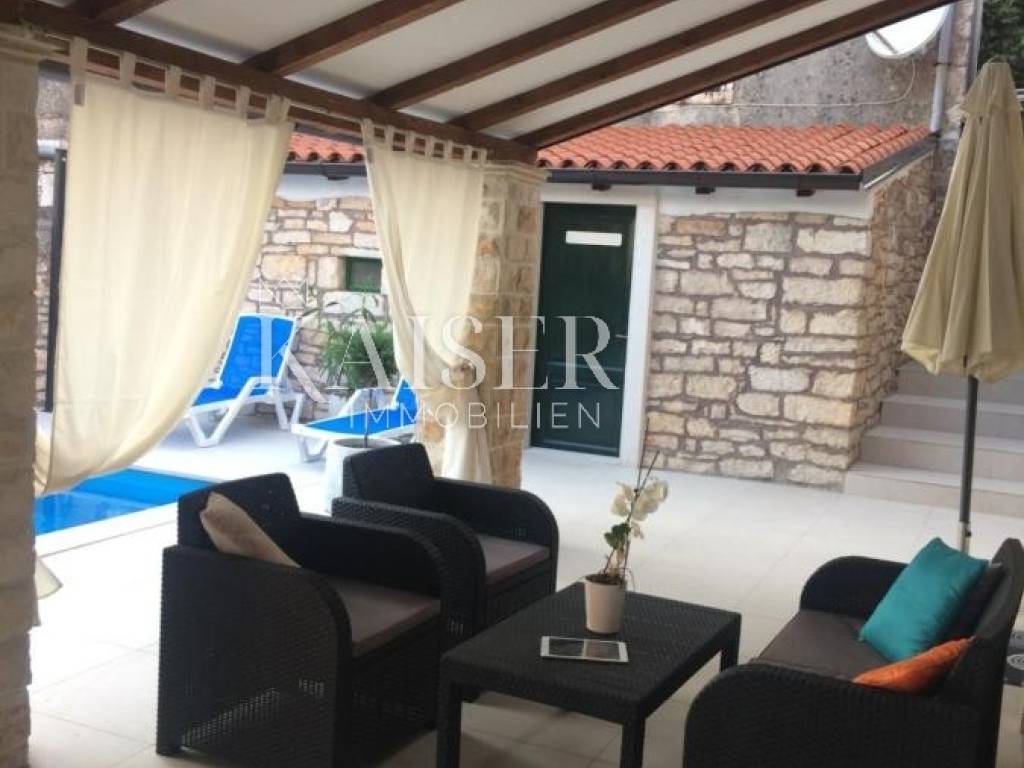 Kaiser Immobilien offers for sale a special villa, a real autochthonous, stone Istrian beauty. The villa is only 15 km from the city of Poreč, and is located in a small Istrian town, known for its historical architecture and wonderful location. In the vicinity of the villa there are all the necessary facilities such as a school, kindergarten, shop, restaurant, pharmacy, fitness studio and other necessary facilities. The specificity of this villa is that it was built before 1968 and was renovated in 2018. The villa was built entirely of stone, and since it is older than 1968, it is known that this type of construction was of high quality and provided excellent thermal insulation to the houses due to the thickness of the walls. Namely, these are old, solid stone walls that kept the heat in the houses in the winter, while they kept the houses cool and fresh in the summer. In this way, considerable savings are made on heating or cooling. The owners of this villa have taken care to preserve the true historical touch of antiquity in its autochthonousness, which is the original stone "Šterna" or so-called. water tank, which was historically used to preserve and store water for household needs. The wheelbarrow was specific to the Istrian region and not all households had it, because not everyone could afford to build a wheelbarrow in the olden times. The villa consists of ground and first floors. On the ground floor of the villa there is a large spacious living room, a spacious kitchen and a dining room. There are two options for heating the villa, it can be heated via an air conditioner or via a wood stove. In the living room there is a stove, as it used to be, and you can light a fire and enjoy the crackling sounds of the fire in the long winter evenings. On the floor of the villa there are two bedrooms, one larger room and one slightly smaller one, and two bathrooms that belong to the villas. The lower and upper floors are connected by real stone stairs, preserved as the autochthonous nature of the villa, as well as the stone walls of the villa. The villa is a combination of modern and indigenous. Outside the villa there is an outdoor kitchen, barbecue and stone sink, original from Istrian stone, as well as a table and chairs for outdoor dining. Next to it there is another small utility house that has one free space (it can be used for storing things), while in another space there are washing machines and other things. In front of the villa there is a swimming pool, next to which there is an outdoor shower and an area for lying down and relaxing. The villa has two entrances and exits from the yard and is completely surrounded by an Istrian stone wall, which gives you complete privacy. The very concept of the yard is laid out in such a way that minimal work and effort is required for mowing or maintaining the plants, the owners thought about this as well and paved the yard area for the most part, thus making the maintenance of the exterior of the villa much easier. This beautiful villa offers you an exceptional view of the sea and other settlements around it. A wonderful view can also be experienced in the evening hours when the fishermen of the city of Poreč go out to sea, and the illumination of the entire sea horizon, which is extremely visible from the terrace of this villa. The houses located near the villa are not inhabited every day, and do not cause any disturbance or discomfort to the owners of this villa. If you want this beautiful, original and safe stone villa to become your new home, contact the Kaiser Immobilien Poreč agency.