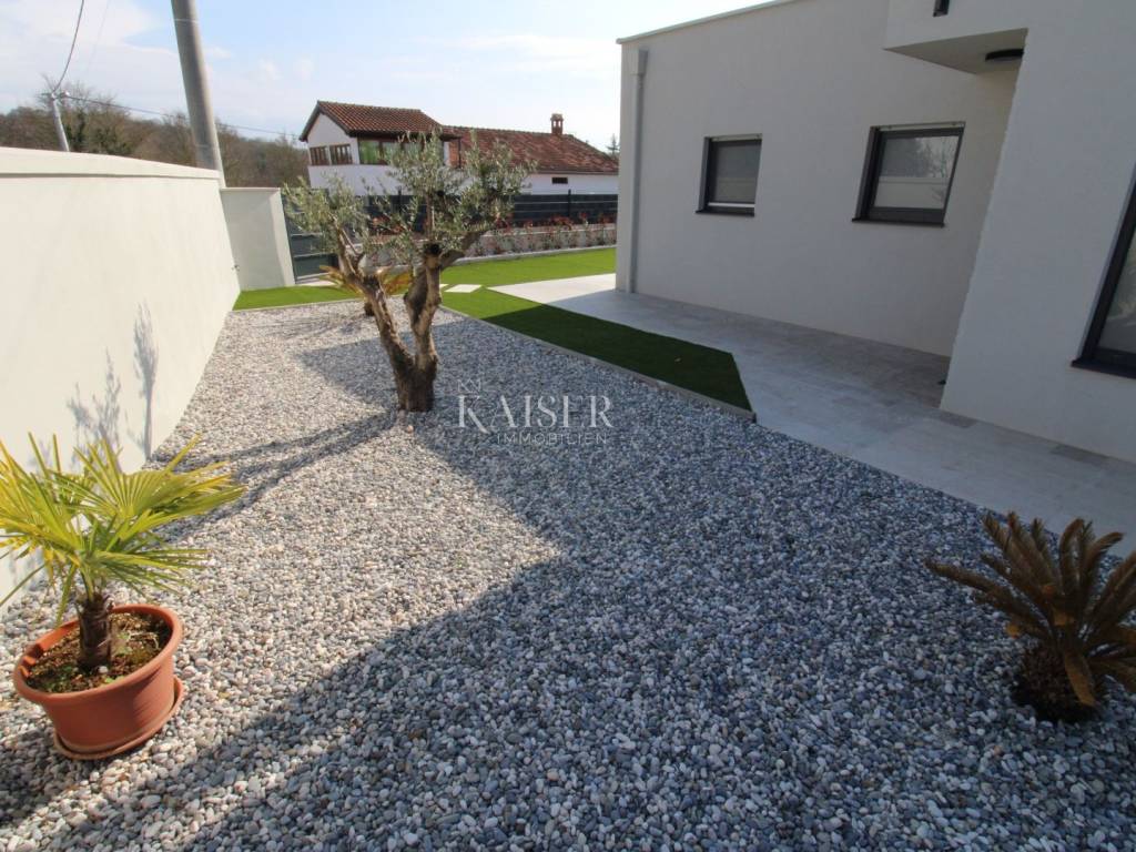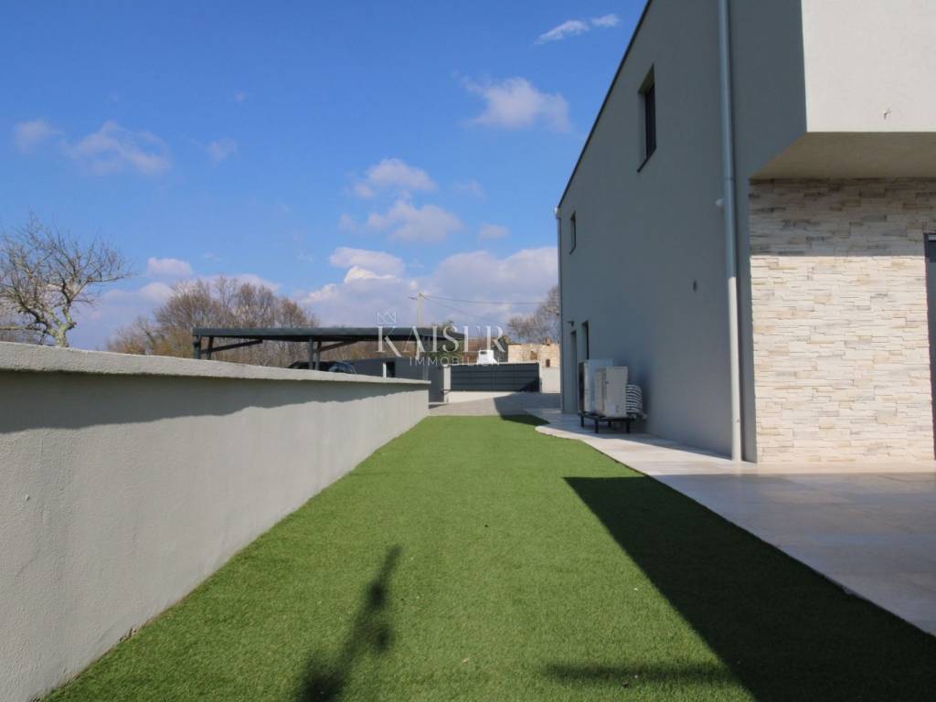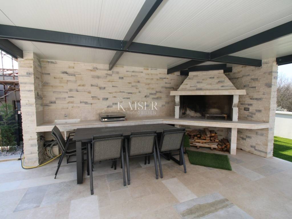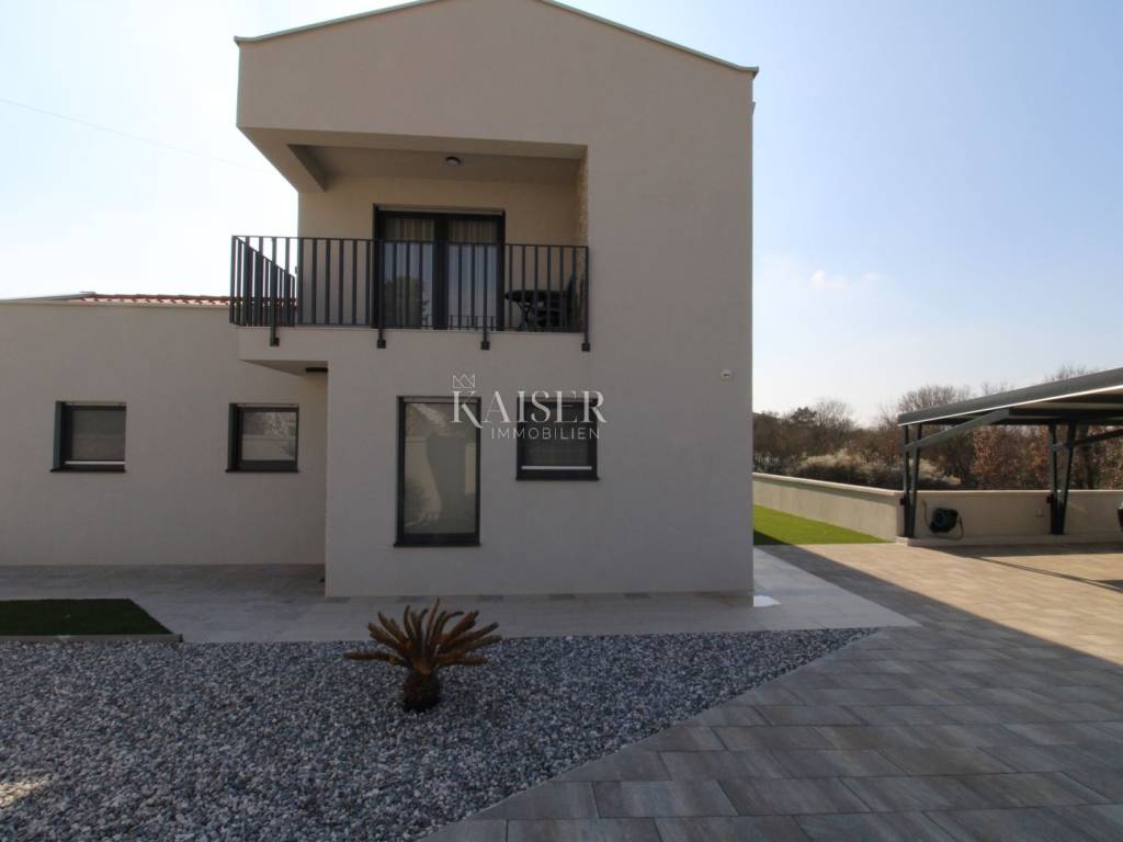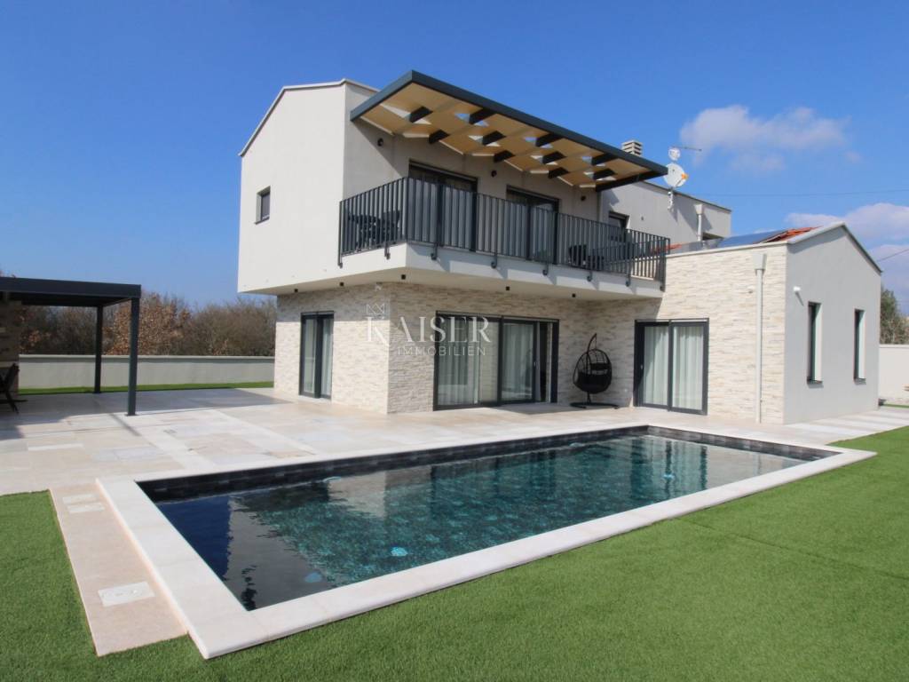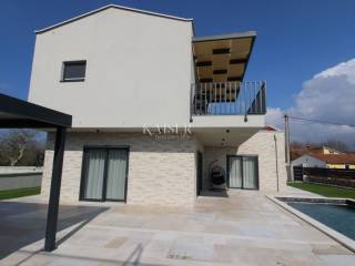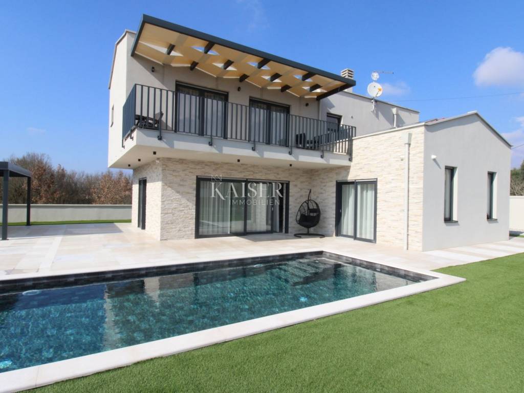 Kaiser Immobilien offers for sale an imposing villa on the west coast of Istria. The villa is located in a small indigenous village, only 14 km from the city of Poreč. All the most necessary facilities are located in the immediate vicinity of the villa, only 2 km from the villa. This beautiful property is only 3 km from the very famous Gulf of Istria, the Lim channel, which is widely known for its excellent shellfish farming and excellent fish restaurants. The property is located at the very edge of the settlement, no more construction will be done next to it, and it offers a wonderful view of nature that gives you warmth and peace. Due to its geographical location, this villa offers plenty of sun and wonderful light throughout the day. The villa consists of a ground floor and one floor. On the ground floor of the villa there is a spacious sunny living room, kitchen and dining room. What leaves an impression is the size and spaciousness of the open space effect of the living room, which offers the real pleasure of living. In the living room there is a modern wood-burning fireplace, lined with glass on the front, which will provide you with real pleasure and warmth in the winter months. The exit to the pool is connected through two balcony doors, of considerable size, which form two large glass walls. On the ground floor of the villa there is one bedroom with a bathroom, another additional bathroom and toilet for guests, and an area for washing and maintaining bed linen and laundry. This villa offers one specific feature, which is that the bedroom, bathroom and the entire lower part are very adaptable for people with disabilities. Considering the width of the passage and the flat surfaces, the space offers the possibility that a disabled person can easily move from the entrance to the interior of the house, if there is a need for it. Climbing upstairs, we pass through beautiful wooden stairs that connect us to the space upstairs. Upstairs we have three more bedrooms, each of which is connected with its own separate bathroom. Each bedroom is equipped in a special and different way, as are their bathrooms, so the space never seems monotonous or monotonous. All bedrooms have balcony access, and all balconies are covered, one is covered in pergola style. From the upper balconies there is a wonderful view of the pool, the village and the beautiful green nature in the distance. Each bedroom has a TV and air conditioning. Outside the villa there is a beautifully landscaped garden with a modern design, and a walkway that allows you to move around the property. On the outside, there is a machine room, that is, a technical room where there are swimming pool equipment, satellite program, video surveillance, antennas, and other technical systems. The engine room has its own separate entrance, in case you are not there, the technical inspection can be done without you. Outside the villa there is a covered outdoor kitchen with a gas grill. There is a table and 8 chairs in the outdoor summer kitchen. The area around the villa is paved and decorated with the addition of decorated parts with stones and decorative trees. The courtyard of the villa offers parking for 4 vehicles, two of which are covered. There is a charger for electric vehicles in the parking lot. In the courtyard there is a 20 m2 garden house for storing tools and other necessities. The main entrance to the yard is opened by remote control. On the roof there are solar panels for heating water and a boiler of 400 liters. The heating of the villa is underfloor heating via a heat pump. The villa has 17 collectors with electricity of 7.4 kw. The size of the pool is 9x4, it has built-in installations for the possibility of heating the pool if someone wants it. There are mosquito nets on all windows to protect against mosquitoes and possible insects in the summer. The blinds are electric. The villa has a water purifier to clean the water, so there is no scale on the sanitary ware and glasses. There is a possibility to park two more vehicles outside the villa. The villa is sold fully furnished with all appliances, dishes and furniture as shown in the pictures. Distance of the property to the city: Poreč - Pula Airport, 43 km Poreč - Ljubljana, 162 km Poreč - Vienna, 544 km Poreč - Prague, 868 km Poreč - Munich, 565 km If you are planning to start your new life in Istria or are looking for a property that to be used as a tourist rental, then this beautiful, very modern villa is just for you. Contact the agent at phone number 00385 923782803, or at the email address: ivana@kaiser-immobilien.hr and allow us to start your new life in Istria together with you. Agency commission is 3% + VAT.