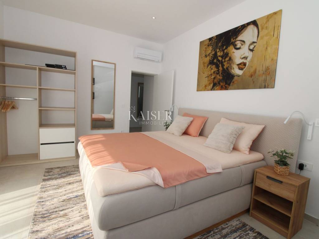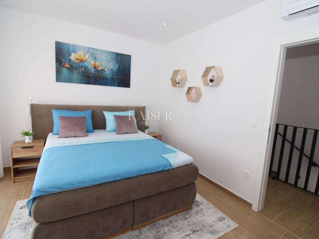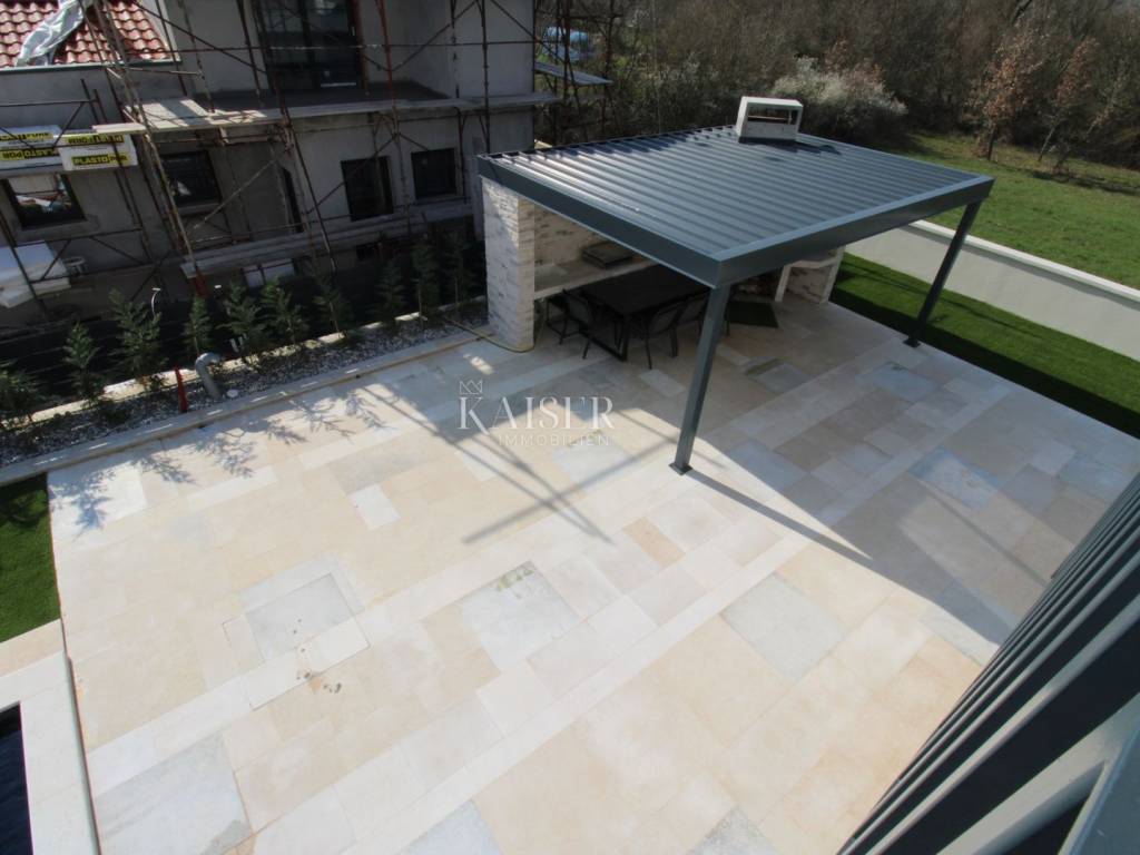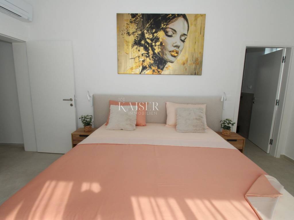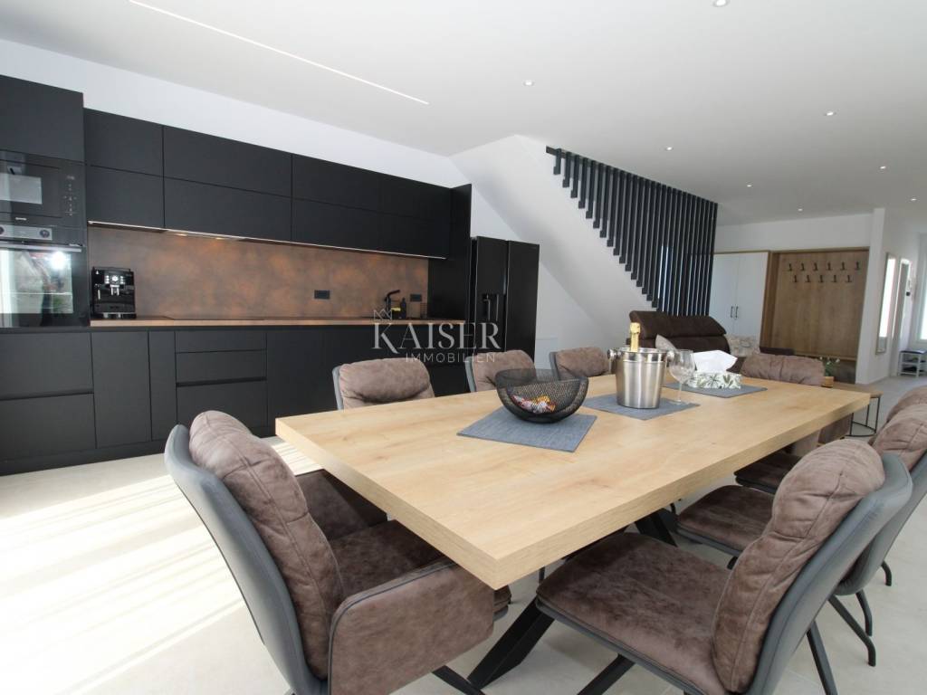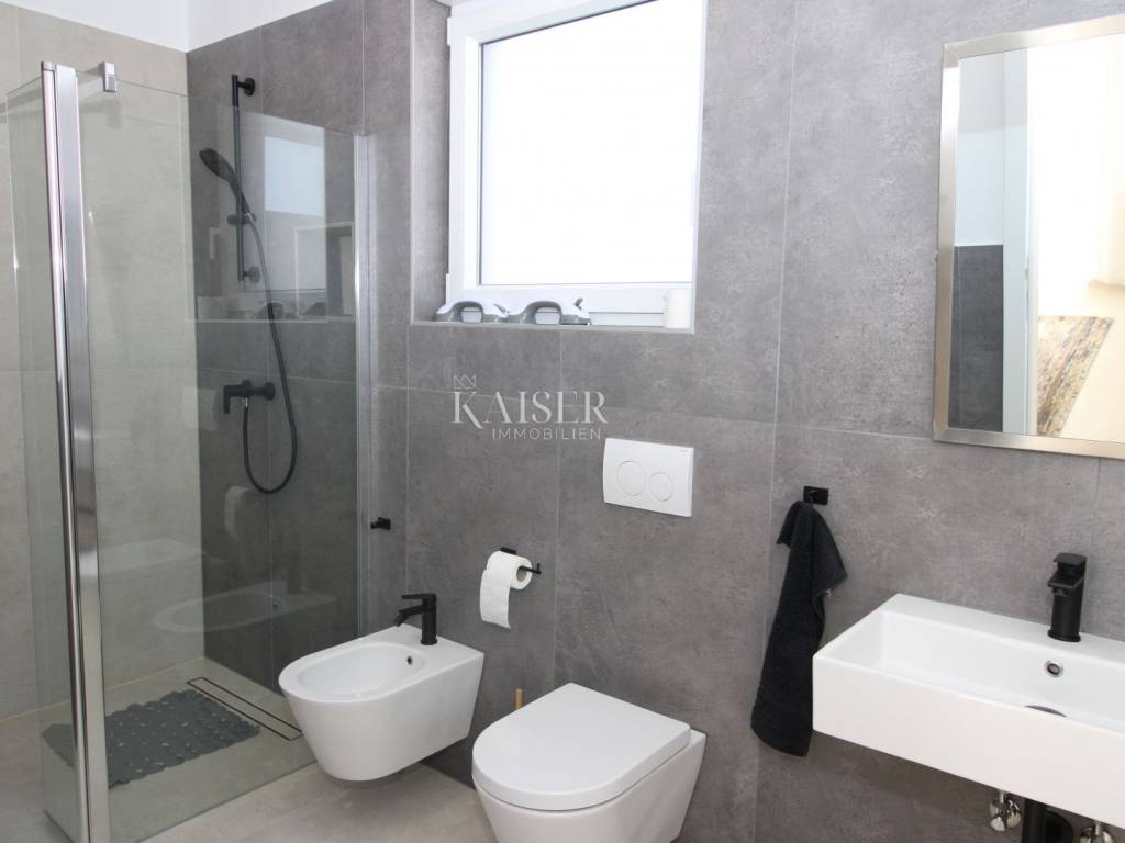 Kaiser Immobilien offers for sale an imposing villa on the west coast of Istria. The villa is located in a small indigenous village, only 14 km from the city of Poreč. All the most necessary facilities are located in the immediate vicinity of the villa, only 2 km from the villa. This beautiful property is only 3 km from the very famous Gulf of Istria, the Lim channel, which is widely known for its excellent shellfish farming and excellent fish restaurants. The property is located at the very edge of the settlement, no more construction will be done next to it, and it offers a wonderful view of nature that gives you warmth and peace. Due to its geographical location, this villa offers plenty of sun and wonderful light throughout the day. The villa consists of a ground floor and one floor. On the ground floor of the villa there is a spacious sunny living room, kitchen and dining room. What leaves an impression is the size and spaciousness of the open space effect of the living room, which offers the real pleasure of living. In the living room there is a modern wood-burning fireplace, lined with glass on the front, which will provide you with real pleasure and warmth in the winter months. The exit to the pool is connected through two balcony doors, of considerable size, which form two large glass walls. On the ground floor of the villa there is one bedroom with a bathroom, another additional bathroom and toilet for guests, and an area for washing and maintaining bed linen and laundry. This villa offers one specific feature, which is that the bedroom, bathroom and the entire lower part are very adaptable for people with disabilities. Considering the width of the passage and the flat surfaces, the space offers the possibility that a disabled person can easily move from the entrance to the interior of the house, if there is a need for it. Climbing upstairs, we pass through beautiful wooden stairs that connect us to the space upstairs. Upstairs we have three more bedrooms, each of which is connected with its own separate bathroom. Each bedroom is equipped in a special and different way, as are their bathrooms, so the space never seems monotonous or monotonous. All bedrooms have balcony access, and all balconies are covered, one is covered in pergola style. From the upper balconies there is a wonderful view of the pool, the village and the beautiful green nature in the distance. Each bedroom has a TV and air conditioning. Outside the villa there is a beautifully landscaped garden with a modern design, and a walkway that allows you to move around the property. On the outside, there is a machine room, that is, a technical room where there are swimming pool equipment, satellite program, video surveillance, antennas, and other technical systems. The engine room has its own separate entrance, in case you are not there, the technical inspection can be done without you. Outside the villa there is a covered outdoor kitchen with a gas grill. There is a table and 8 chairs in the outdoor summer kitchen. The area around the villa is paved and decorated with the addition of decorated parts with stones and decorative trees. The courtyard of the villa offers parking for 4 vehicles, two of which are covered. There is a charger for electric vehicles in the parking lot. In the courtyard there is a 20 m2 garden house for storing tools and other necessities. The main entrance to the yard is opened by remote control. On the roof there are solar panels for heating water and a boiler of 400 liters. The heating of the villa is underfloor heating via a heat pump. The villa has 17 collectors with electricity of 7.4 kw. The size of the pool is 9x4, it has built-in installations for the possibility of heating the pool if someone wants it. There are mosquito nets on all windows to protect against mosquitoes and possible insects in the summer. The blinds are electric. The villa has a water purifier to clean the water, so there is no scale on the sanitary ware and glasses. There is a possibility to park two more vehicles outside the villa. The villa is sold fully furnished with all appliances, dishes and furniture as shown in the pictures. Distance of the property to the city: Poreč - Pula Airport, 43 km Poreč - Ljubljana, 162 km Poreč - Vienna, 544 km Poreč - Prague, 868 km Poreč - Munich, 565 km If you are planning to start your new life in Istria or are looking for a property that to be used as a tourist rental, then this beautiful, very modern villa is just for you. Contact the agent at phone number 00385 923782803, or at the email address: ivana@kaiser-immobilien.hr and allow us to start your new life in Istria together with you. Agency commission is 3% + VAT.
